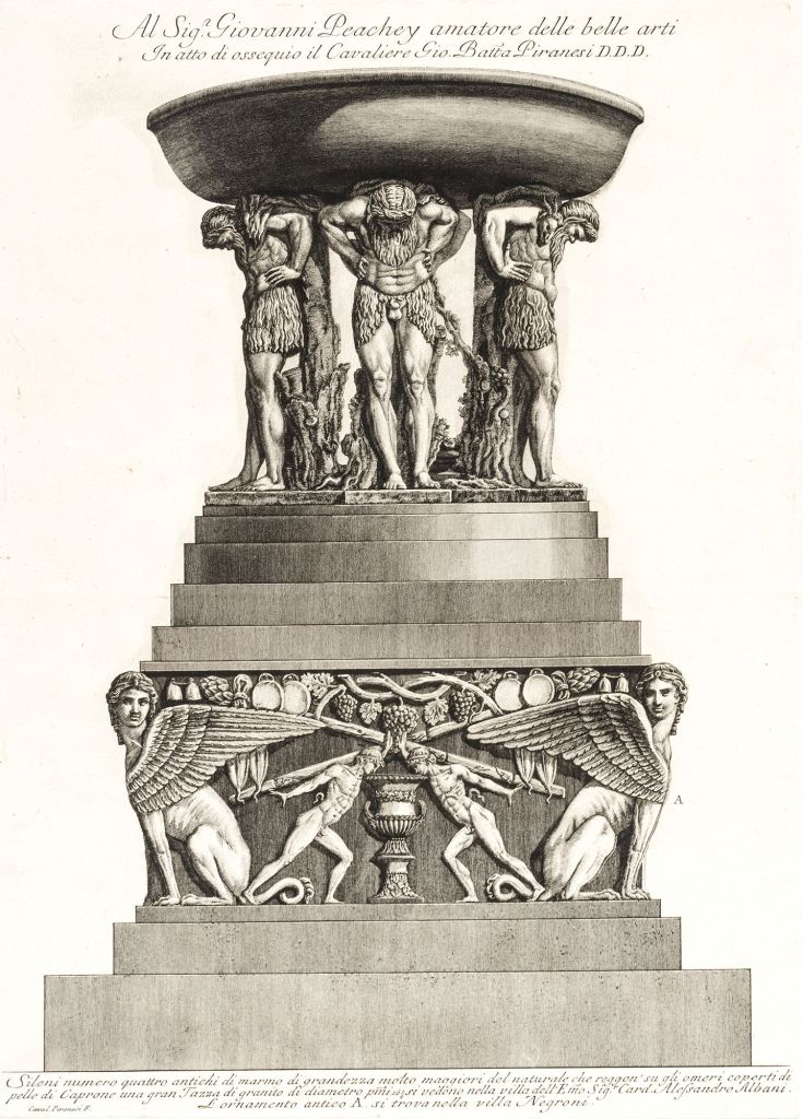 Before entering the Louvre in 1803, the Sileni Albani were the support of an Egyptian granite basin, the whole of which formed a famous fountain in the Villa Albani in Rome, immortalised by Piranesi in an engraving (fig. 1) entitled Sileni numero quattro antichi di marmo di grandezza molto maggiori del naturale..., dated 1778.