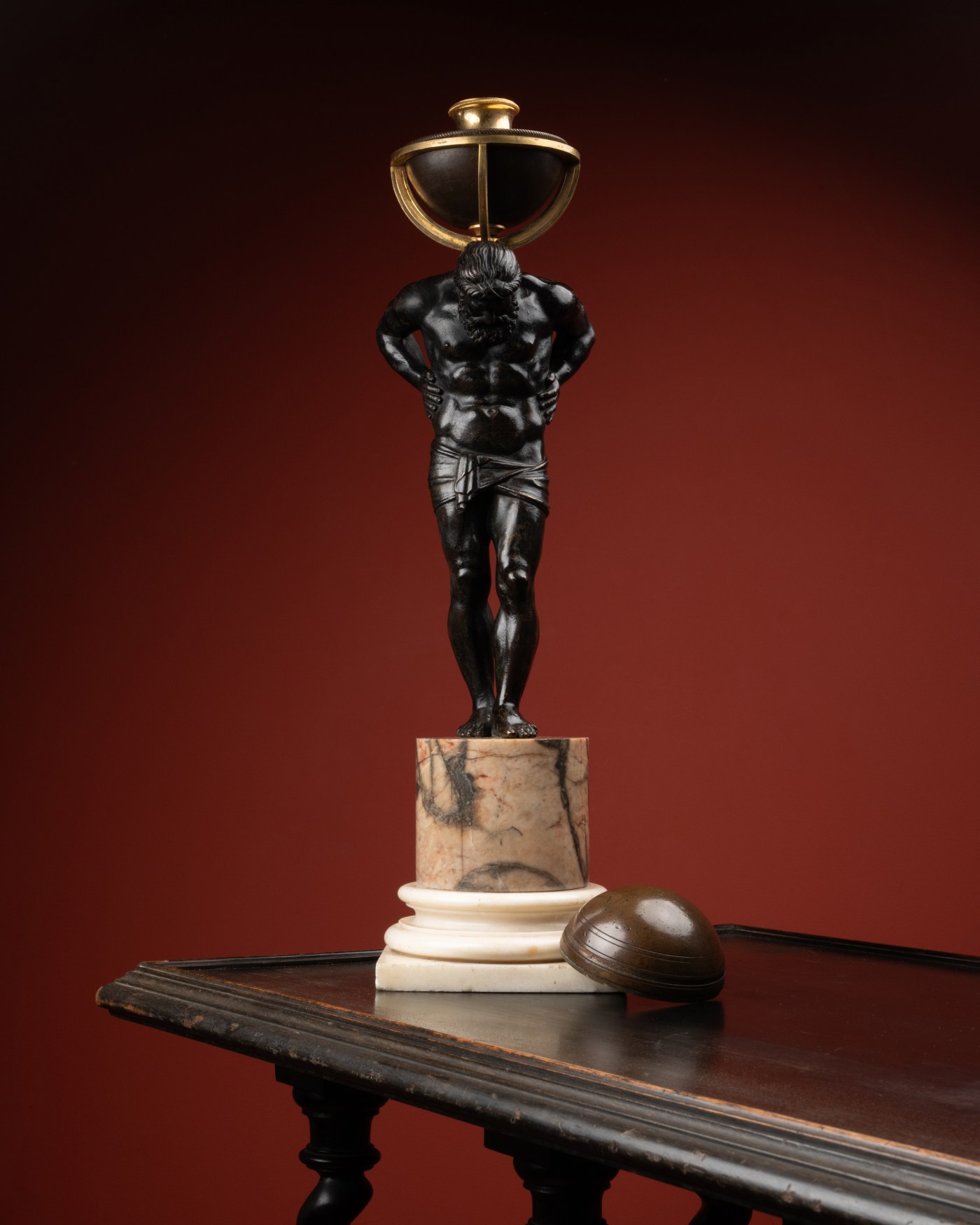 Antique bronze sculpture of an Atlas, set with a Louis XVI-period armillary sphere forming a candlestick, in keeping with a trend inaugurated by Severo da Ravenna at the end of the 15th century.