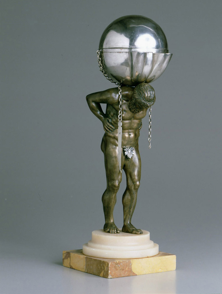 These variations in nudity lead us to compare our Atlas to an strikingly similar work (fig. 3), held at the Palazzo Mosca in Pesaro. This is a late 18th-century Atlas, that used to be nude, which chasing is not of the highest quality. This seems to be the reason for which it is now attributed to an anonymous Roman workshop, after having been first attributed to Luigi Valadier. Luigi Valadier had in fact produced, in or after 1767, a reduction of the Villa Albani fountain for the Bailli de Breteuil's first deser — Valadier’s Silènes Albani are nude. But the Atlas in Pesaro was also covered with a vine leaf in silver, that could obviously not have been part of the bronze cast.