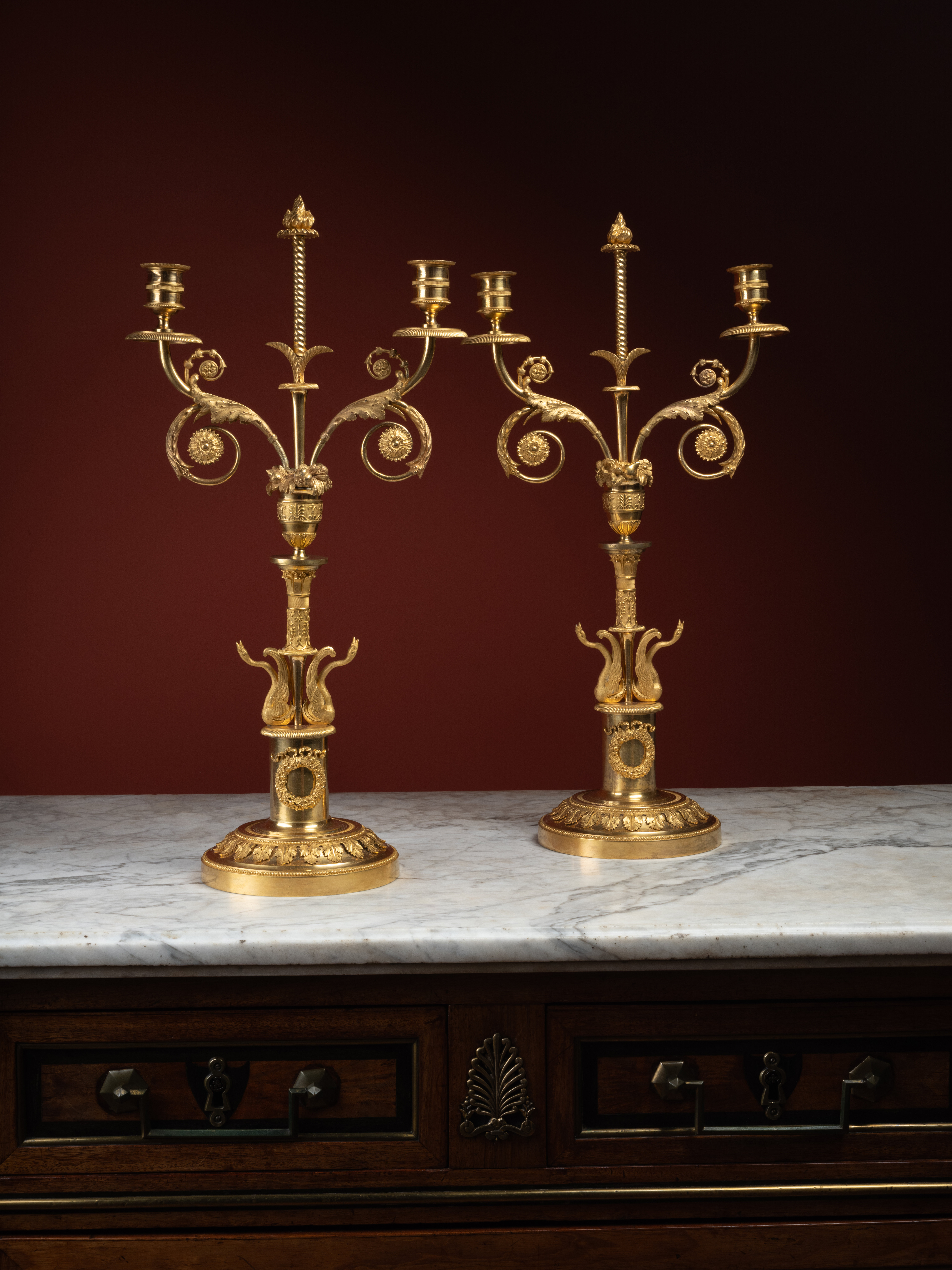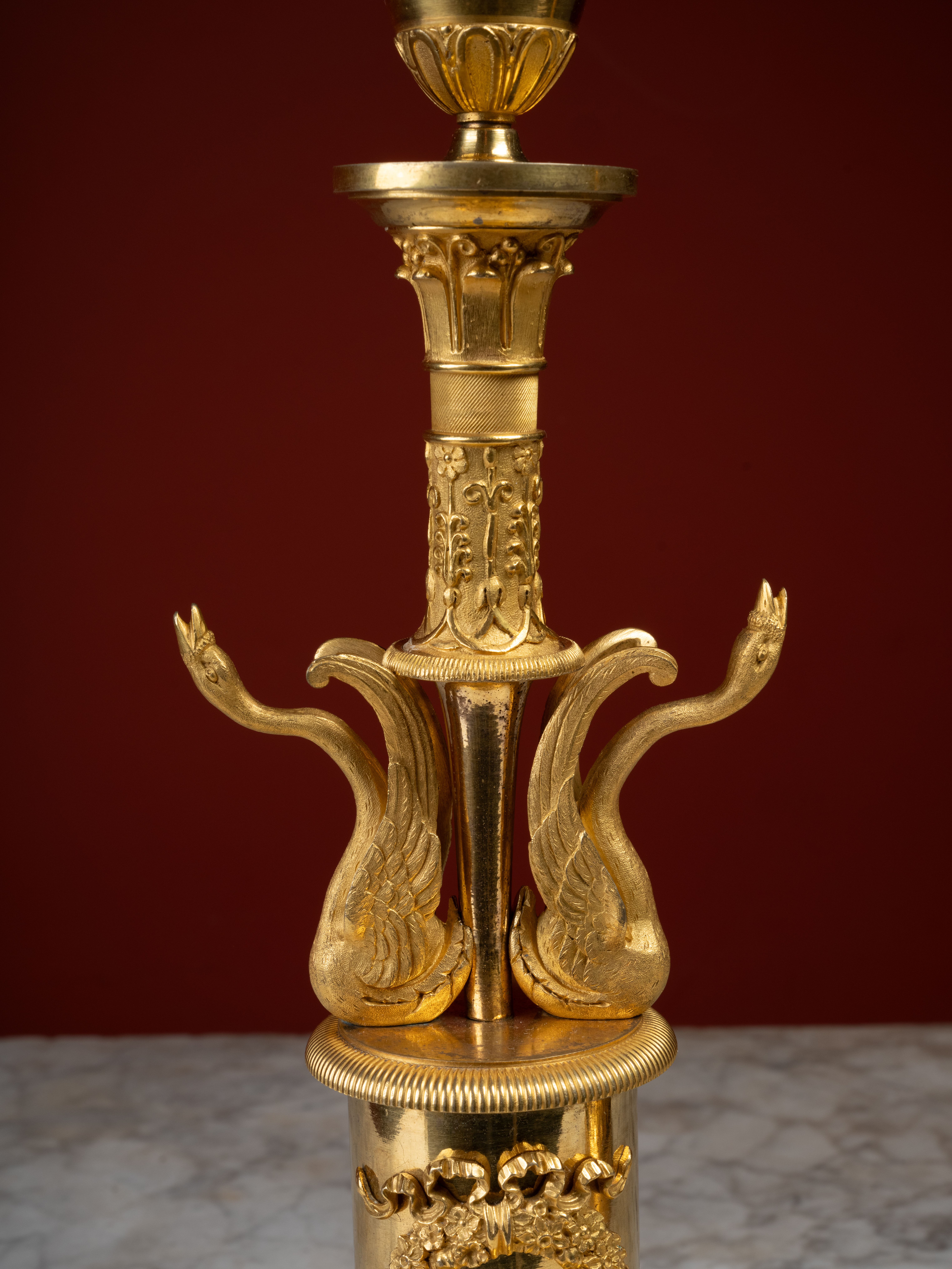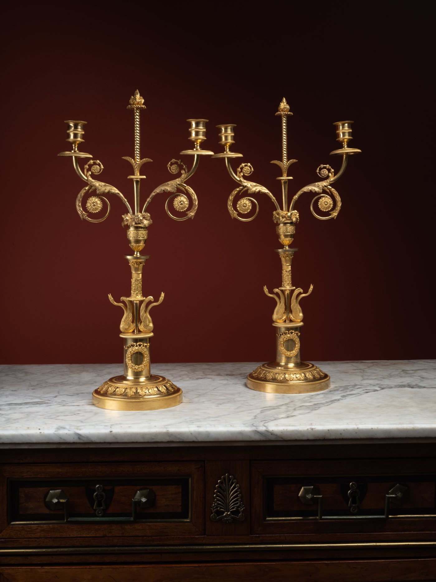 This quality, at the verge of goldsmithing, is evident in the chiseling of these candelabra, particularly in the wings of the swans, whose iconography dominates both French decorative arts under the Empire and those of Imperial Russia. Notable too, the finely modeled and matte-finished acanthus leaves, mounted to, and not cast with, the candelabra’s base. Other elements, such as the ribboned flower wreaths, mounted too, along with the scrolling light arms decorated with acanthus leaves, and the flower and fruit vases, further align these candelabra with the productions of the Saint Petersburg manufactory, the most prestigious works of which had been designed by Italian artists invited to Russia, such as architects Carlo Rossi and Giacomo Quarenghi.