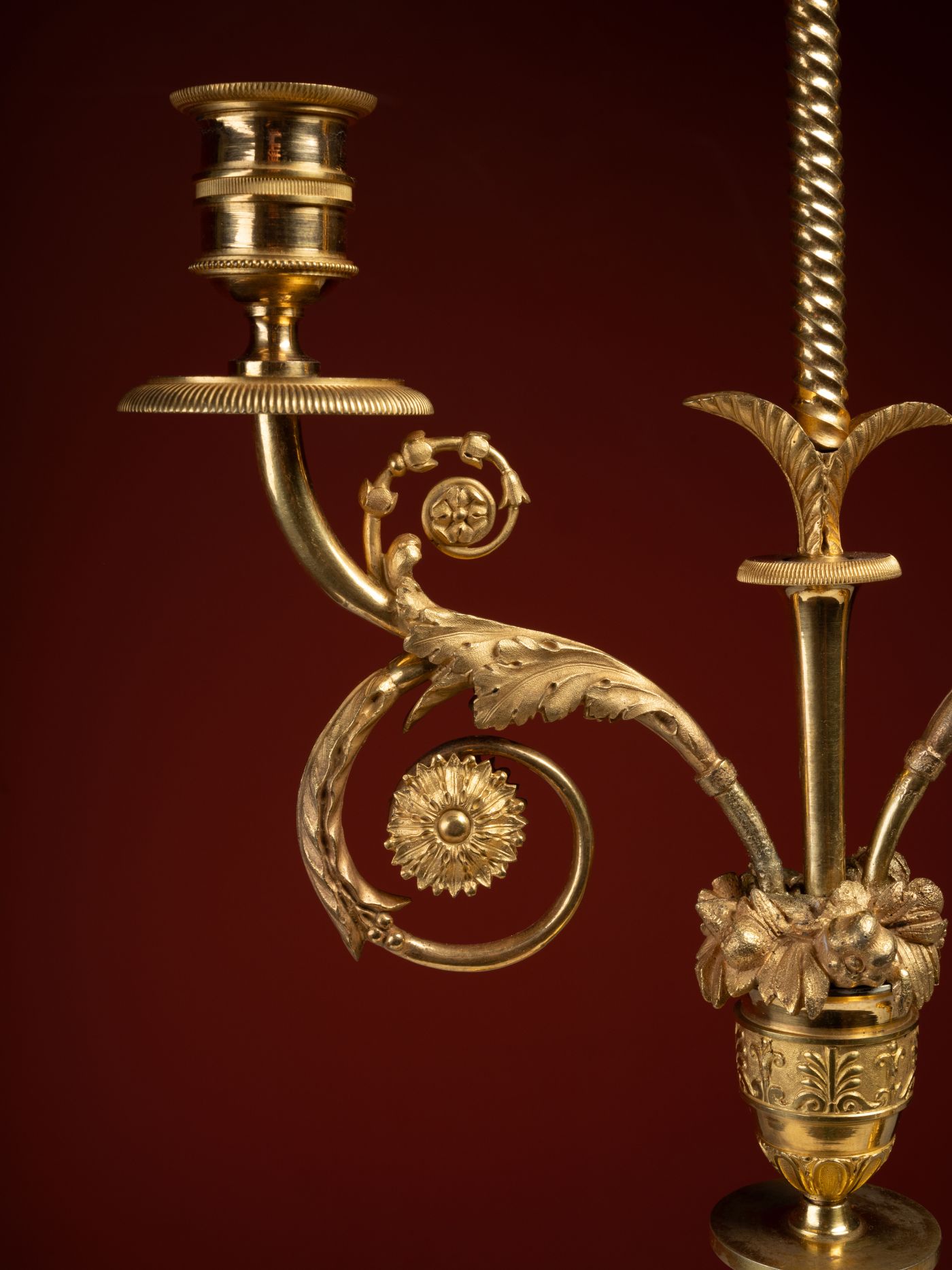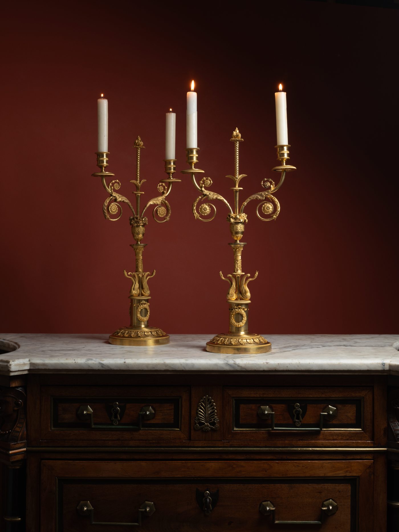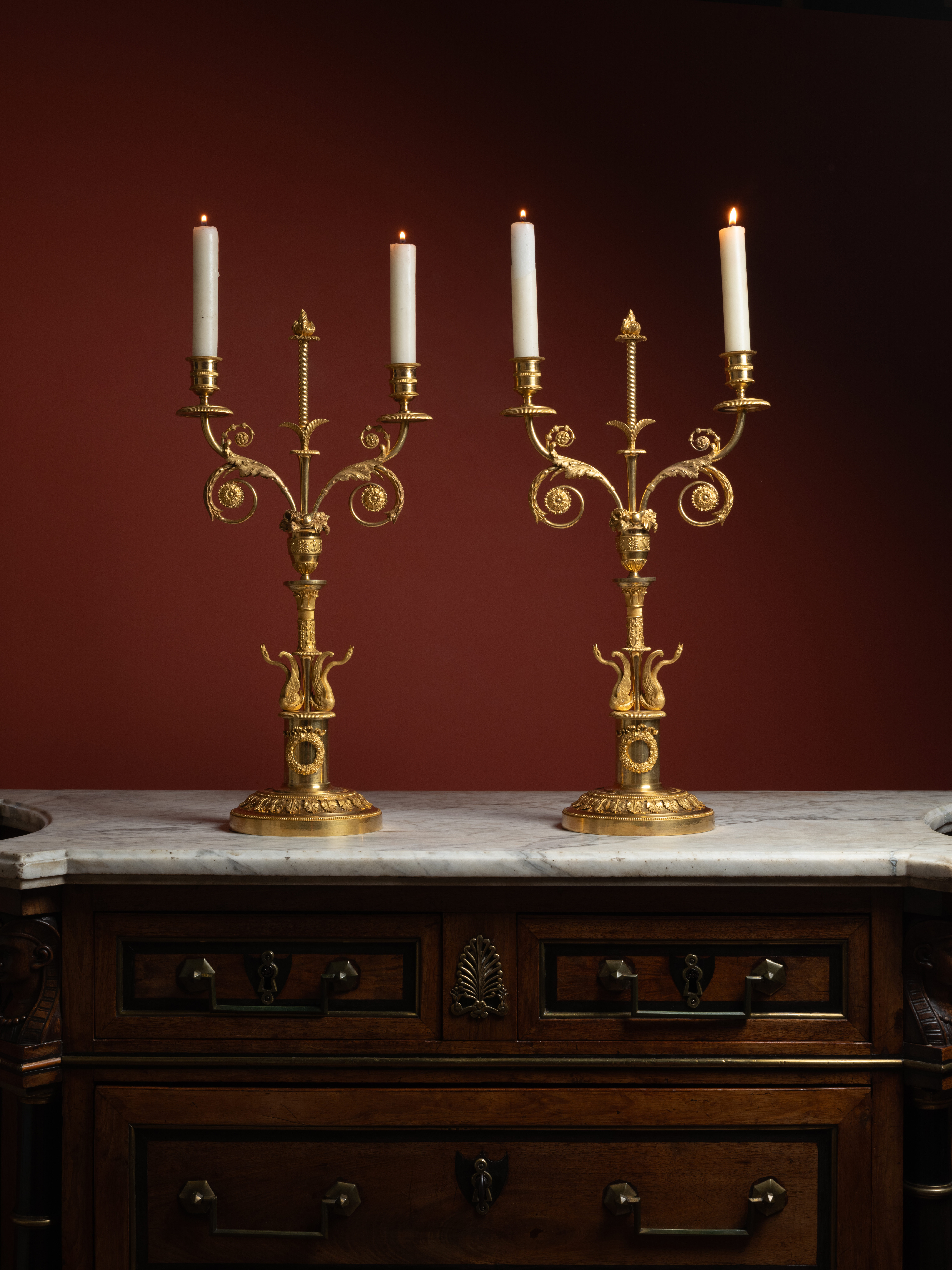 This quality, at the verge of goldsmithing, is evident in the chiseling of these candelabra, particularly in the wings of the swans, whose iconography dominates both French decorative arts under the Empire and those of Imperial Russia. Notable too, the finely modeled and matte-finished acanthus leaves, mounted to, and not cast with, the candelabra’s base. Other elements, such as the ribboned flower wreaths, mounted too, along with the scrolling light arms decorated with acanthus leaves, and the flower and fruit vases, further align these candelabra with the productions of the Saint Petersburg manufactory, the most prestigious works of which had been designed by Italian artists invited to Russia, such as architects Carlo Rossi and Giacomo Quarenghi.