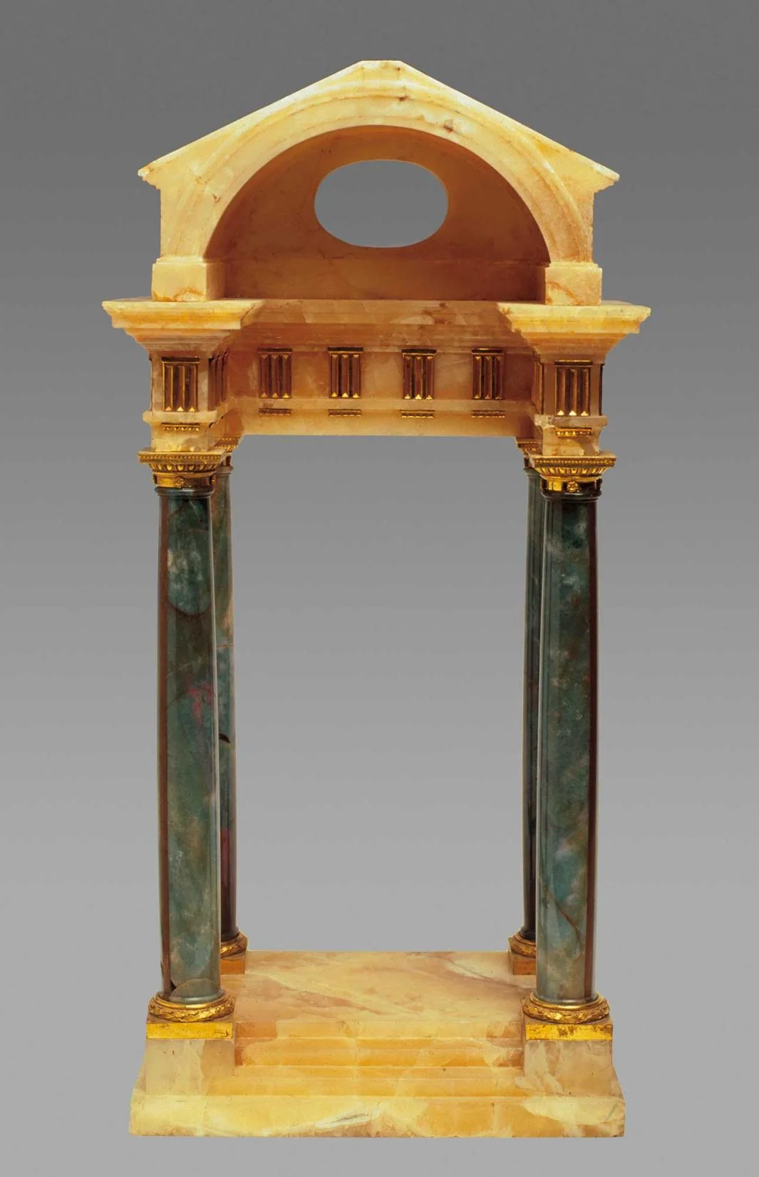 When it comes to the choice of stones, however, out tempietto is closer to a pair of exedras designed by Luigi Valadier for the second deser of the bailiff of Breteuil, which was purchased by the King Charles IV of Spain and is now on display at the Palacio Real in Madrid. The columns, carved in the same alabaster, have the same entasis ; and these exedras, 33 cm high, according to the catalogue of the exhibition Luigi Valadier : Splendor in Eighteenth-Century Rome, are exactly as tall, at the cornice, as our tempietto.