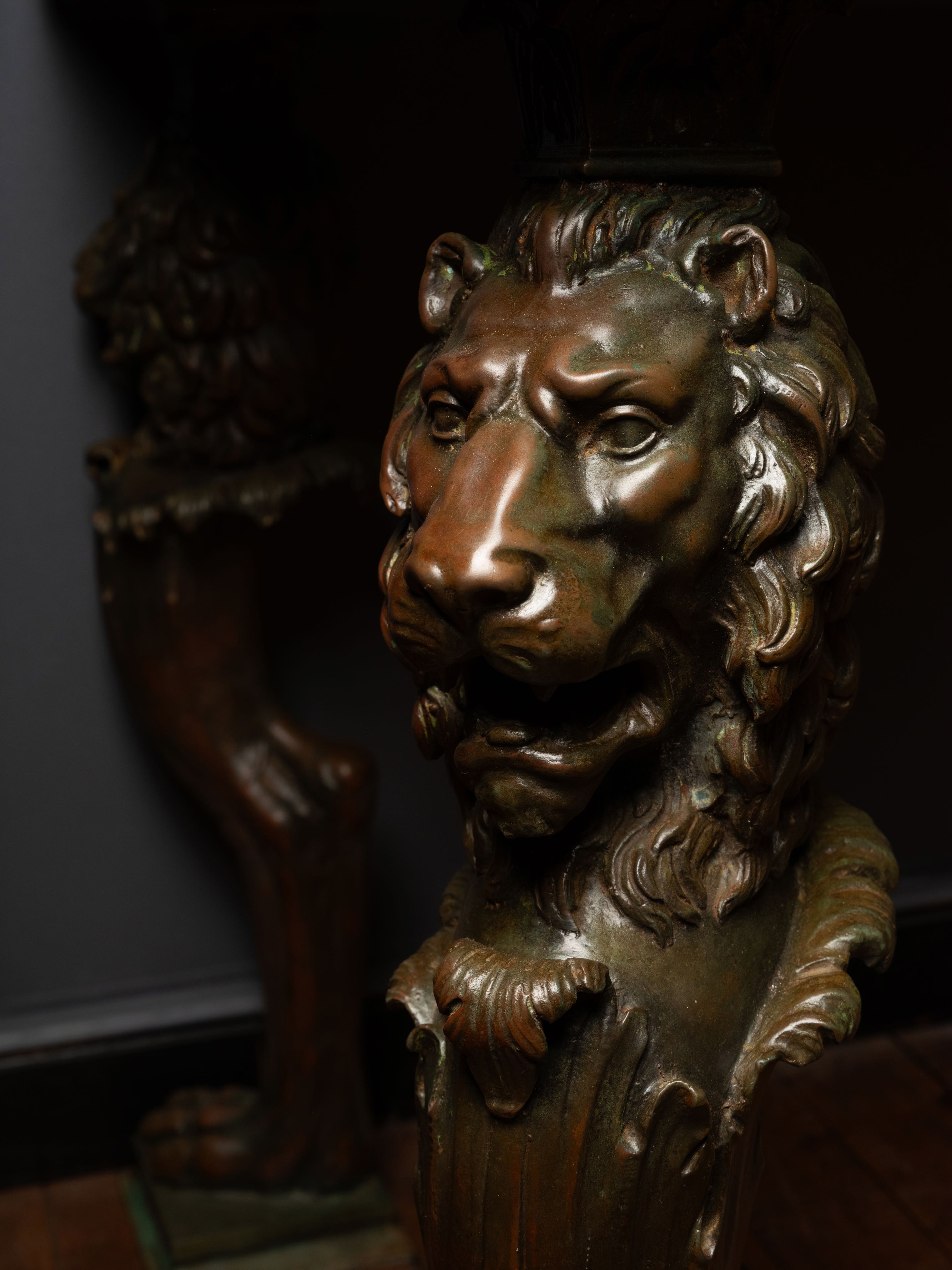 The mensa vasaria with winged lion protomes, found behind the impluvium of the domus Cornelia, the house of Cornelius Rufus at Pompeii, is among the finest examples of the type. The bronze base of the present table, however, replicates the trapezophoroi of yet another antique model, a tripod held in the Naples Archaeological Museum, whose expressive, shaggy lion heads spring from a powerful paw, the skin of which curls away in a pattern reminiscent of the acanthus leaf. This tripod — itself a mensa vasaria, and one of the finest of its kind, according to Overbeck — was likewise discovered at Pompeii, this time in the triclinium of the Haus des kleinen Mosaikbrunnens, the Casa degli Scienziati, excavated between 1839 and 1845. The casting of this base is almost certainly Italian work of the late nineteenth or early twentieth century; it reproduces the antique faithfully, though with a slight elongation in height.