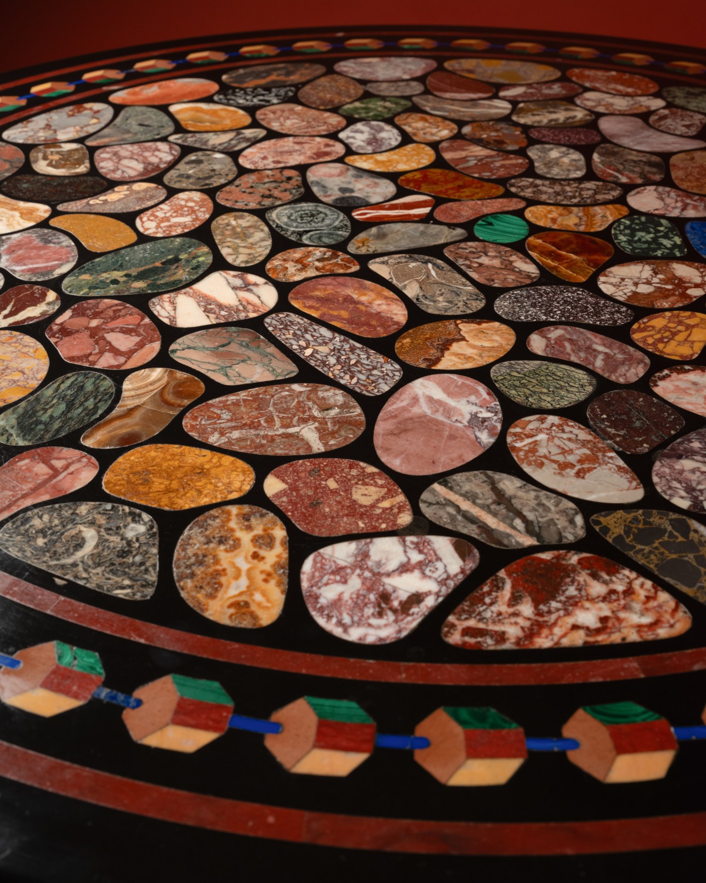 This gueridon is composed of a significant top of samples of marbles from Italy, France, Anatolia, and Africa, some bearing the mark of a fossil, breccias from numerous massifs, granites and diorites, including a rare orbicular diorite, porphyries from Greece, Trento and Egypt, alabasters, lumachelles, jaspers, malachites, lapis and chalcedonies, bordered by a gallery of hexagonal prisms in malachite, rosso, and giallo as well as a beige marble, linked together by a cord of lapis lazuli, all resting on an important base entirely in patinated and gilt bronze, with bun feet, the stretcher adorned with a rosette in patinated bronze and a pine cone in gilt bronze.