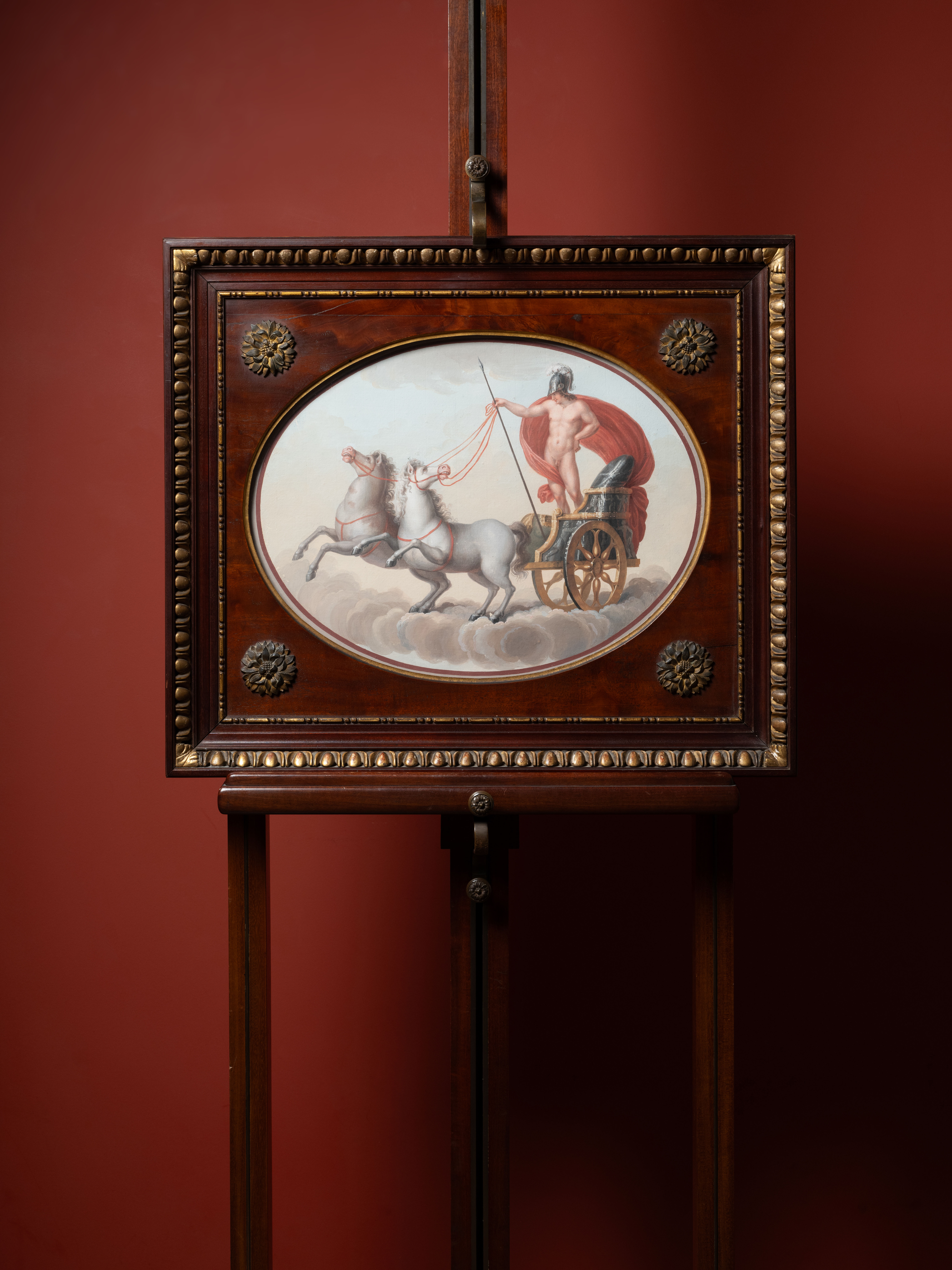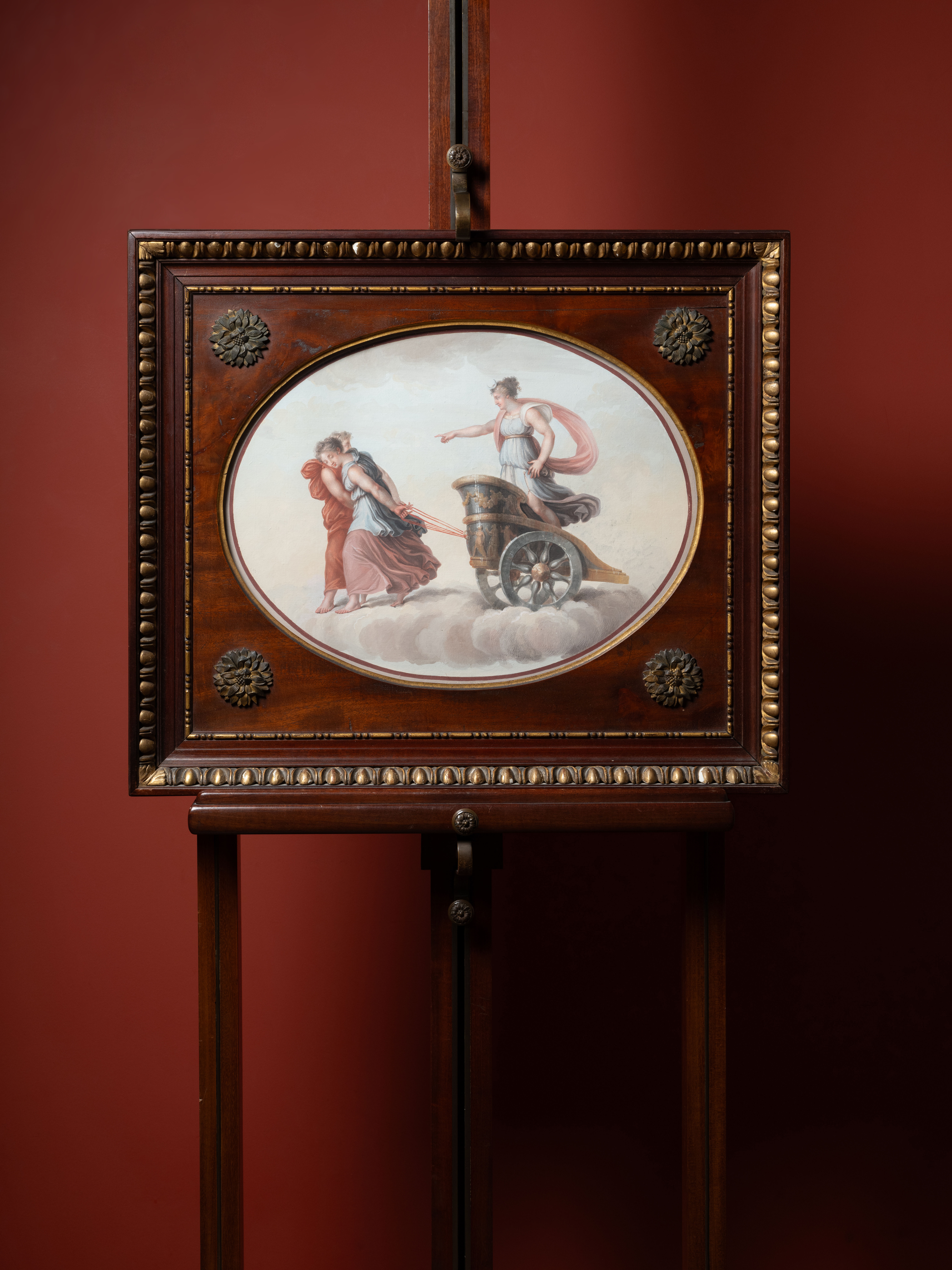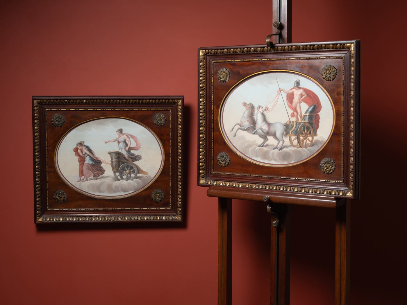 Each of these gouaches is framed with a superb Empire-period mahogany frame, finely sculpted with friezes of ovals and darts and adorned with sculpted and gilded rosettes applied at the corners.