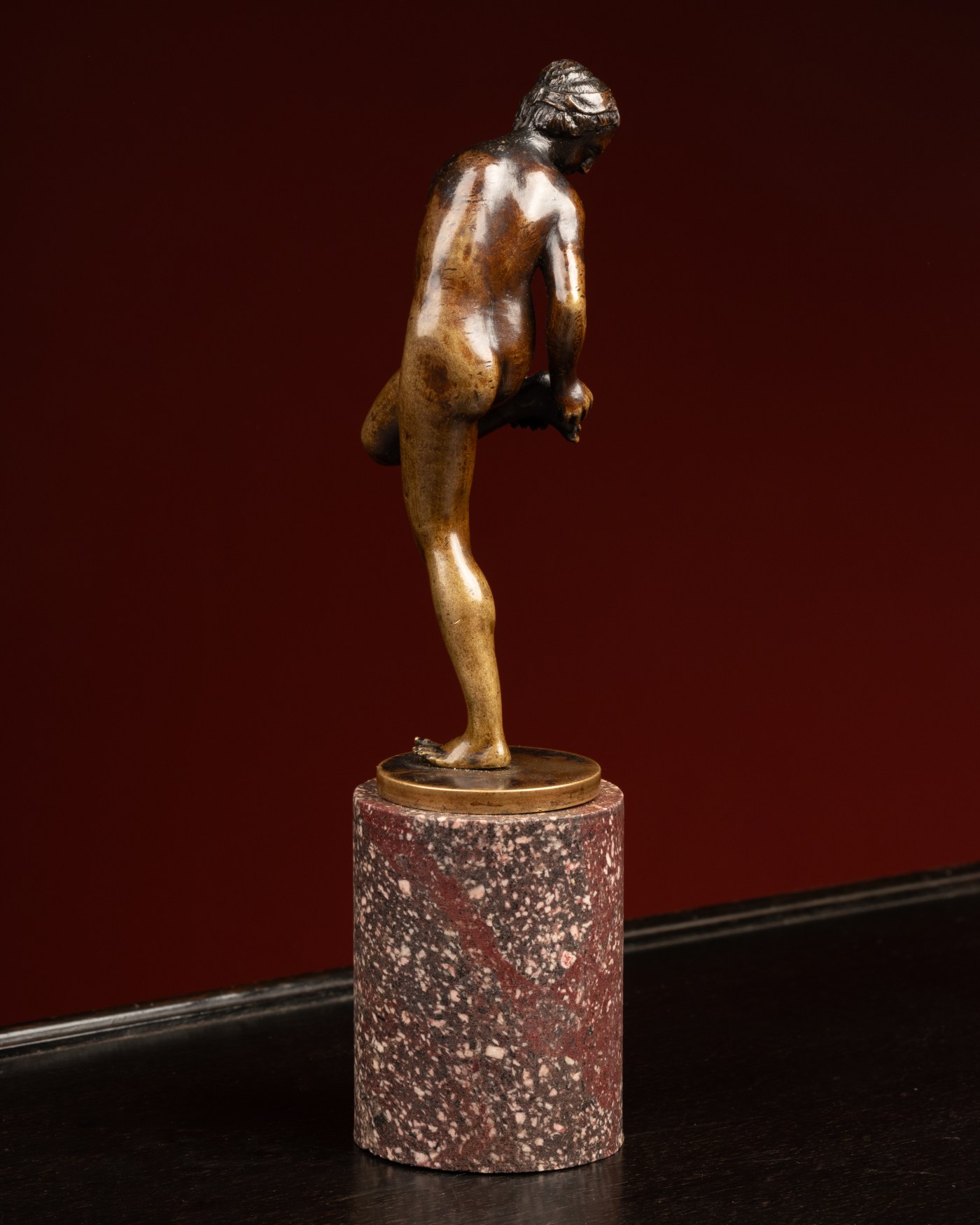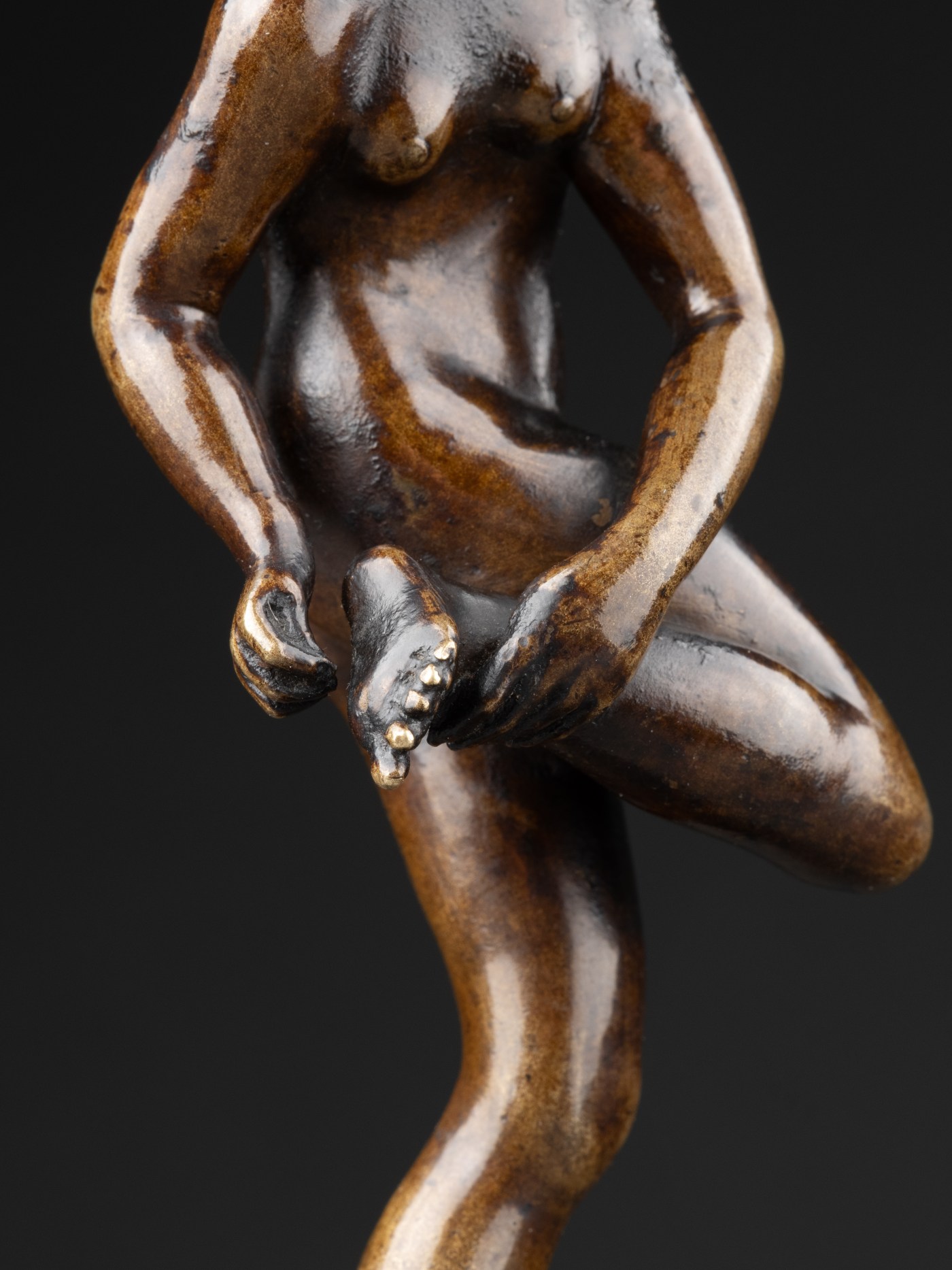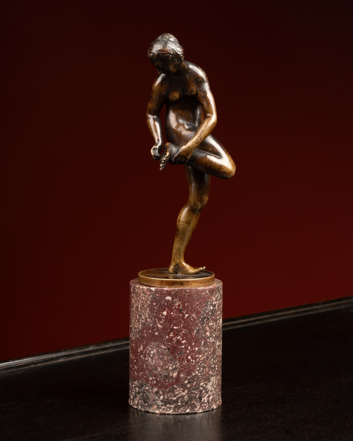 The posture of this statuette is a variation of the figure nude, standing and turning back, about to cleanse the right foot which she has put on a three-sided socle, identified as a Bathing girl or Bather and attributed to Giambologna by Wilhelm von Bode in Alfred Beit’s collections (Wilhelm von Bode, The Art Collection of Mr. Alfred Beit at his residence, Park Lane, London, London, p. 62), then Otto Beit’s, where this time the bather is said to be ‘about to remove a thorn from her foot’ (Wilhelm von Bode, Catalogue of the Collection of Pictures and Bronzes in the Possession of Mr. Otto Beit, London, 1913, p. 106).