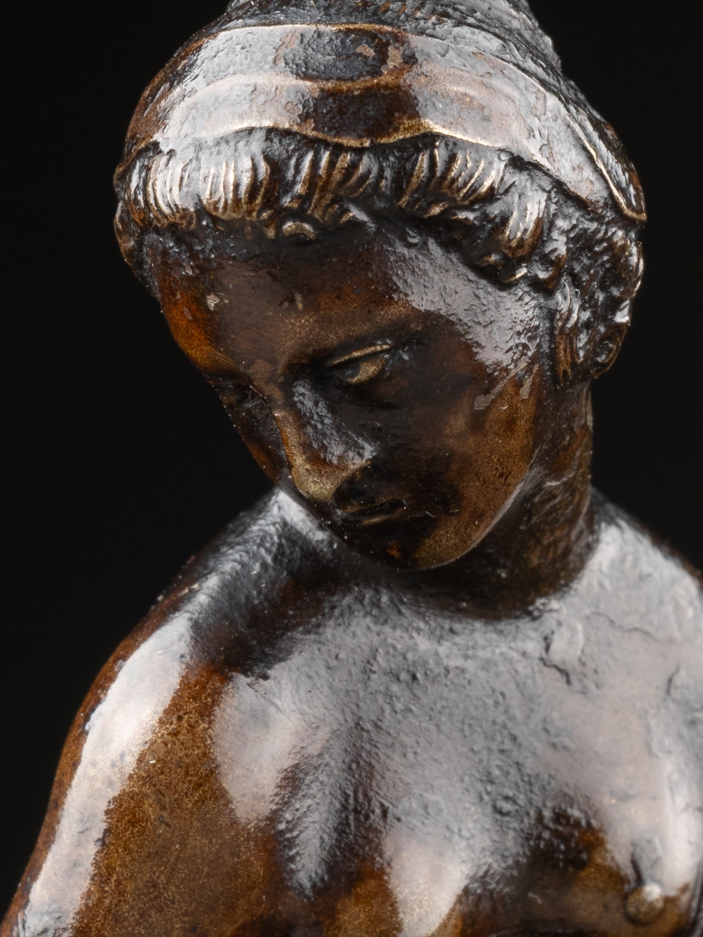 All these variations on the Bathing Girl, ours as well as that of the Ashmolean, the Metropolitan, that of the Beaux-Arts de Dijon, and yet another one, less refined than the rest and which must likely be somewhat remote from Giambologna, now held at the Victoria & Albert Museum. All of those share a characteristic crease between the right arm and breast of the Bathing Girl.