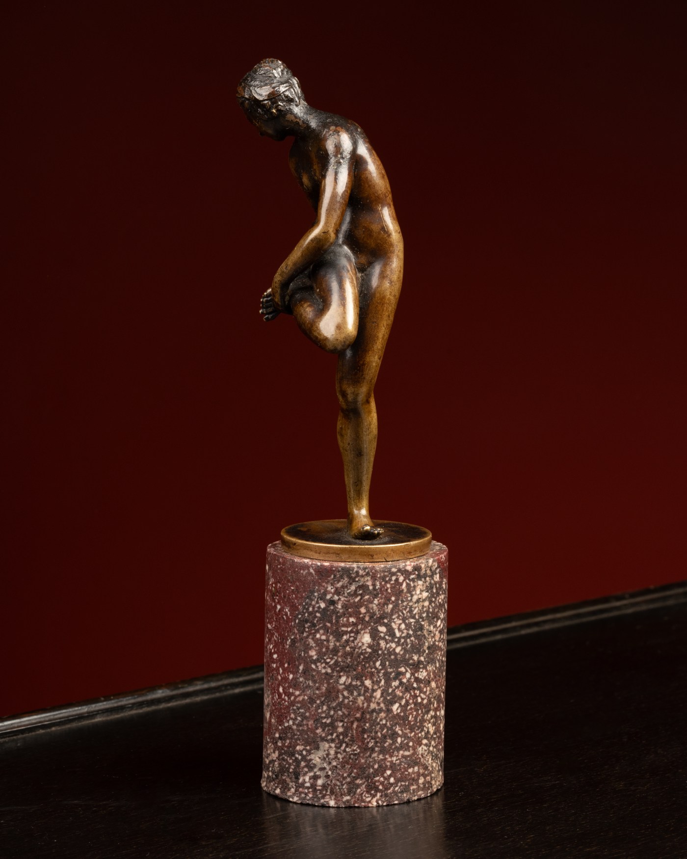 There are, however, versions on the same model anterior to the addition of a Cupid by a follower of Giambologna or by Antonio Susini. This is already the case, of course, of the bronze identified by Bode in the collections of Alfred and then Otto Beit, but it is also true of a Bathing Girl, with knee on stool mentioned by Charles Avery and Anthony Radcliffe : a version even more rare, held at the Musée des Beaux-Arts de Dijon when Avery and Radcliffe’s book was written. This version still differs from ours in that the right foot rests once again on a tripod ; but the modeling of the face, compared with that in the Metropolitan and in the Ashmolean, brings the Dijon Bathing Girl and our own very close to one another.