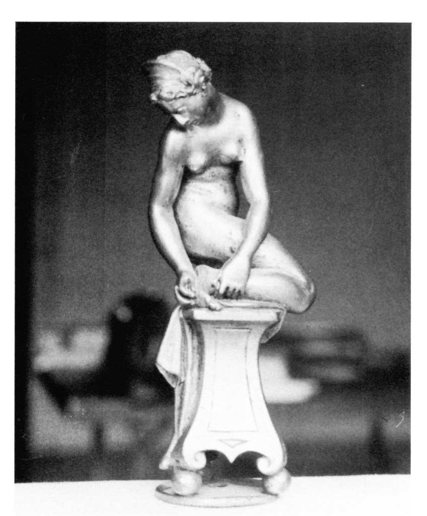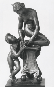 Of this Giambologna’s Bathing Girl, described by Bode himself as ‘frequently met with’ (ibid.), several versions are known : one in the Metropolitan Museum, of which ‘the model is not known’ (Charles Avery and Anthony Radcliffe, Giambologna. Sculptor to the Medici, London, 1978, p. 67), attributed to Antonio Susini. Here, the Bathing Girl, turned into a Venus, has Cupid next to her : according to Charles Avery and Anthony Radcliffe, this change seems to be Antonio Susini’s addition.