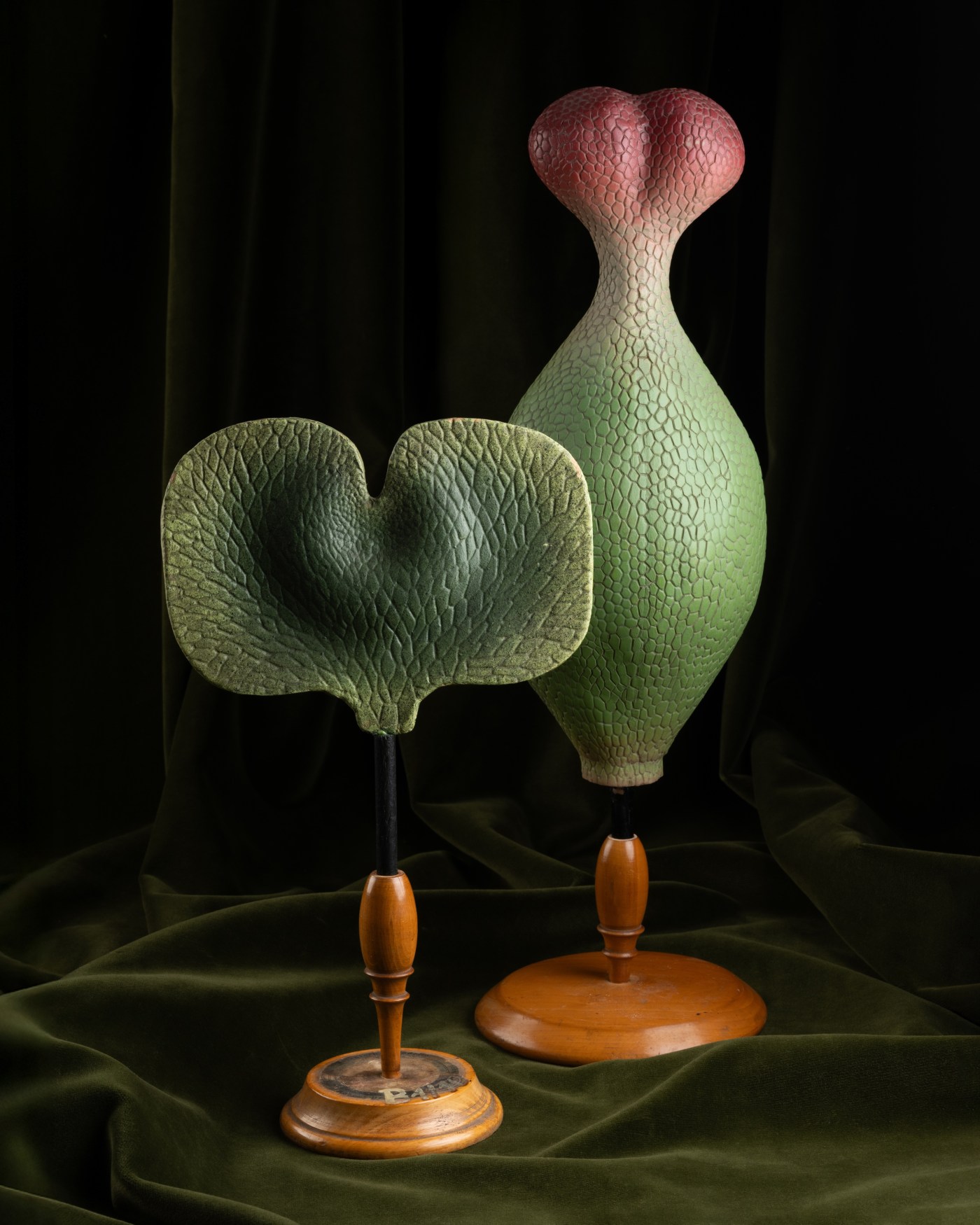The two Brendel models date back from the very first series designed by Robert Brendel starting in 1866 in Breslau. Recognisable by their varnished sculpted bases characteristic of the firm's earliest models, they represent the prothalli — reproductive structures — of two fern varieties, Pteris serrulata and Aspidium filix-mas. The third model represents a section of an angiosperm pistil. It is of more recent conception and can be attributed to the firm Phywe Aktiengesellschaft which, after purchasing the rights and patterns of the Brendel collection following the latter's cessation of activity, continued to produce botanical models based on Brendel's designs in the immediate post-war period.