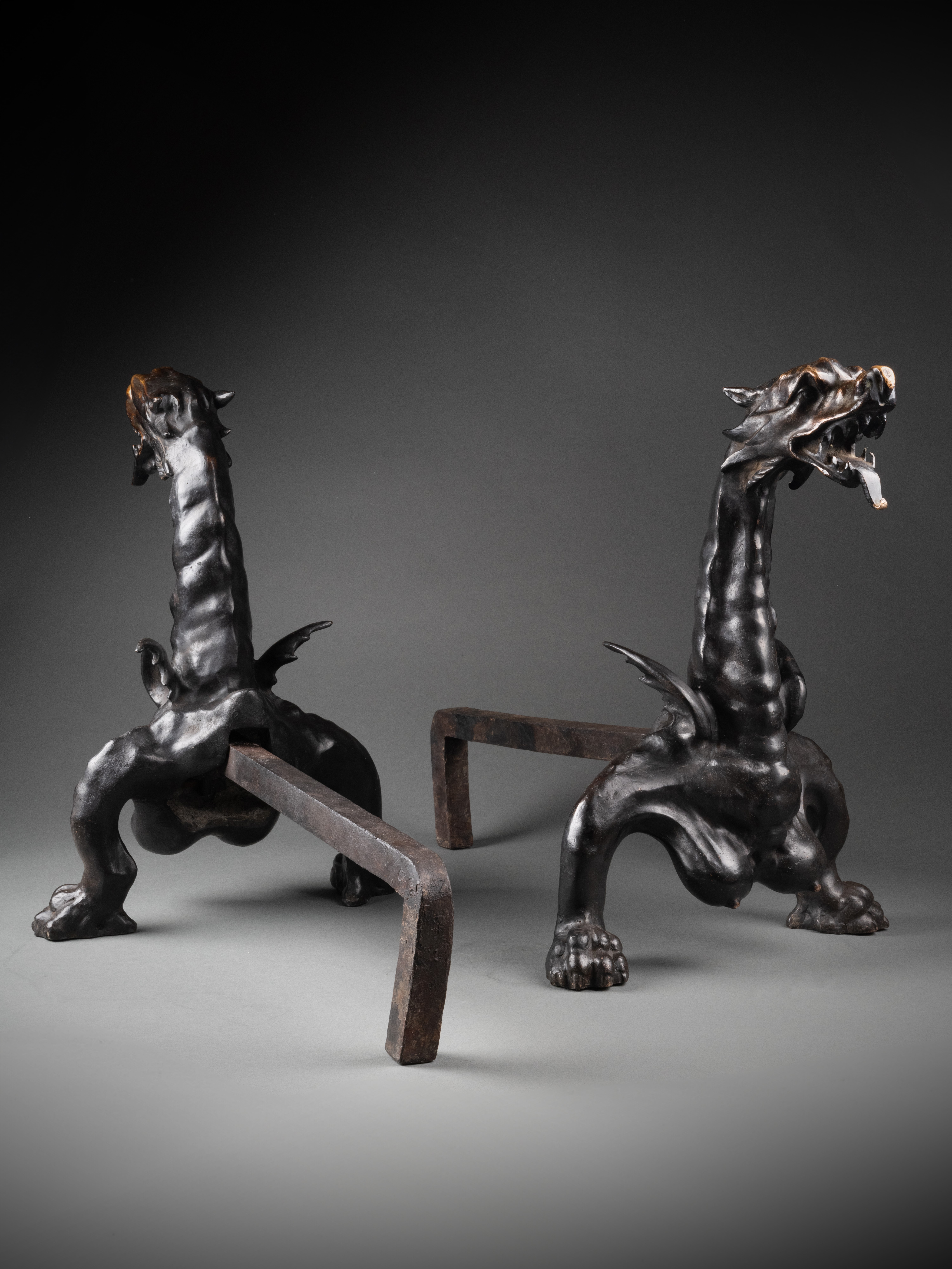 Thus, this pair of firedogs belongs, both technically and stylistically, to the fantastical Italian bestiary of the 16th and 17th centuries. They are among the famous bronze dragons of the great sculptors of the Cinquecento and Seicento: such as Severo de Ravenna's at the Museo Correr in Venice or those of the firedogs with dragons at the Victoria & Albert Museum, attributed to Giuseppe de Levis. These drakaina firedogs can also be compared to a bronze dragon exhibited at the Metropolitan Museum of Art in New York and attributed to the founder Giacomo Laurenziani. James Draper, then curator of European sculptures at the Metropolitan, compares the head of this dragon to the bronzes of the Fountain of the Dragons in the Apostolic Palace of Loreto, which are by the hand of the sculptors Tarquinio and Pietro Paolo Iacometti.