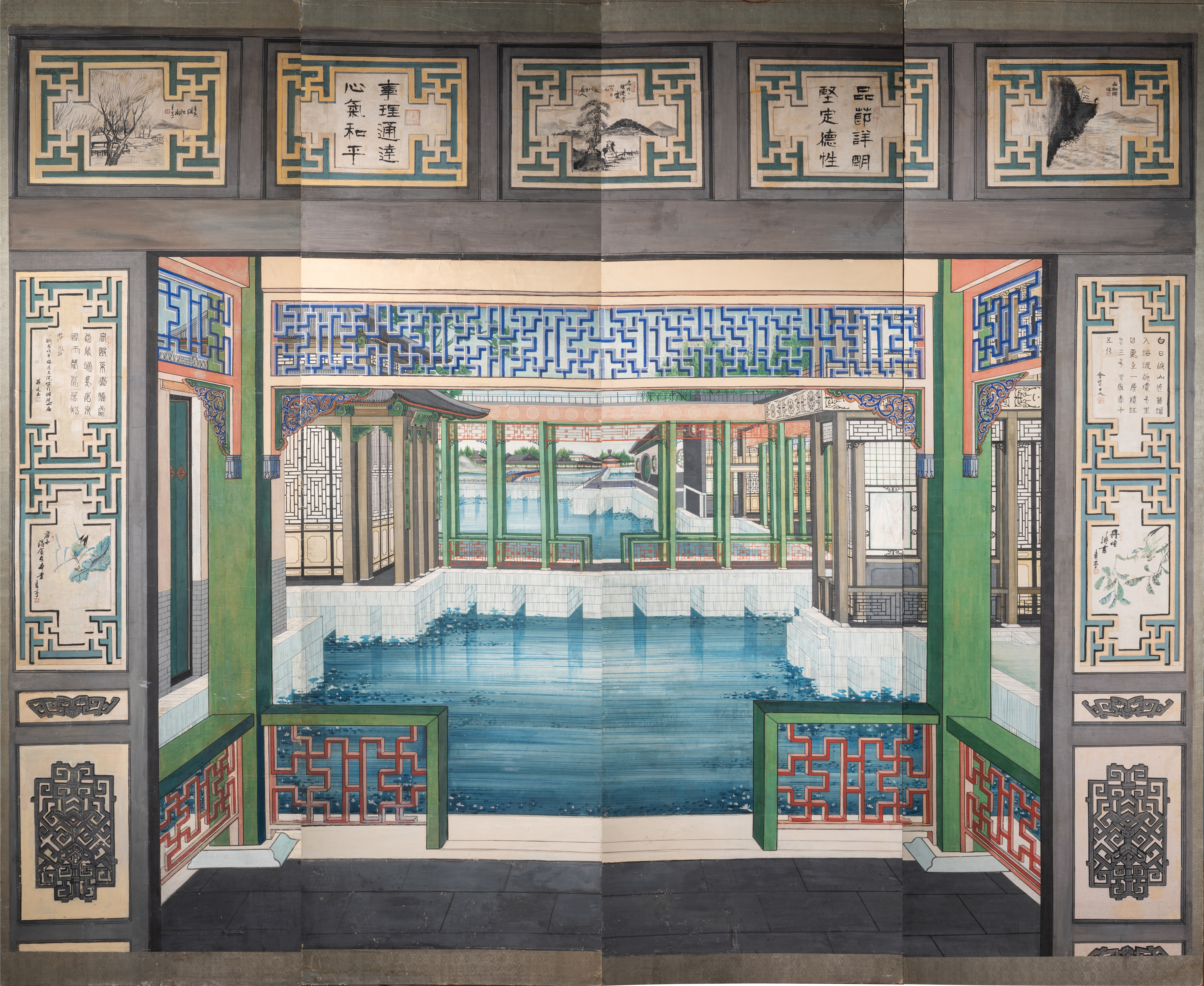 This four-leaf folding screen is decorated with hanging wallpaper scrolls depicting a view of ponds and gardens from inside a palace, the sides and upper part decorated with landscape paintings and calligraphic poems.