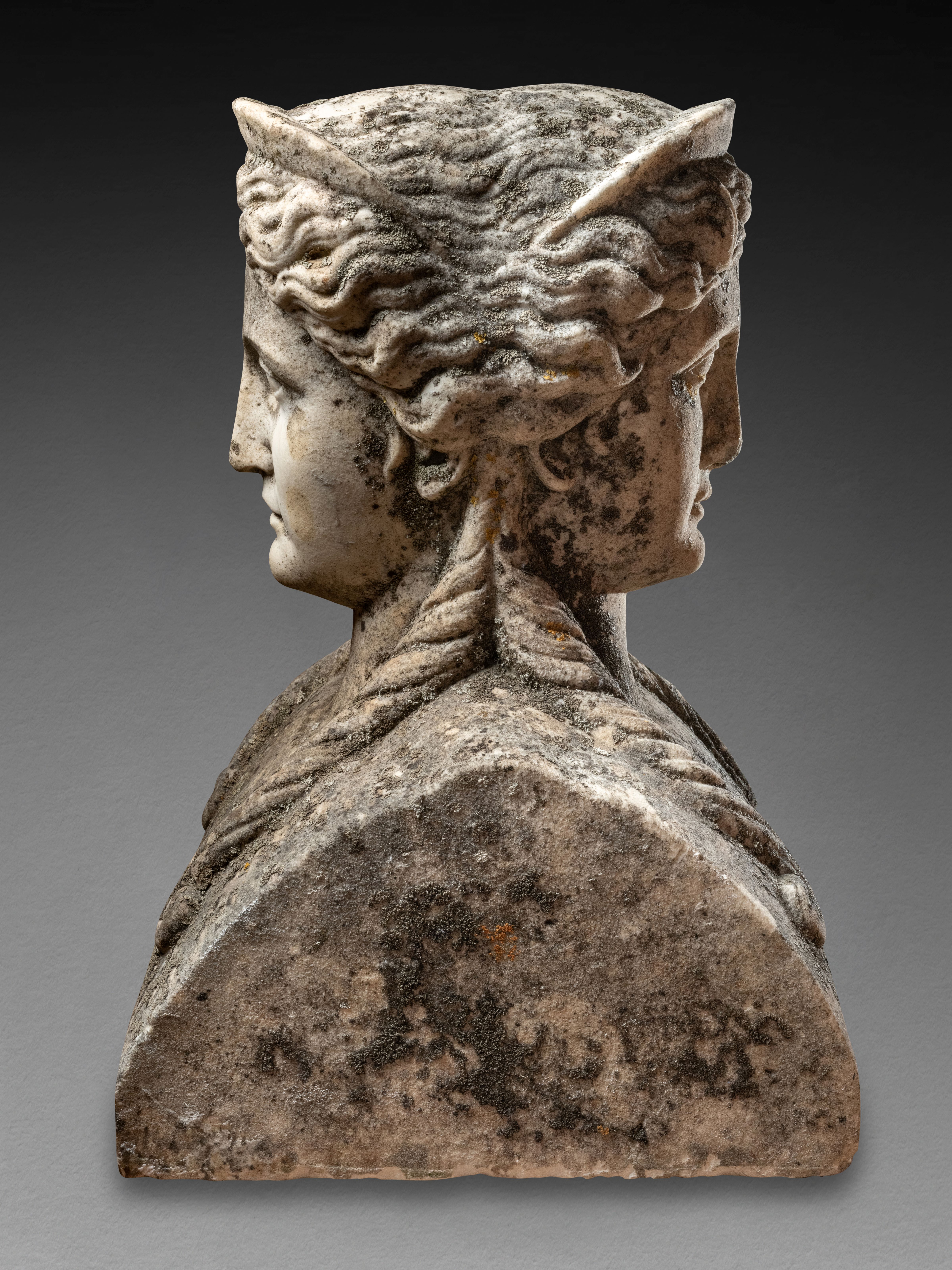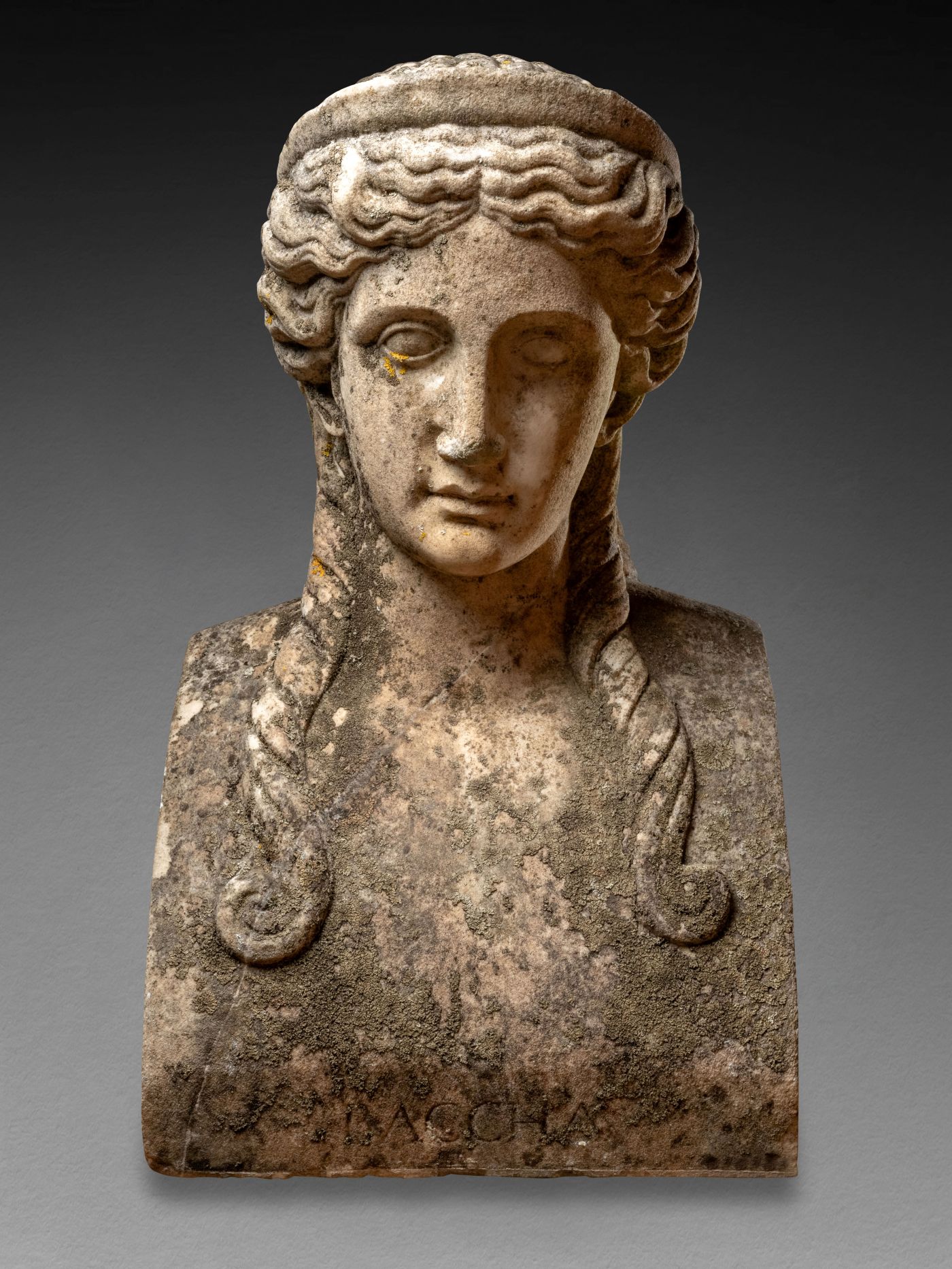 This marble represents two women’s faces in antique style. It bears the inscription “BACCHA”, bacchante in Latin, on the base of each face.