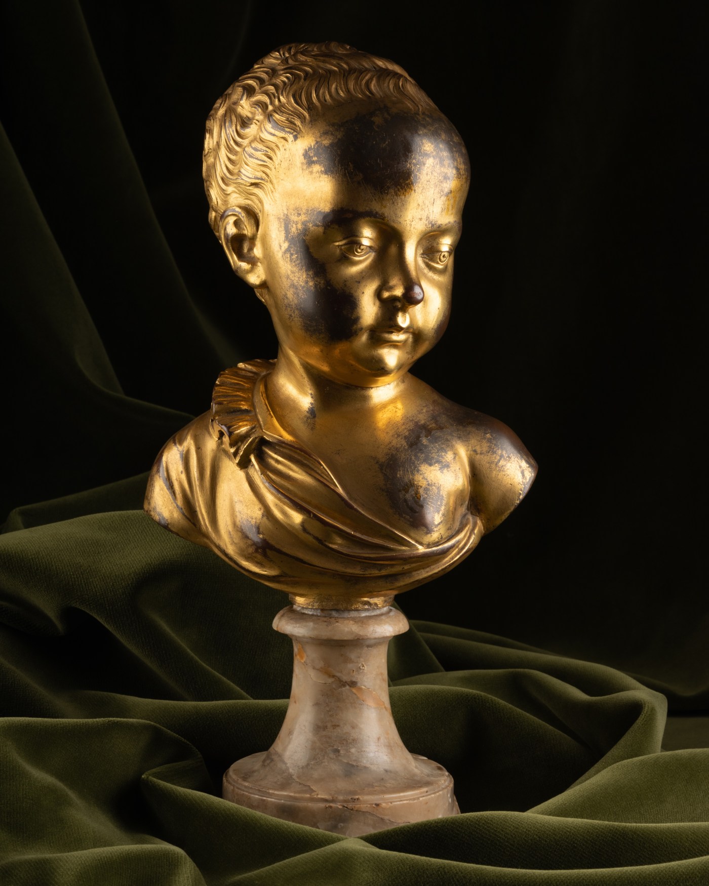 A similar gilt bronze bust was exhibited in 1967 at the Château de Laarne during the exhibition “Bronzes de la Renaissance de Donatello à François Duquesnoy” (Renaissance Bronzes from Donatello to François Duquesnoy). This latter piece traditionally came from the Russian Imperial collections, and had, in all likelihood, been acquired by the art historian and collector Henry-René d’Allemagne during the numerous dispersals of private Russian collections after the October Revolution. Because it was a cast of a Bust of a Child in marble preserved at the Louvre and attributed since the end of the 19th century to Germain Pilon or his workshop, this gilt bronze version had at the time been dated to the late 16th century, Germain Pilon having died in 1590.
