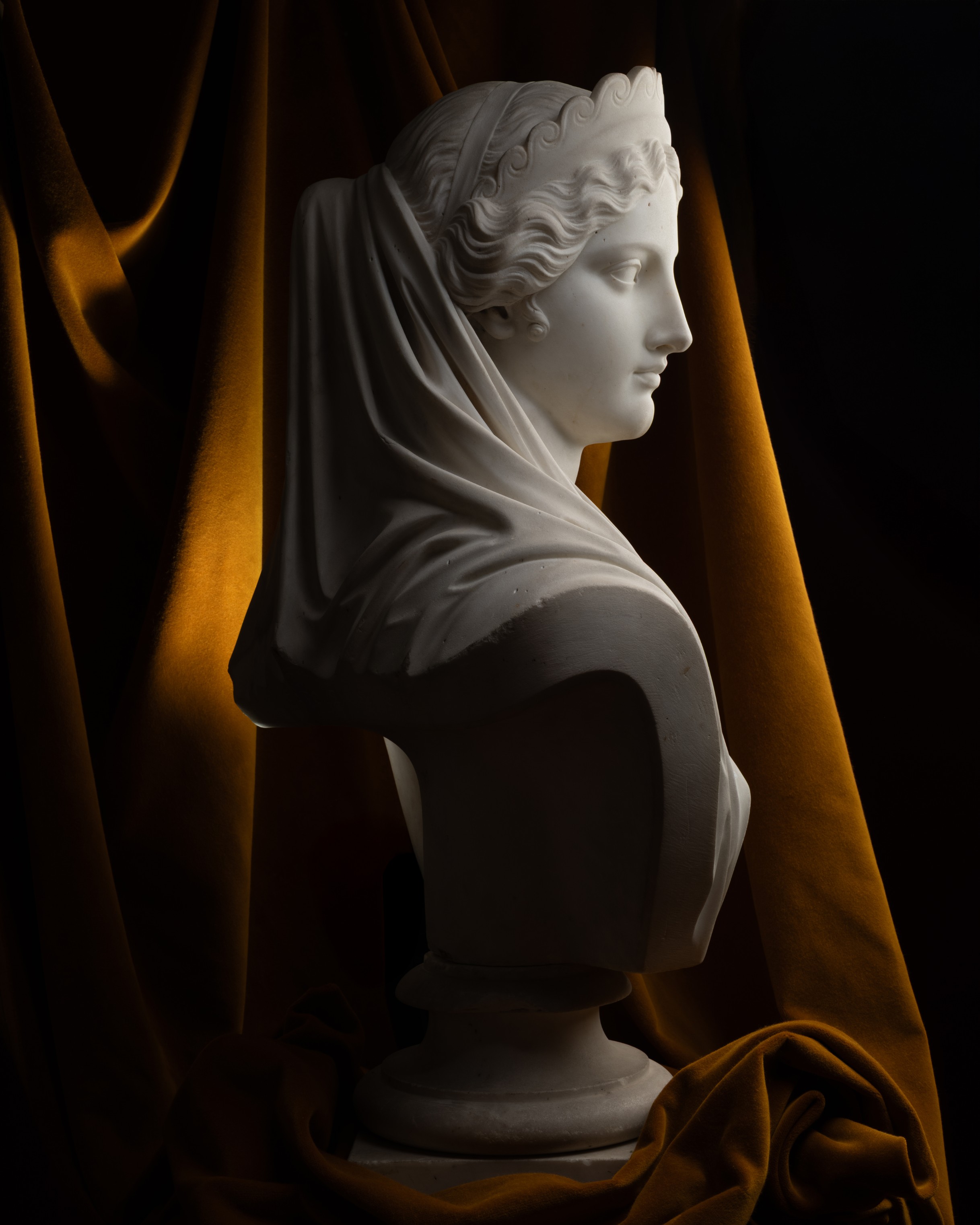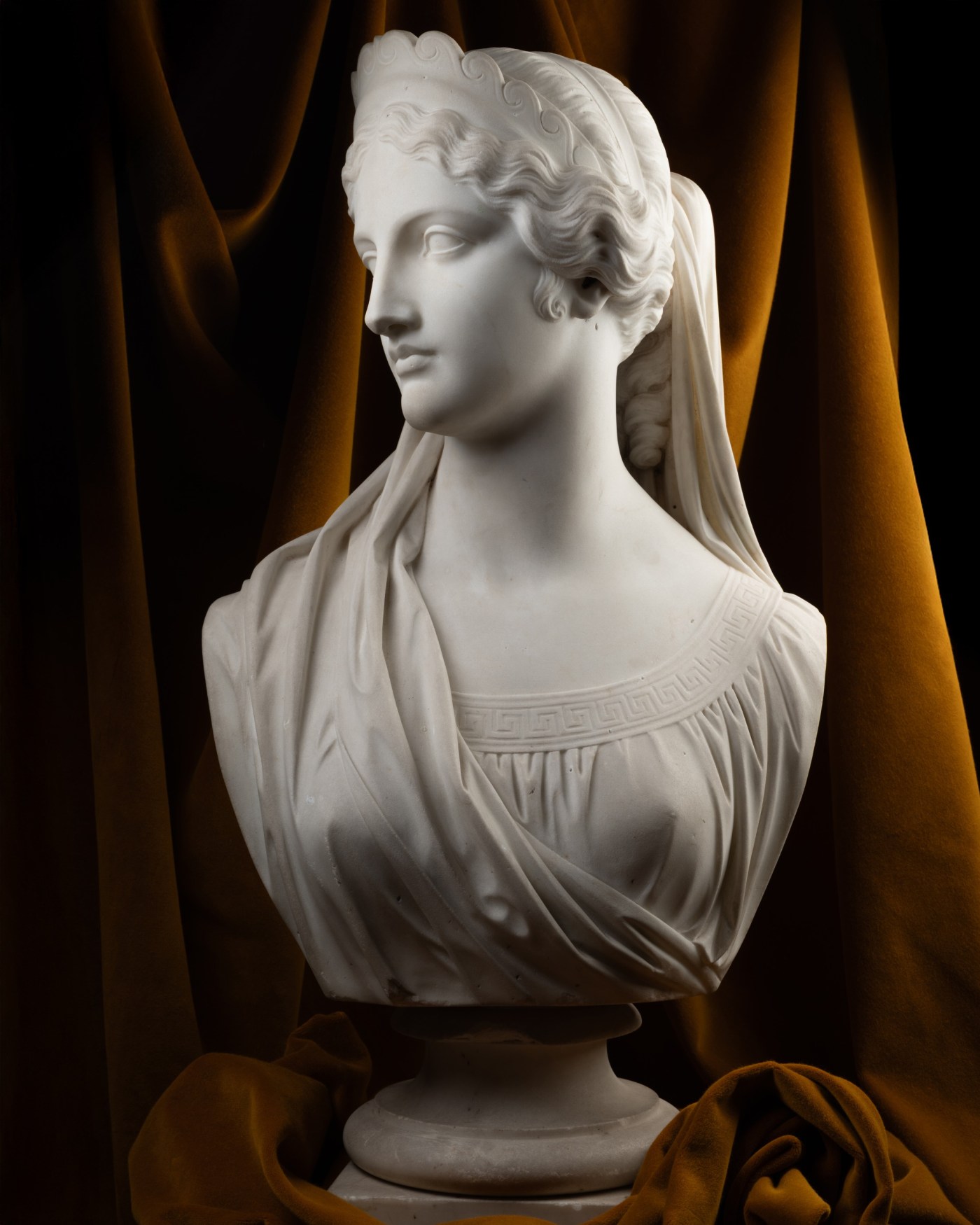It is the scenes, highly celebrated in the first half of the 19th century, engraved by Tommaso Piroli after the drawings of John Flaxman to illustrate a 1805 edition of the Iliad and the Odyssey, that inform the iconography of this bust : when Aphrodite, disguised as a Phrygian servant and wearing the pilos, leads Helen into Pâris’ chamber in the third book of the Iliad, Helen wears a veil over her hair and a diadem adorned with so-called ‘Vitruvian’ scrolls, akin to that of our bust. Flaxman’s Penelope, by contrast, throughout the Odyssey, is crowned with a slightly taller diadem featuring a frieze of anthemia.