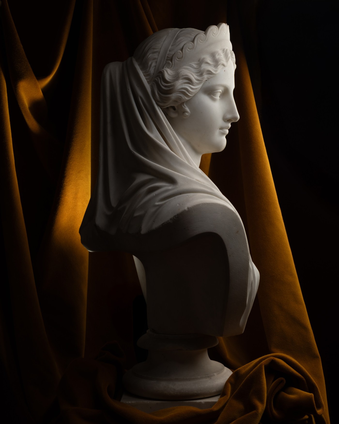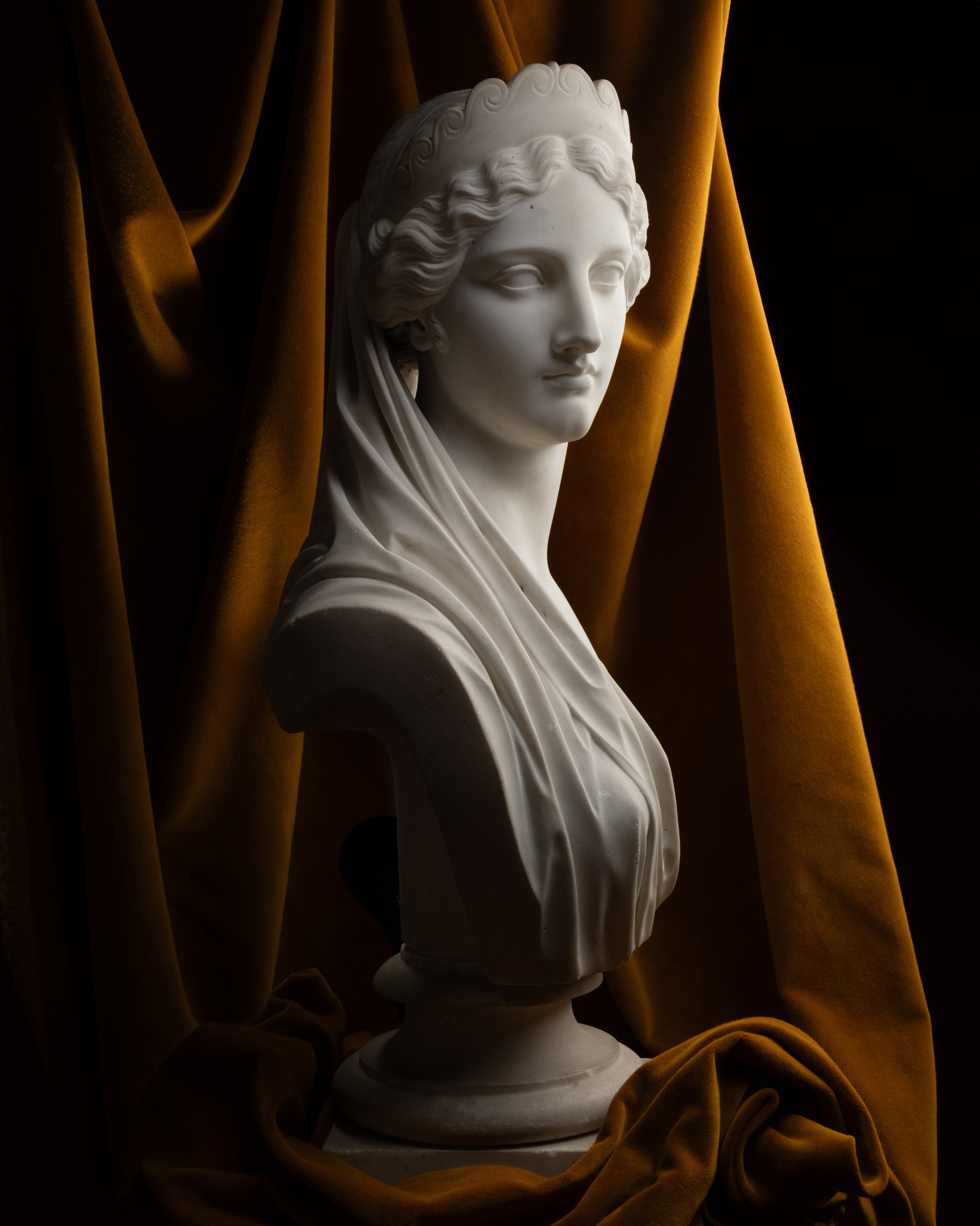 Thus, this bust of Helen of Troy, dated 1874, signed a few months at most before the sculptor took his own life, is most likely his final work. With this Helen, Foley puts to an end a series of ideal beauties begun eight years earlier with the same subject. It is arguably, as a matter of skill and technique, his most accomplished work : in a true feat of artistry, he managed to sculpt the sumptuous curls of Canova’s Venus Hope, though half concealed beneath an ample veil. Helen’s face, closely resembles another bust : his latest work preserved in public collections, that is a Portrait of a Young Girl dated 1873, held at the National Gallery of Ireland, which, like our Helen, reveals in the girl’s face and the rendering of her clothing the ultima maniera of the sculptor.