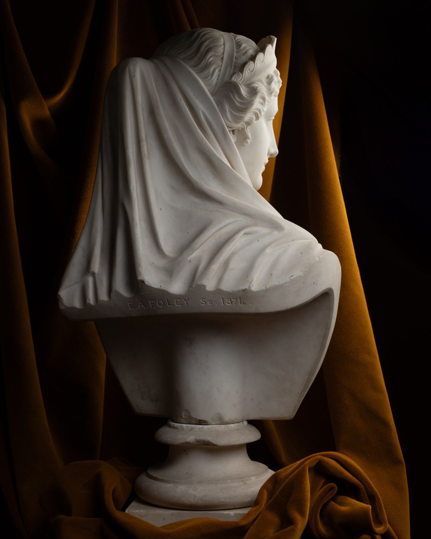 This bust of Helen of Troy bears the signature of a tormented artist. Edward Arlington Foley, who signed : “E. A. Foley. Sc. 1874.”, was born in Dublin in 1814, trained at the Royal Dublin Society and under now-forgotten Irish sculptors, his kinsman Benjamin Schrowder and John Smyth. Unable to establish himself as a sculptor in Ireland, he soon settled in London, specialised in portrait busts, and began exhibiting at the Royal Academy in 1834, where “his busts, with several graceful ideal works, appeared almost every year down to 1873.” Among the busts displayed at the institution’s exhibitions are busts of Samuel Lover of 1839, now at the National Portrait Gallery, of the singer Catherine Hayes in 1855, which he sculpted and exhibited again in 1861, the nymph Oenone in 1869, Penelope in 1870, and a Morning Star in 1873, an allegory most mysterious and haunting inspired by Milton :