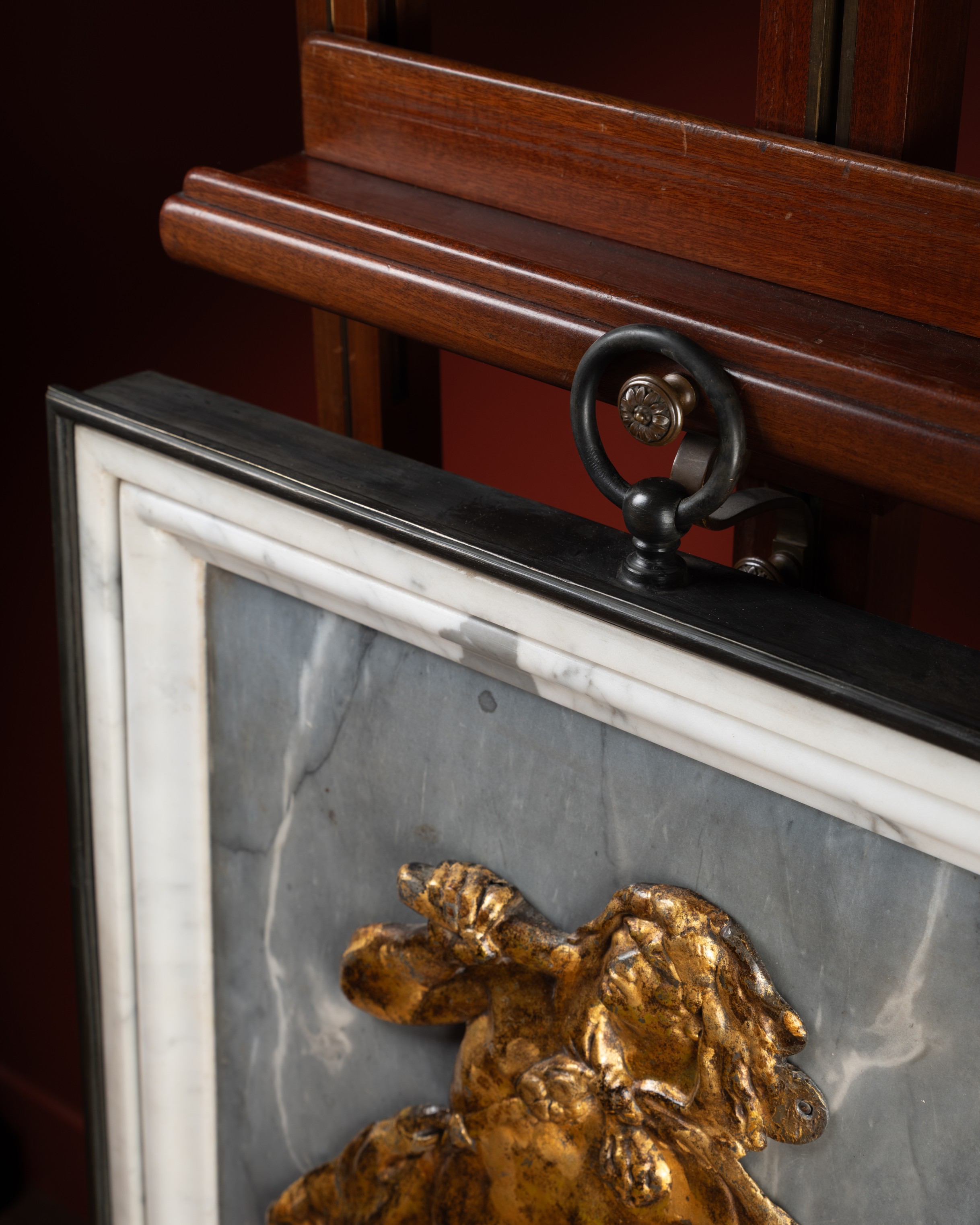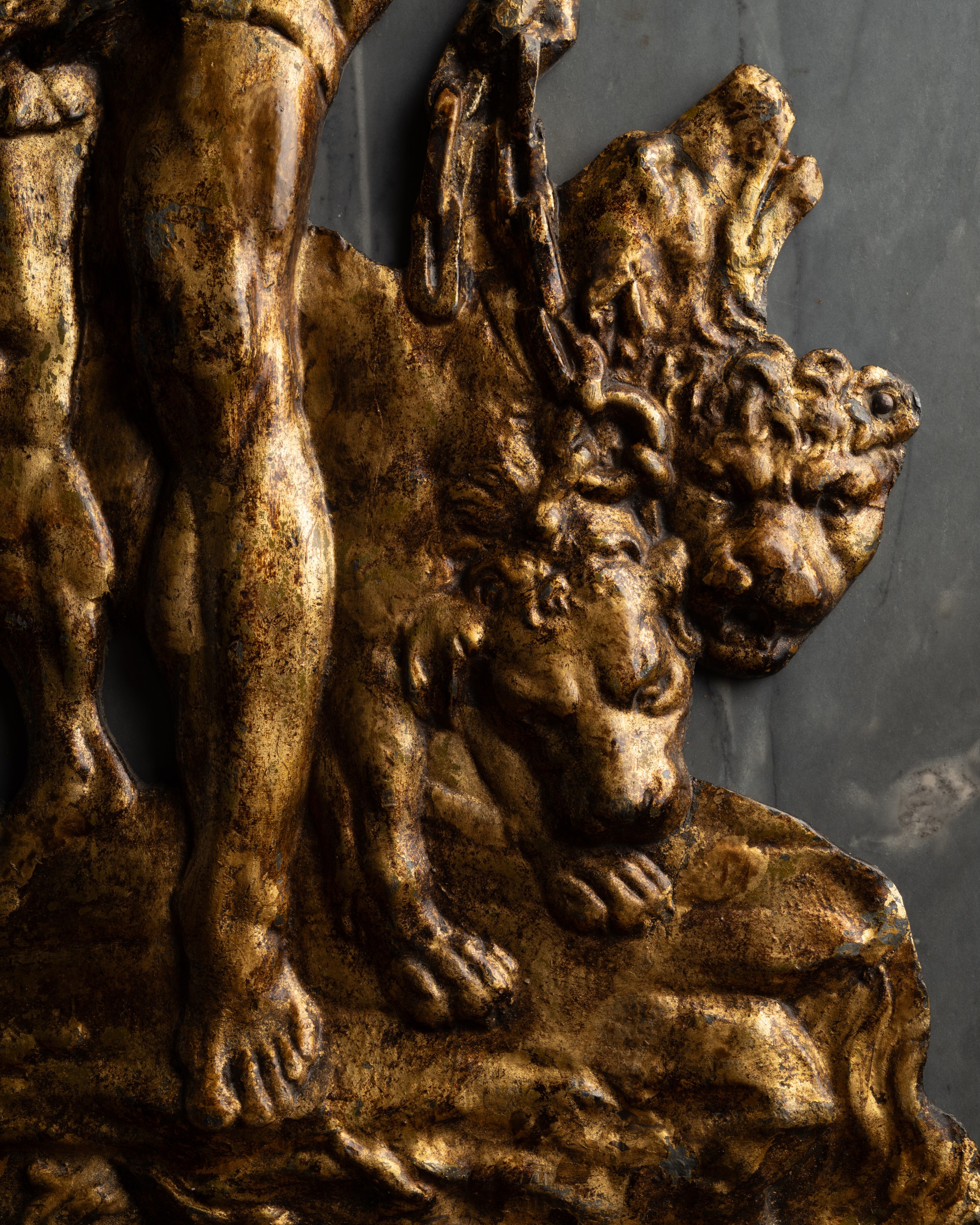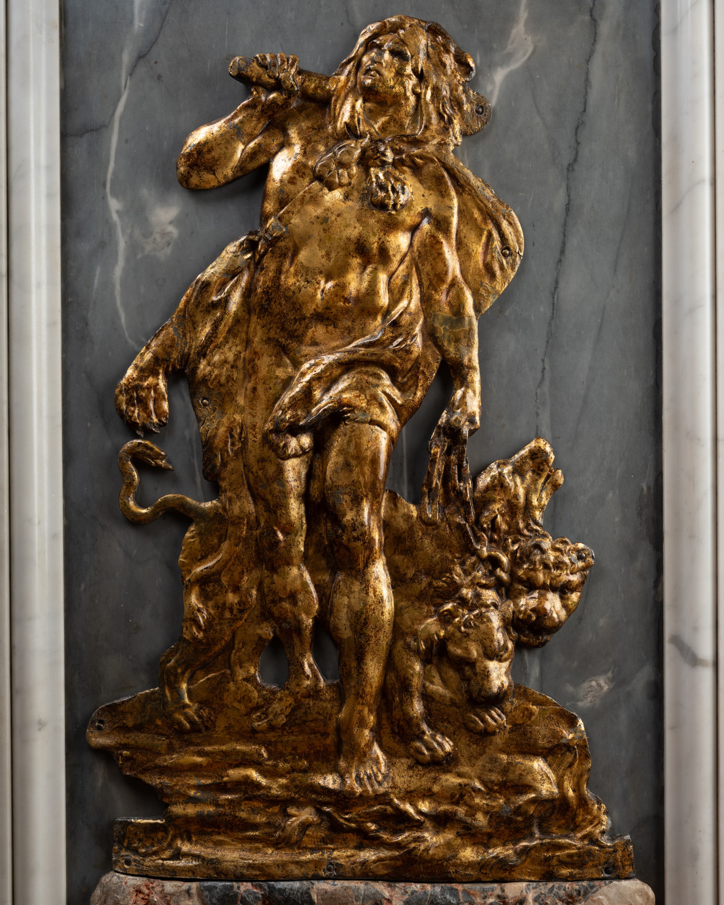 This relief, likely created after the work at the Hôtel d’Argenson, echoes the composition and vibrant polychromy of the four bas-reliefs Pajou crafted for the overdoors of the mansion’s salon. Those works, inspired by the four elements, feature mythological scenes in gilded plaster on mixtion, set against a deep blue stucco background. The “subdued” gilding of the metal in this relief seems to mirror the plaster of Pajou’s Pluto, Proserpina, Boreas, and Cybele figures, exquisitely modeled with the glow of “aged gold,” while a refined turquin blue marble plaque takes the place of the blue stucco. Though the colors used in this relief were fairly typical of the neoclassical era, it stands out with a marble-simulated rock — almost rocaille in its whimsy — serving as a striking promontory for Hercules.