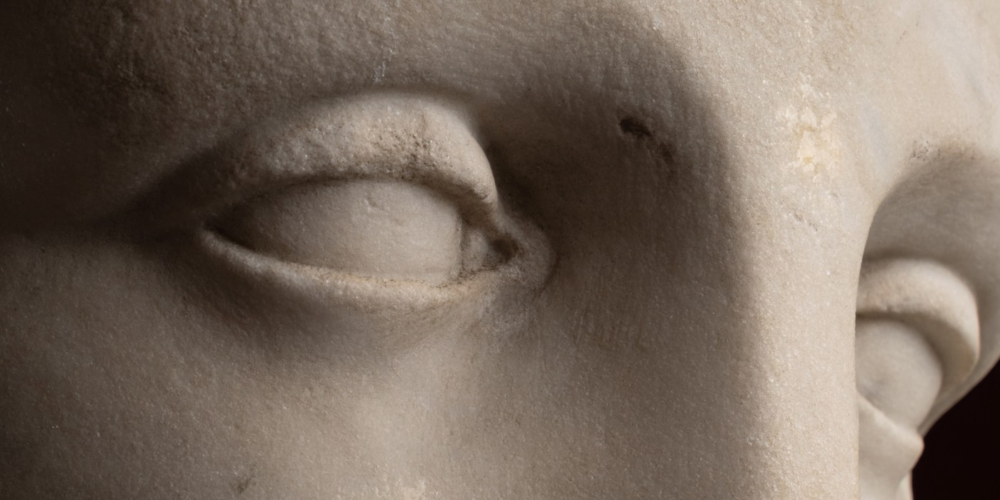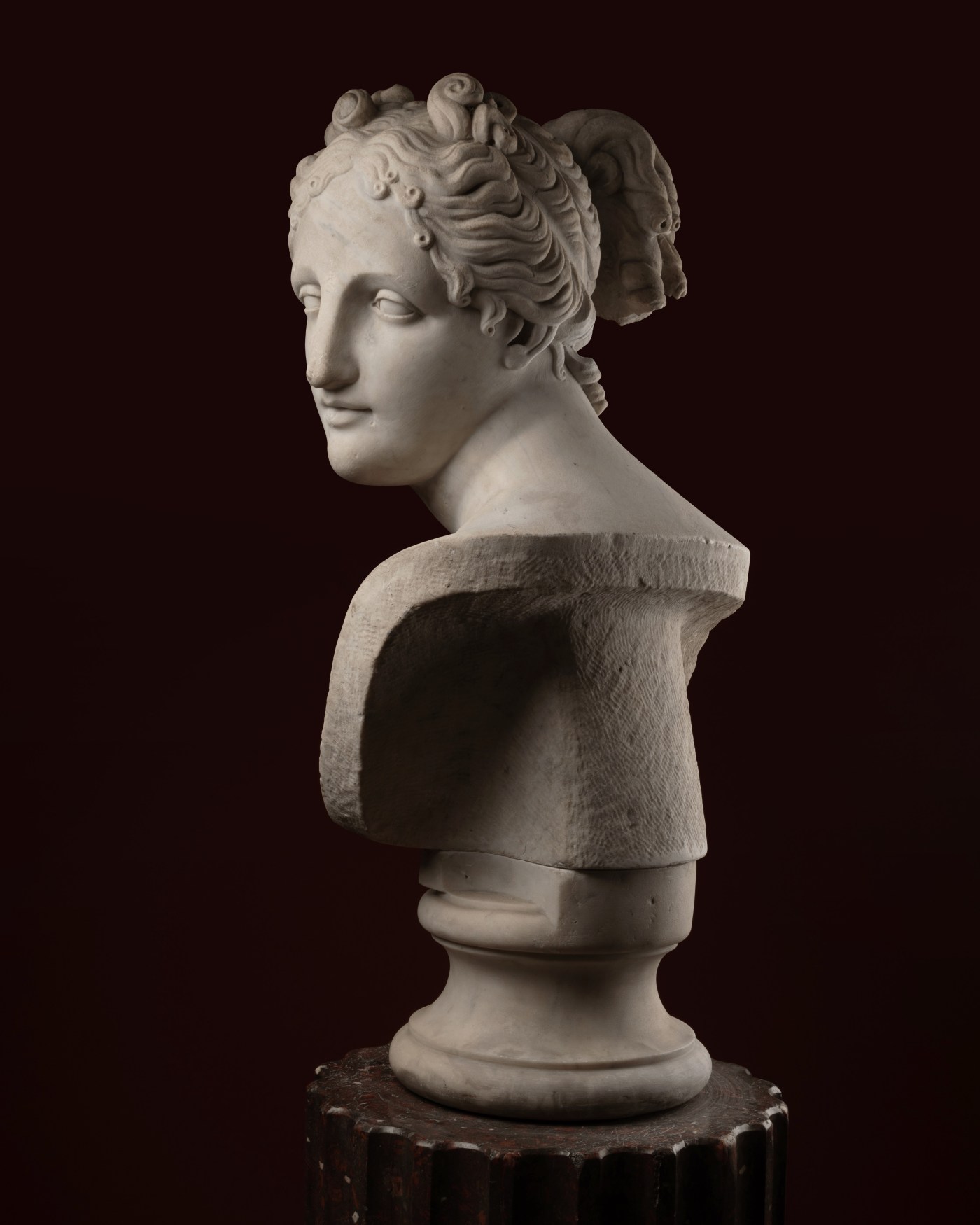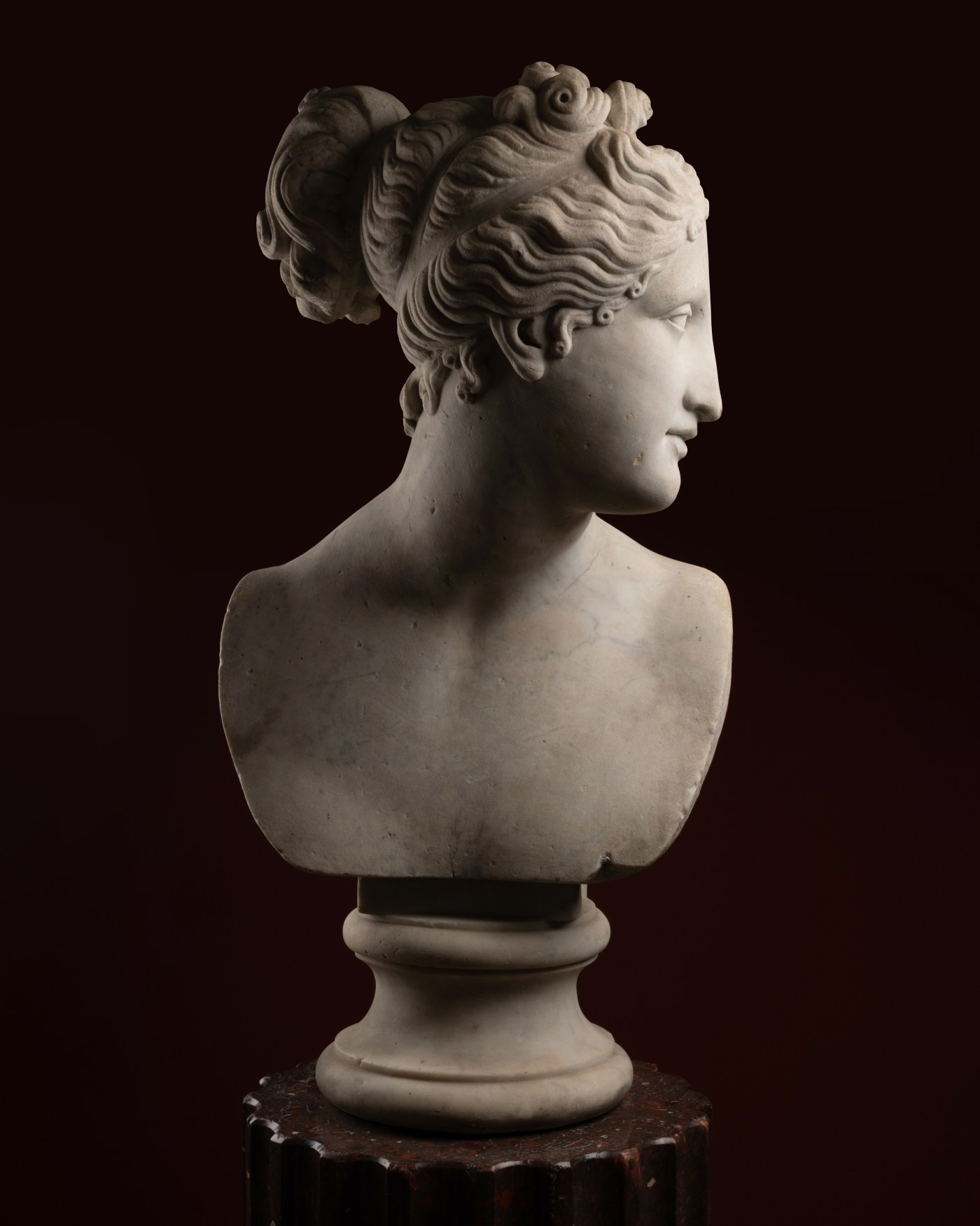 Subtle details in the modelling of the face and hair, in particular the number of curls above the forehead, indicate that this marble bust was sculpted after the Venus in the Palazzo Pitti and not the one in the Residenz, nor the Hope Venus, or even the bust in the Hermitage that was attributed to Canova at the end of the 20th century. Some damage to the marble.