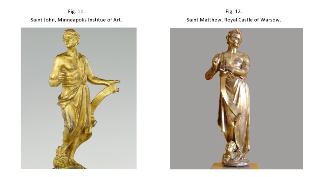 It is certain that the models of this master were also known at different times and reproduced more or less successfully. In the case of our evangelists, a Saint John and a Saint Mark were sold in 1925. They were part of the prestigious collection of Camille Castiglioni and had been attributed to Tiziano Aspetti by Leo Planiscig, which seems implausible today. Another Saint John is known in the collection of the Minneapolis Institute of Art (Fig. 11) but the poor quality piece had been casted in a much later period of time. As it is for a Saint Matthew kept by the Royal Palace Museum in Warsaw (Fig. 12).