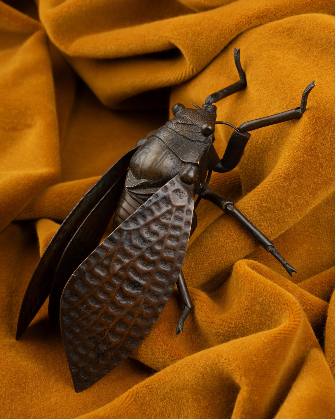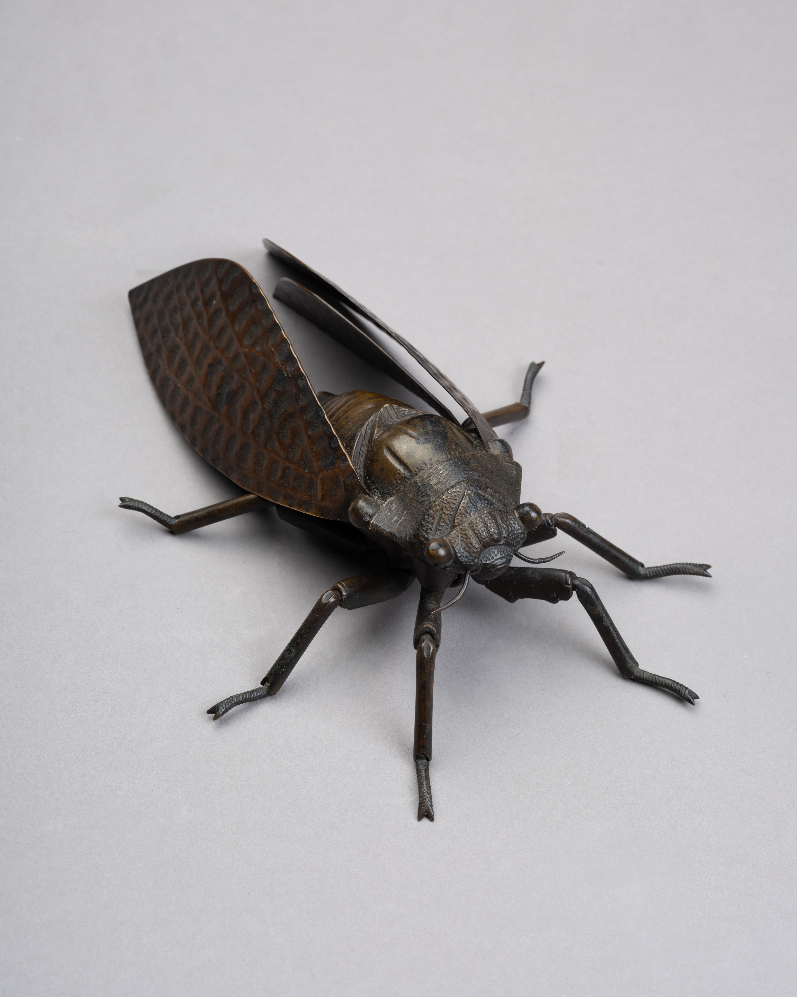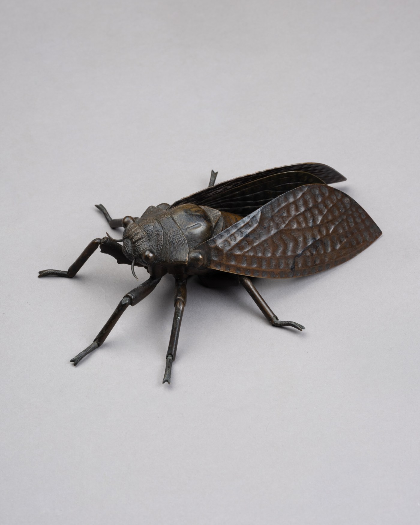 The production of jizai(自在, “freely moving”) okimono (置物, “ornamental figure”) represents a refined evolution of the Japanese armorer’s craft. Following the decline in demand for traditional suits of armor toward the end of the Edo period, master metalworkers repurposed their expertise in complex, interlocking metal joints to create naturalistic figures. The predilection for insects and crustaceans in this medium — of which this cicada is a primary example — doubtless stems from the armorer’s long-standing familiarity with the segmented, mobile plates of samurai protection.