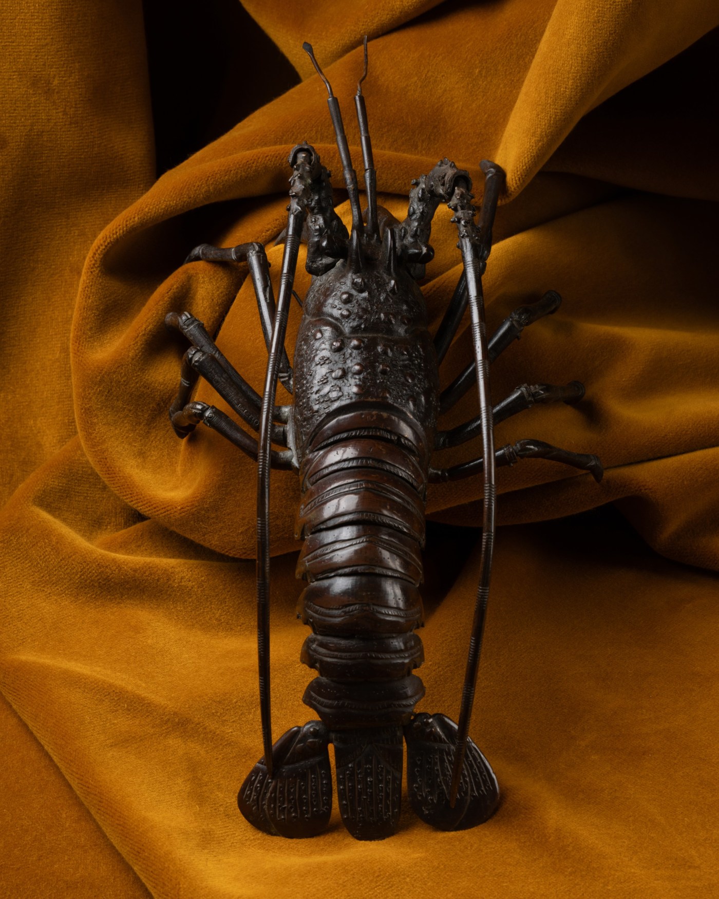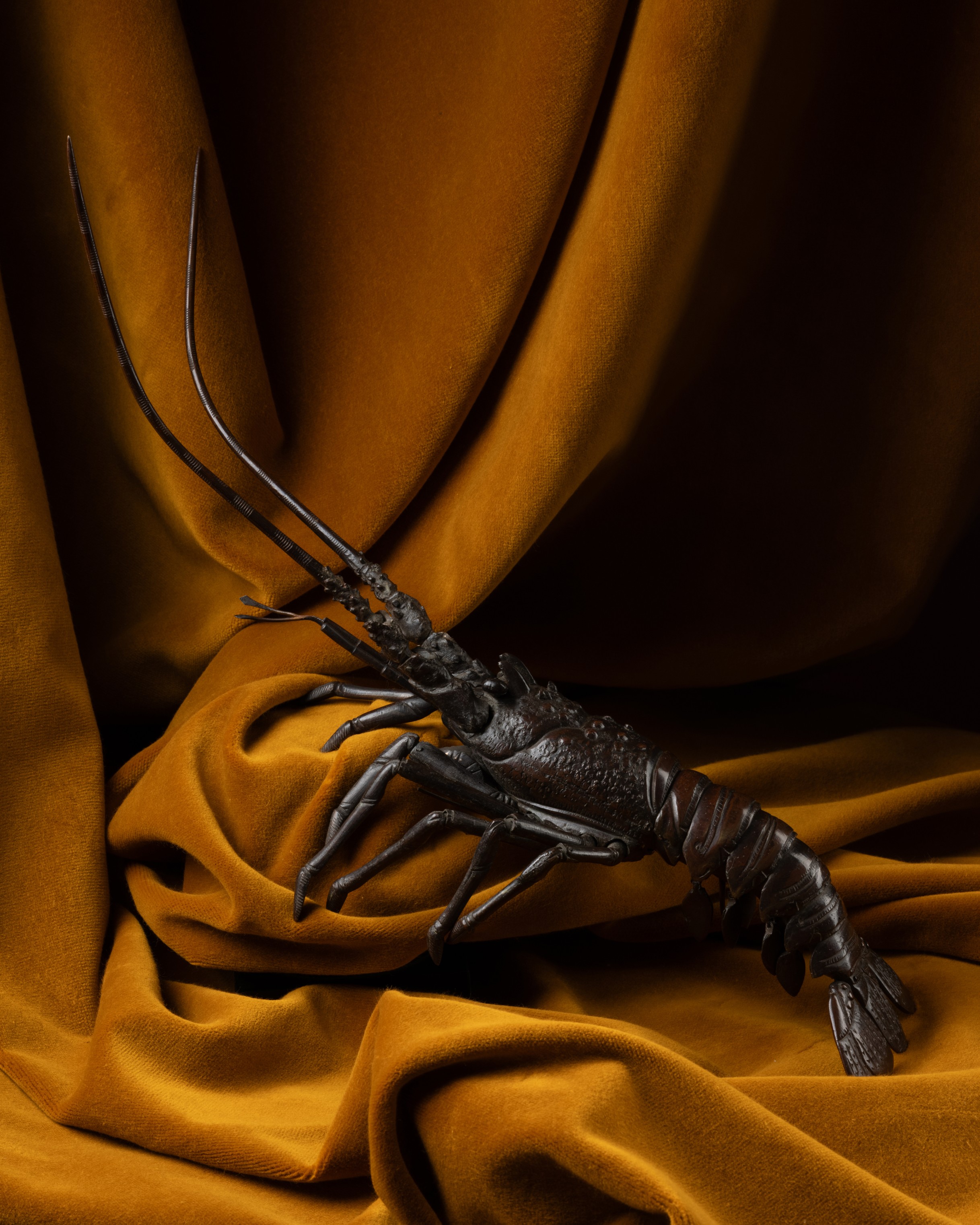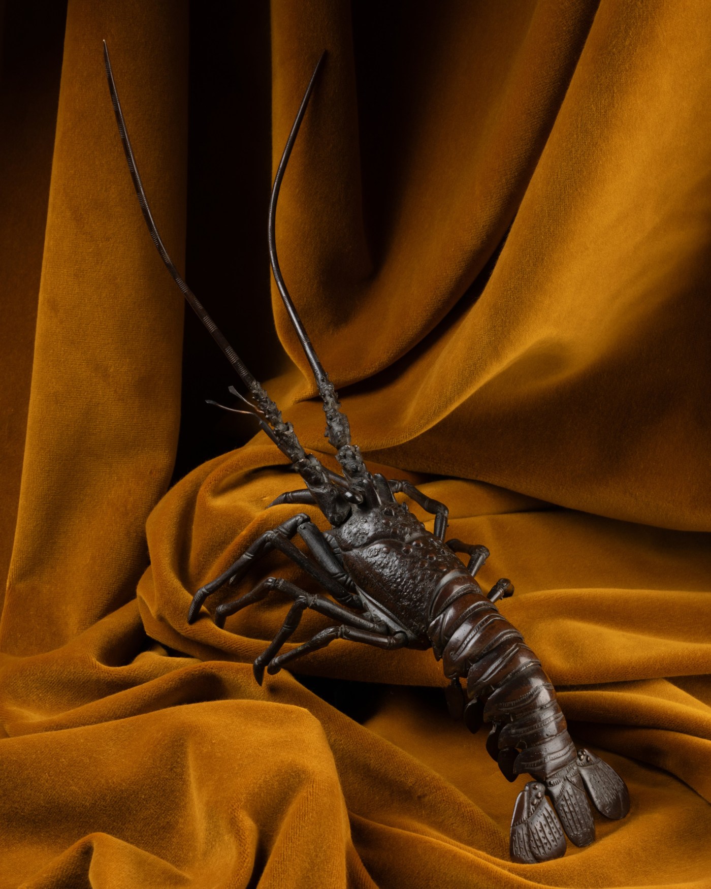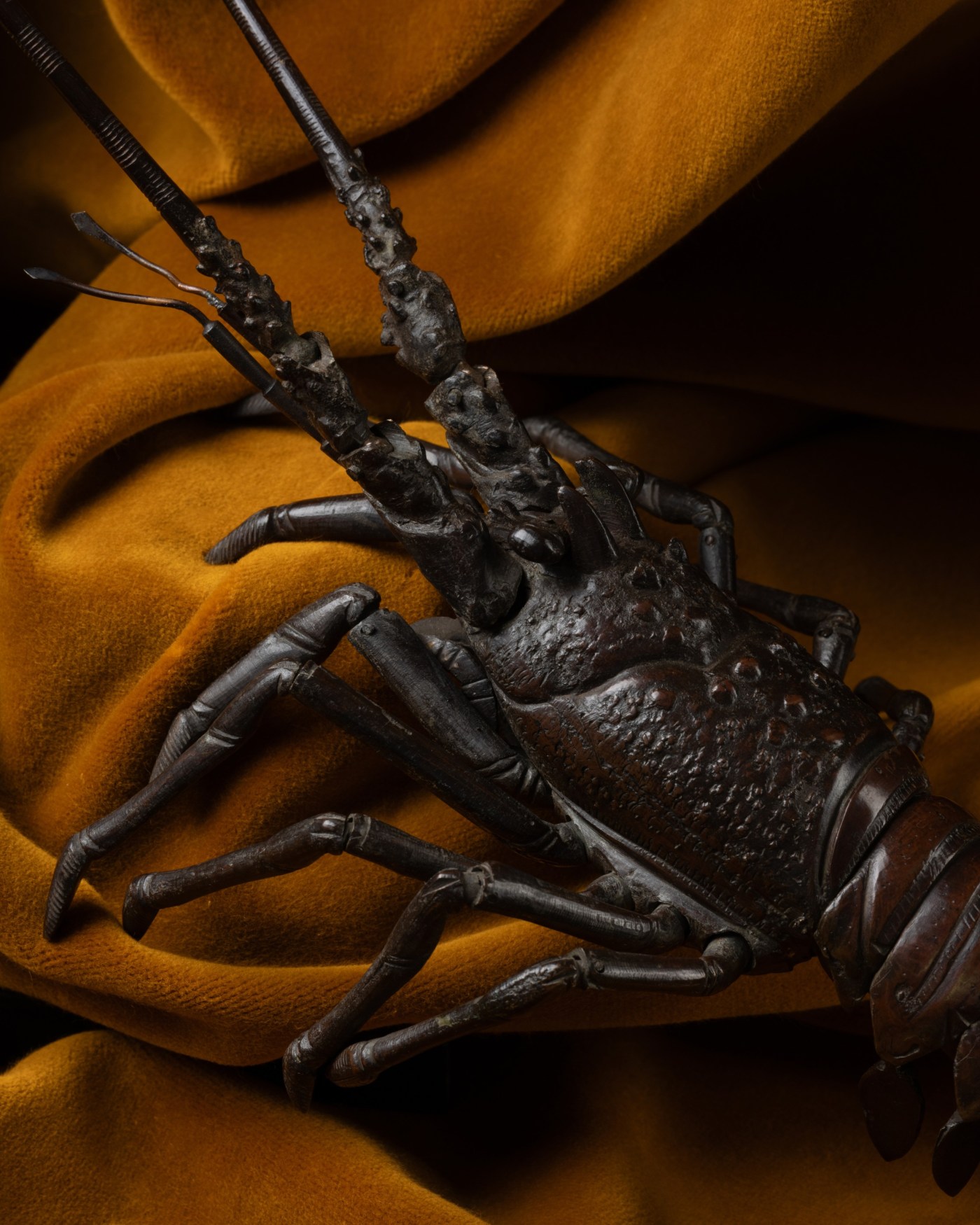 This life-sized bronze lobster is a perfect example of the Japanese art of okimono (置物, or “ornamental figure”) of the jizai (自在) type, meaning “free” (in the sense of “freely moving” or “freely articulated”). Since the Edo period, sculptors who mastered the art of jizai owed much of their skill to Japanese armorers, whose craftsmanship was increasingly less in demand but who were adept at creating complex, partially articulated metal pieces.