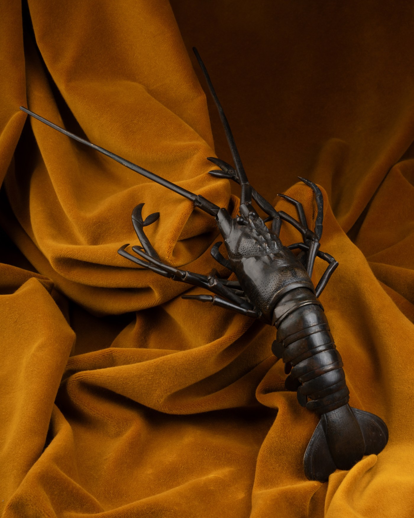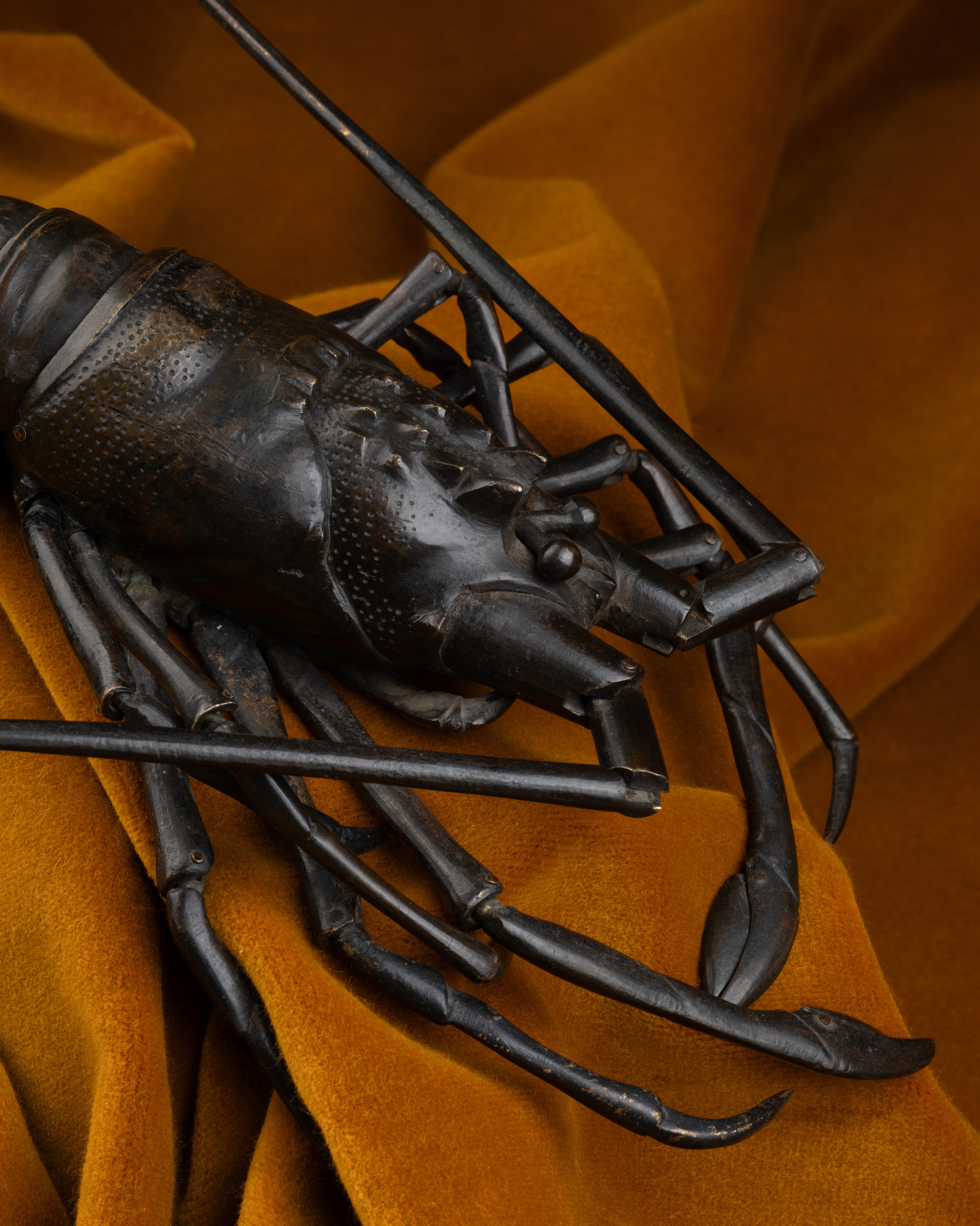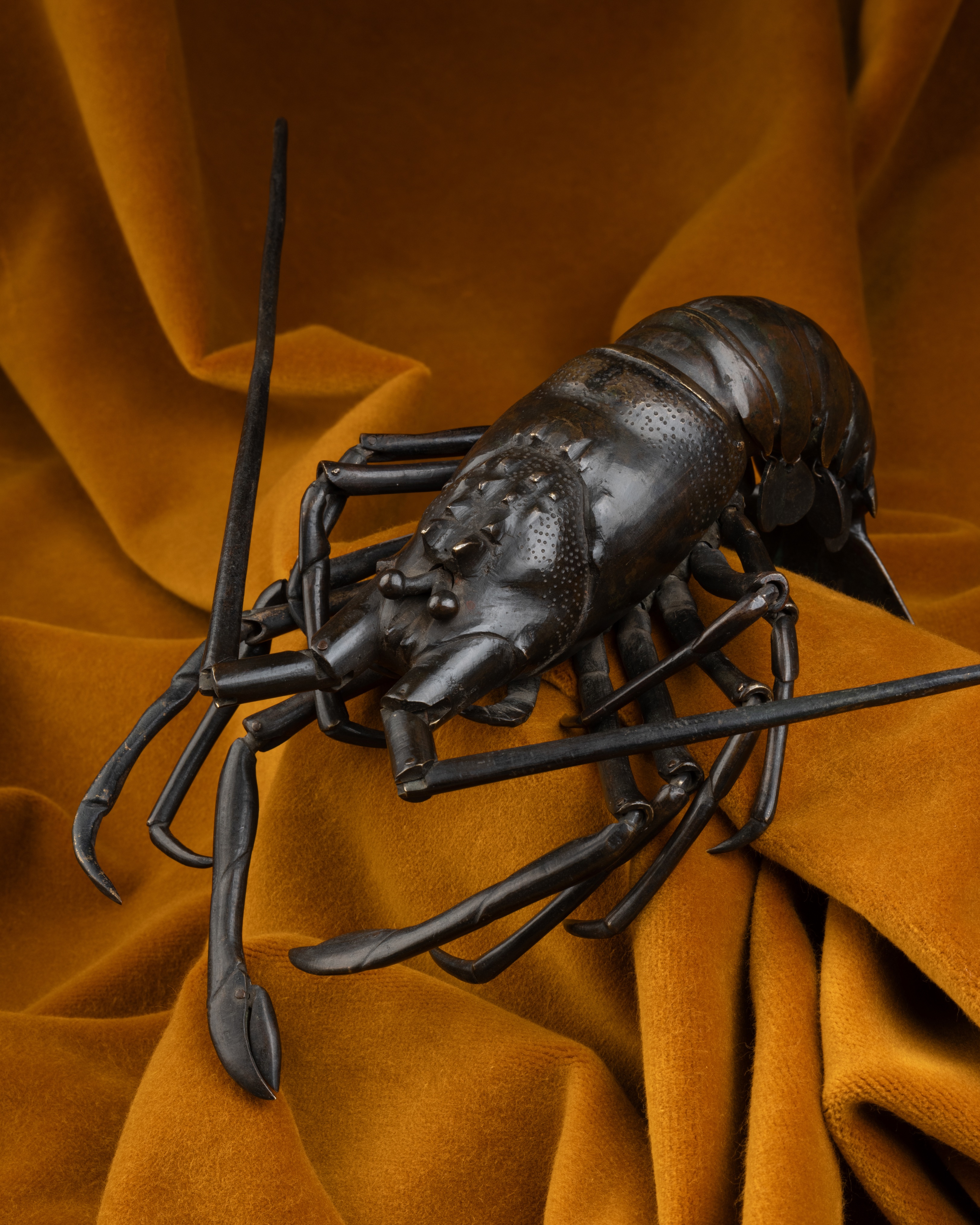 This bronze spiny lobster bears a partially illegible signature, making it impossible to identify the master bronzesmith who crafted it. With its numerous points of articulation, it serves as a fine example of the Japanese art of okimono (置物, or “ornamental figure”) of the jizai (自在) type — meaning “free of movement” or “freely articulated”.