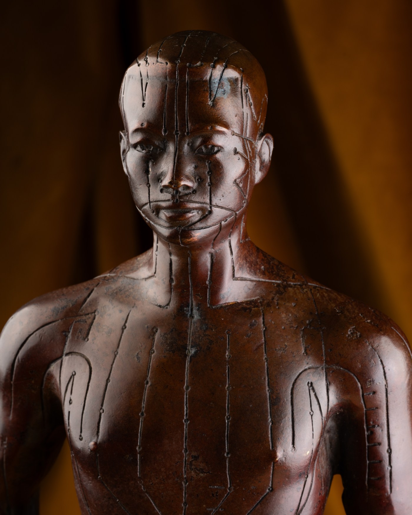 This acupuncture bronze model, or tong ren, represents an interesting synthesis of art and medical science, rooted in a tradition of acupuncture education dating back to the Song Dynasty in 11th-century China. Far more than a decorative sculpture, it serves as a standardized three-dimensional textbook, meticulously mapping the meridians and acupoints through which Qi is believed to flow.