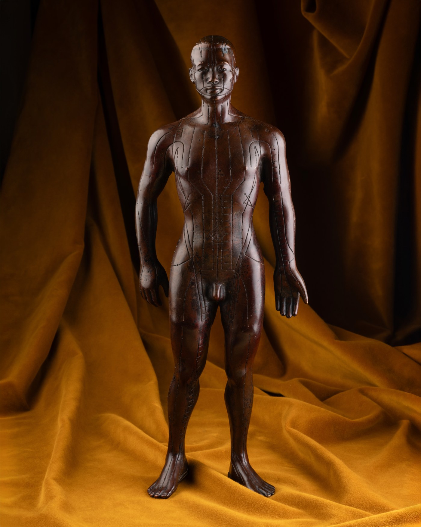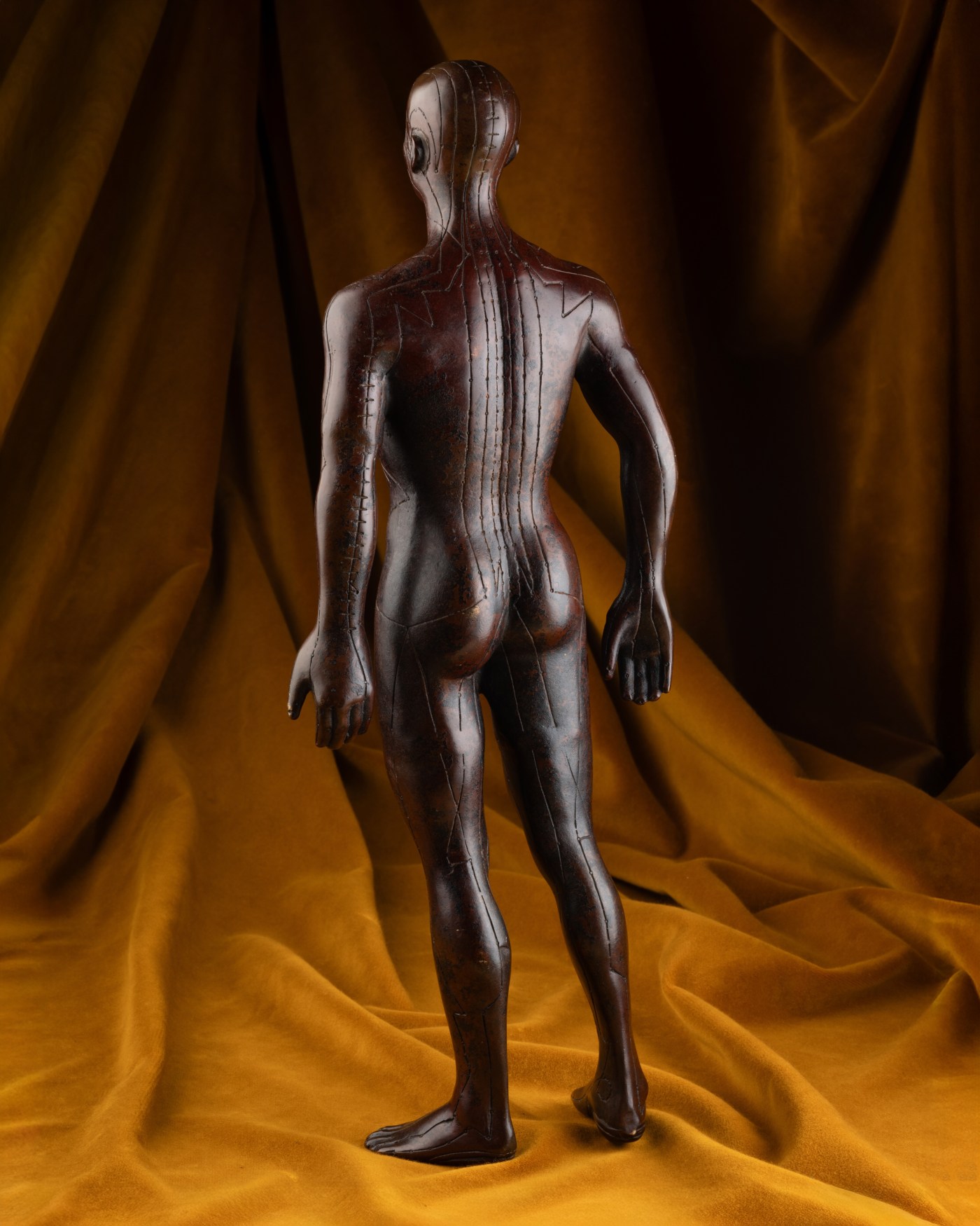 This specific figure is a Modern iteration of the classical medical model, produced via sand casting with a sand core. Cast in a heavy bronze alloy, the sculpture features a dark, oxidized patina that accentuates the intricate network of 361 primary acupuncture points and 14 major meridians (Jingluo) integrated directly into the metal. The anatomy is presented in a rigid, formalized "anatomical position" to ensure an unobstructed view of the pathways and the Chinese characters identifying each site. It functions as a precise cartographic instrument, codifying the body as a "microcosm" of universal forces and providing a tangible, durable reference for the complex topography of Traditional Chinese Medicine.