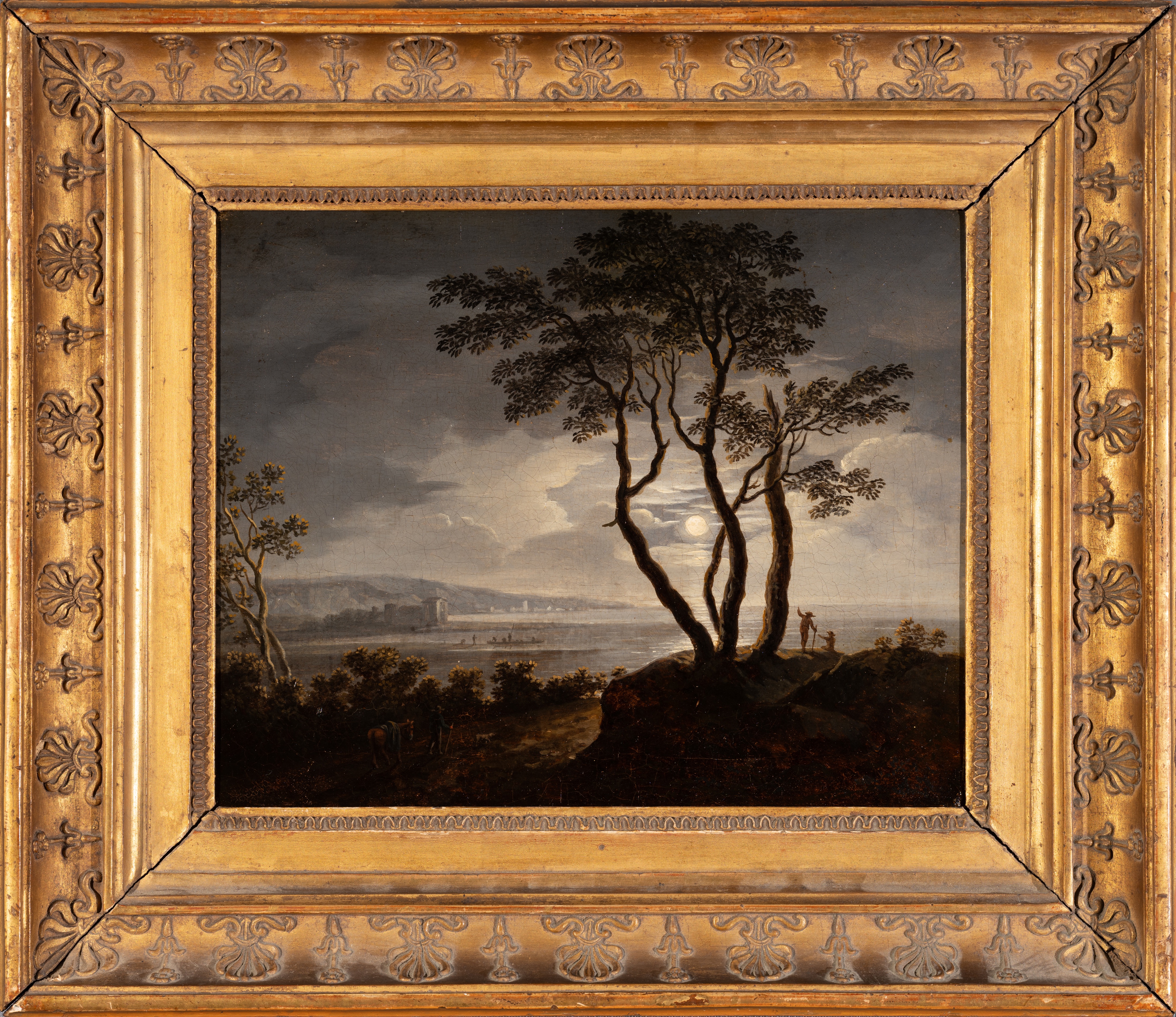 This style is characterized by the representation of landscape as a reflection of emotions. Unlike classical landscapes that sought balance and formal perfection, the Romantic landscape is a projection of the artist's feelings. Here, the dark atmosphere, the heavy sky, and the twilight evoke melancholy, reverie, and a certain anxiety in the face of nature's power. Our painting showcases a grandiose and sometimes menacing nature, before which man is small and fragile. Elements such as the tormented clouds and the vastness of the landscape dominate the small human figures. The treatment of light is essential. The moon dramatically illuminates the scene, creating strong contrasts between shadow and light. The chiaroscuro enhances the mysterious and contemplative mood. The sublime is a key concept of Romanticism, referring to a feeling mixing pleasure and terror when faced with the immensity and power of nature. This painting, with its threatening sky and infinite horizon, evokes this feeling of man's smallness in the face of the world. This painting belongs to a pictorial tradition of artists who knew how to express emotion and spirituality through their landscapes, such as Caspar David Friedrich, J. M. W. Turner, or Joseph Vernet.