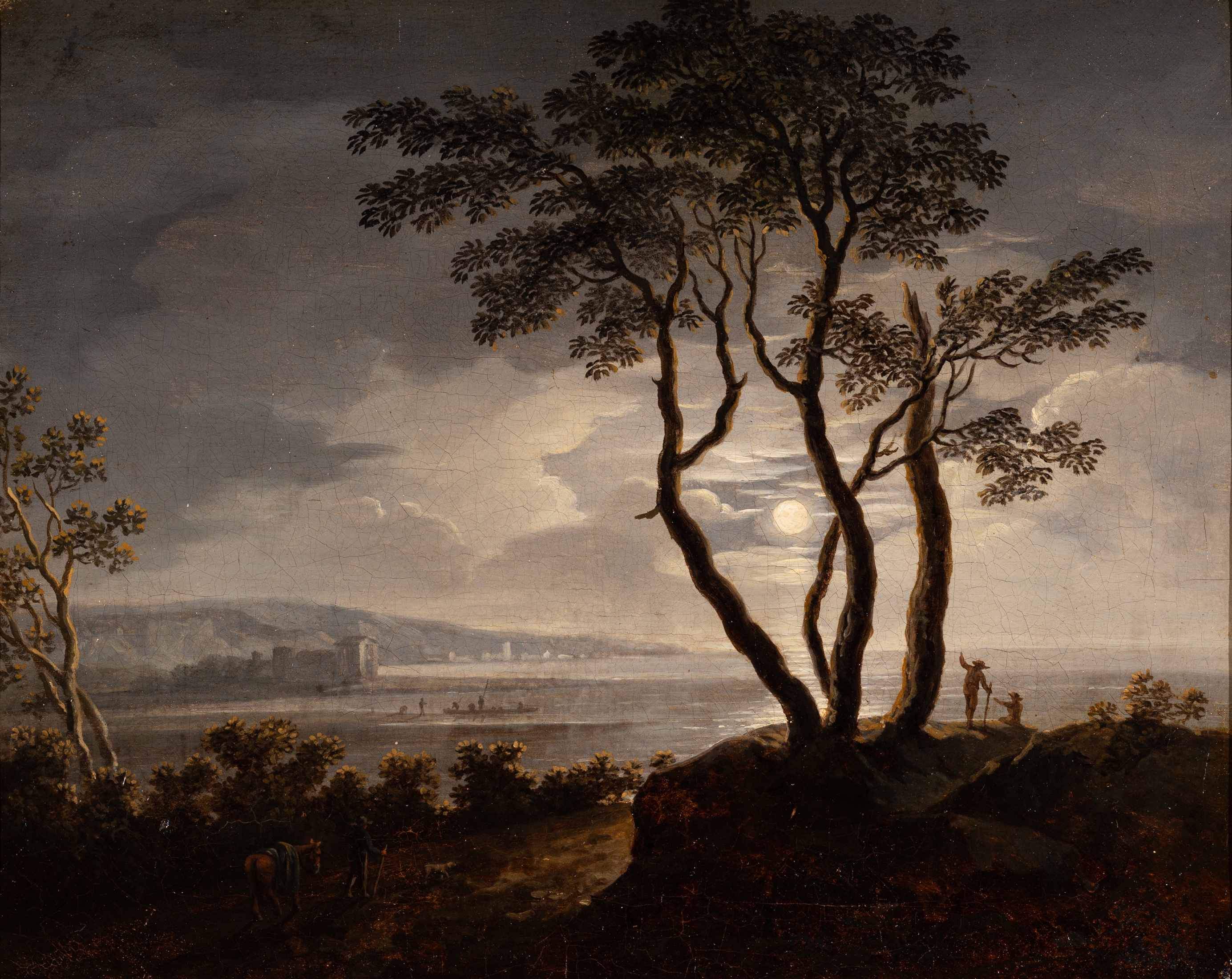 This oil on canvas depicts figures on the shore of what appears to be a sea or a lake by moonlight.