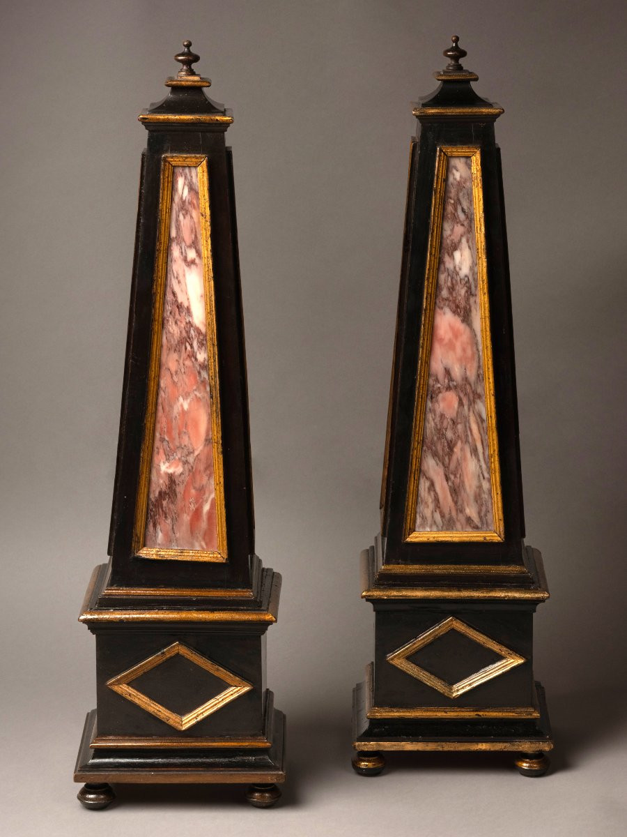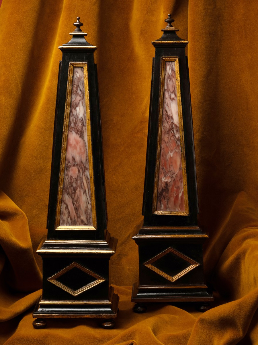 The decoration of these two obelisks, with ebonised and parcel-gilt wood inlaid with Portasanta marble panels, is characteristic of a specific kind of marble-inlaid furniture produced during the 17th century to adorn Milanese churches. Notable examples include the confessionals and the pulpit of the Church of Sant’Alessandro in Milan, executed around 1640.