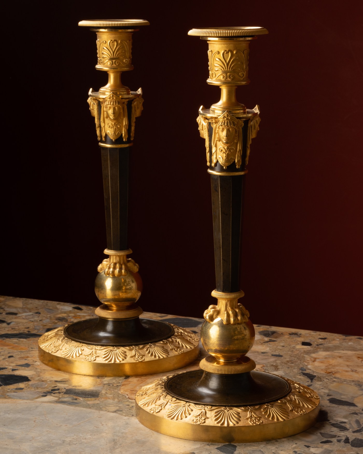 The only elements likely to have remained intact — the claw feet and the patinated eight-sided shaft — are identical to those of the present pair, whose chasing even surpasses that of the original parts of the Galle-delivered example. The antique-style female masks, though absent from the Grand Trianon candlesticks and unmentioned in the 1810 order, do appear on other known works by Galle and represent a rarer ornamental variant.