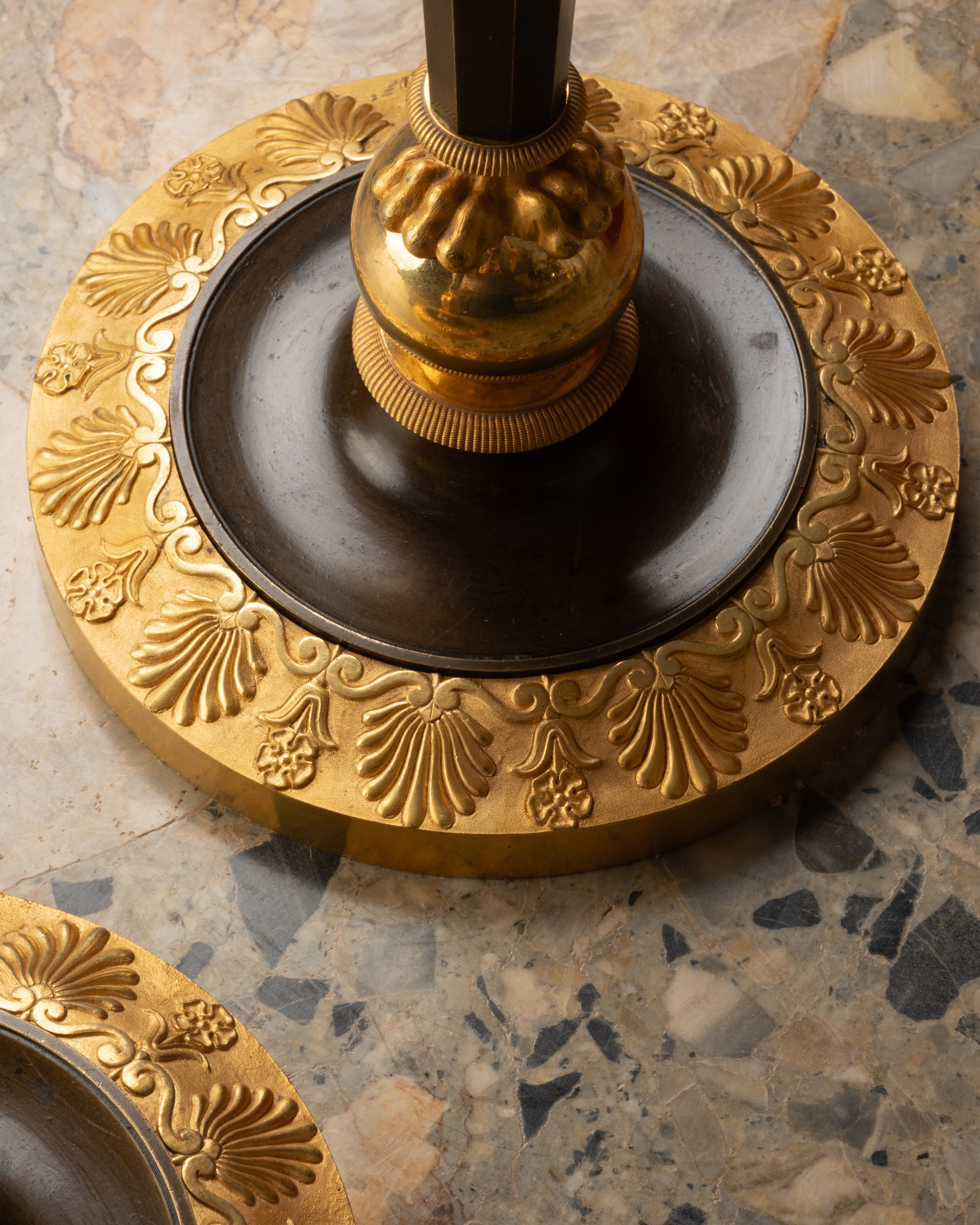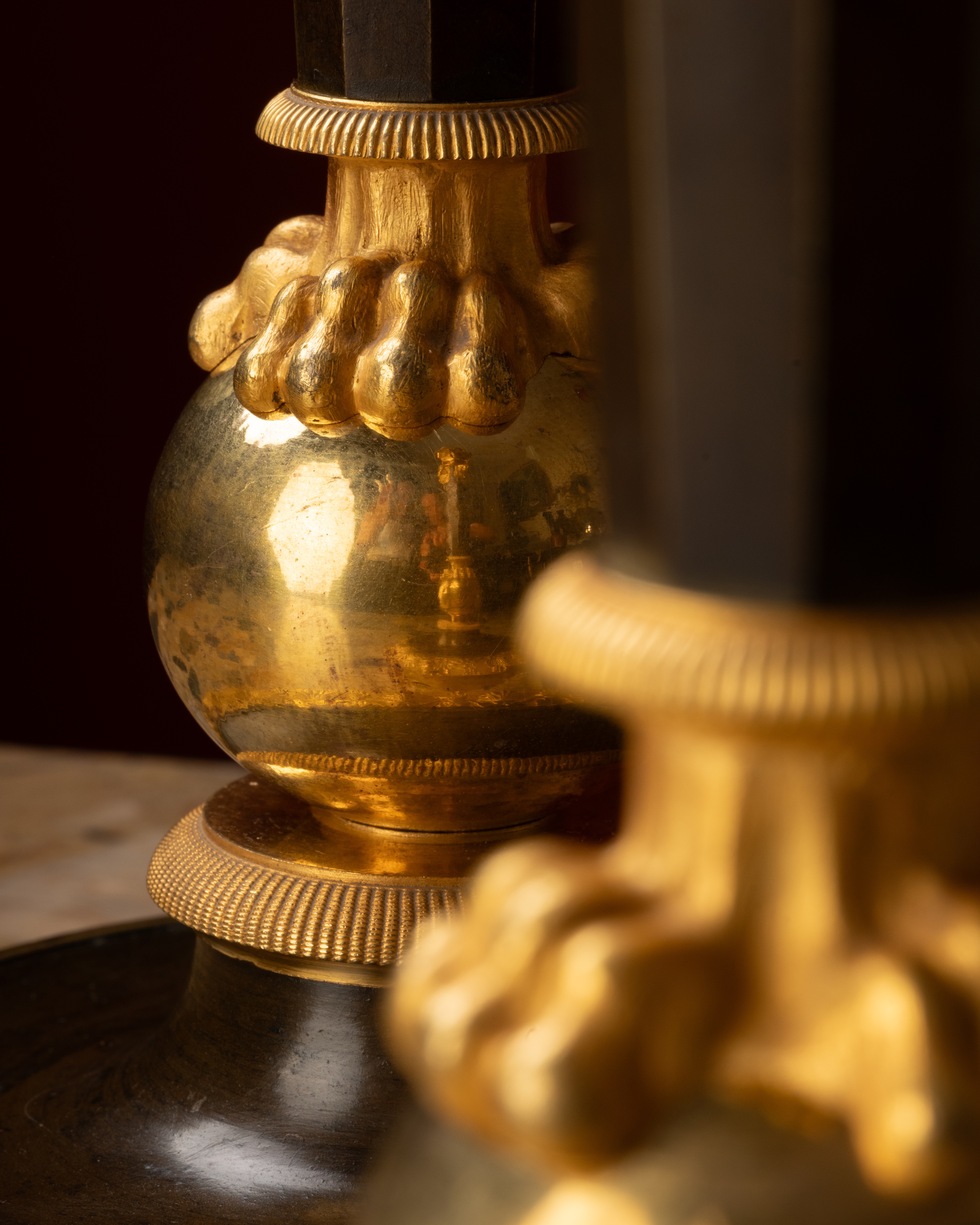A comparable model, with a hexagonal shaft, had in fact been delivered by Ravrio to the Garde-Meuble in 1809. Anne Baylet, citing a pair acquired through the merchant Darrac for the apartments of Empress Marie-Louise of Austria at the Palais Rohan in Strasbourg, observes : “Candlesticks, with plain or faceted shafts like these, carried by paw feet, were produced in many variants. This is a simple model, generally not selected for the Empress’s personal apartments, which were typically reserved for more exceptional pieces.”