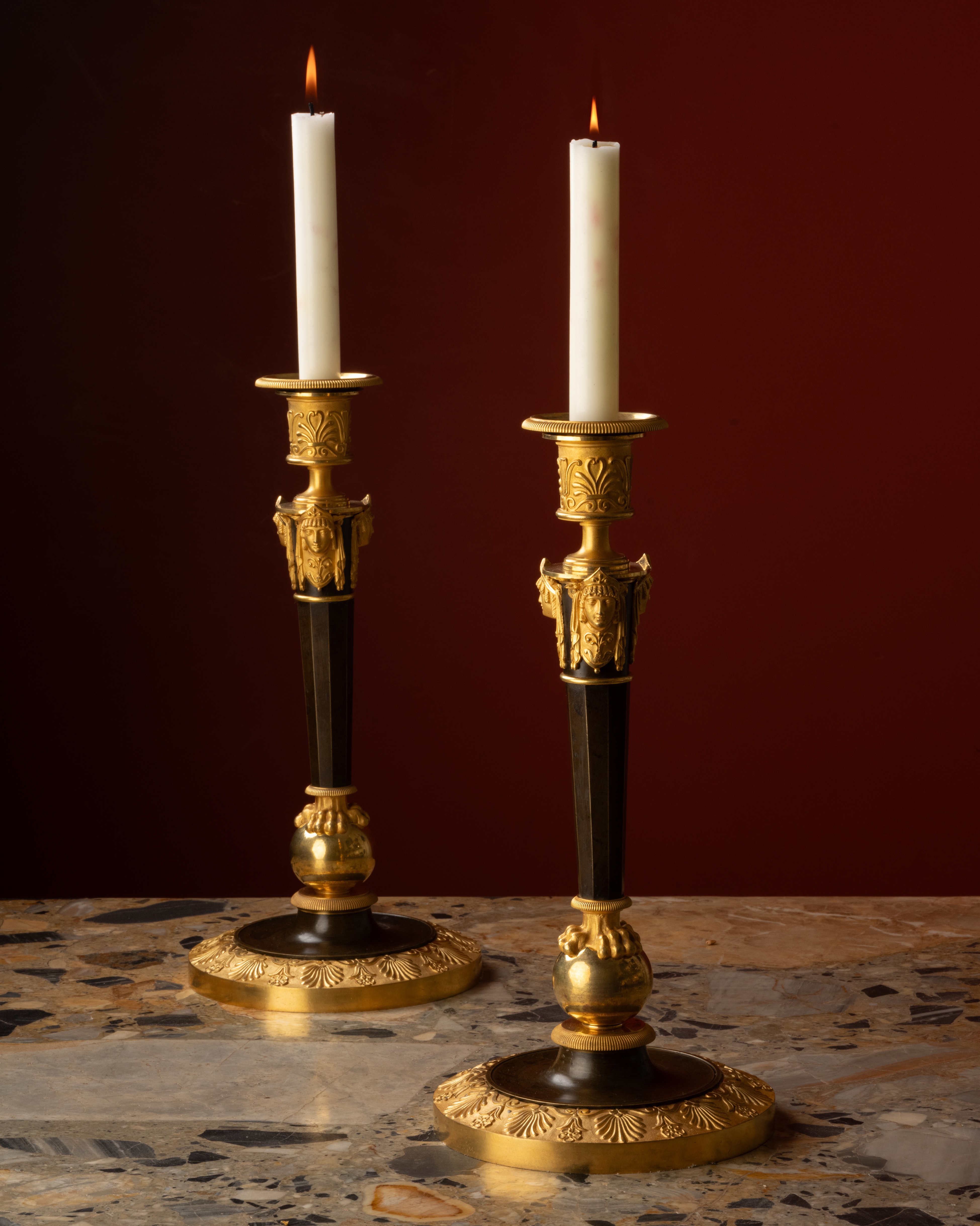 The only elements likely to have remained intact — the claw feet and the patinated eight-sided shaft — are identical to those of the present pair, whose chasing even surpasses that of the original parts of the Galle-delivered example. The antique-style female masks, though absent from the Grand Trianon candlesticks and unmentioned in the 1810 order, do appear on other known works by Galle and represent a rarer ornamental variant.