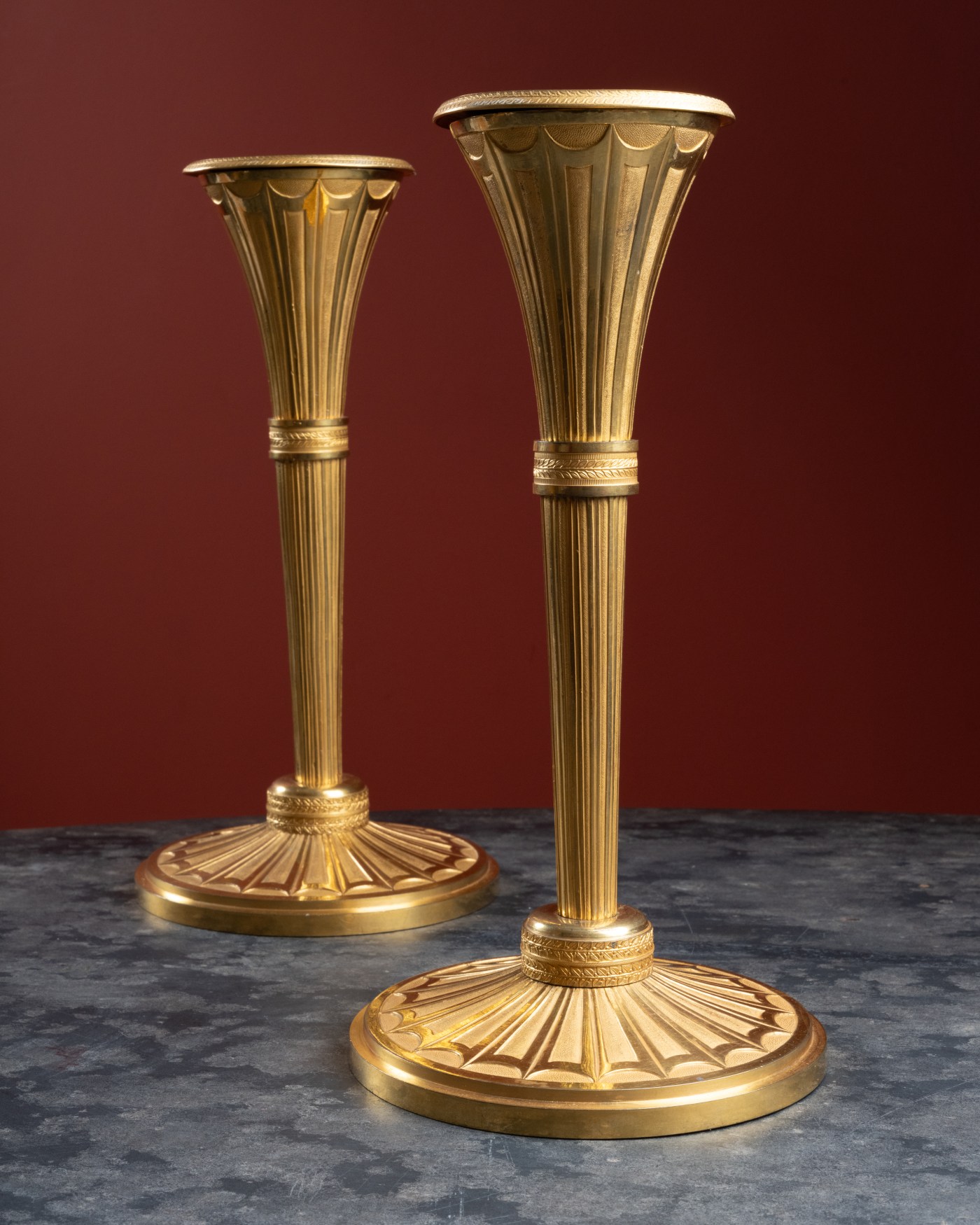 This pair of neo-classical gilt and chiseled bronze candlesticks is remarkable for the curve of its quiver-shaped stem and the simplicity of its ornamentation. Both the base and the stem are adorned with simple stylized flutes, while the bell separating the base from the stem and the ring marking the beginning of the quiver are decorated with a frieze of similarly stylized leaves à l’Antique, which is also found on the crowning of the candlesticks. Remarkable too because of their craftsmanship, especially the quality of their chasing, alternating between matte and shiny surfaces along the stem.