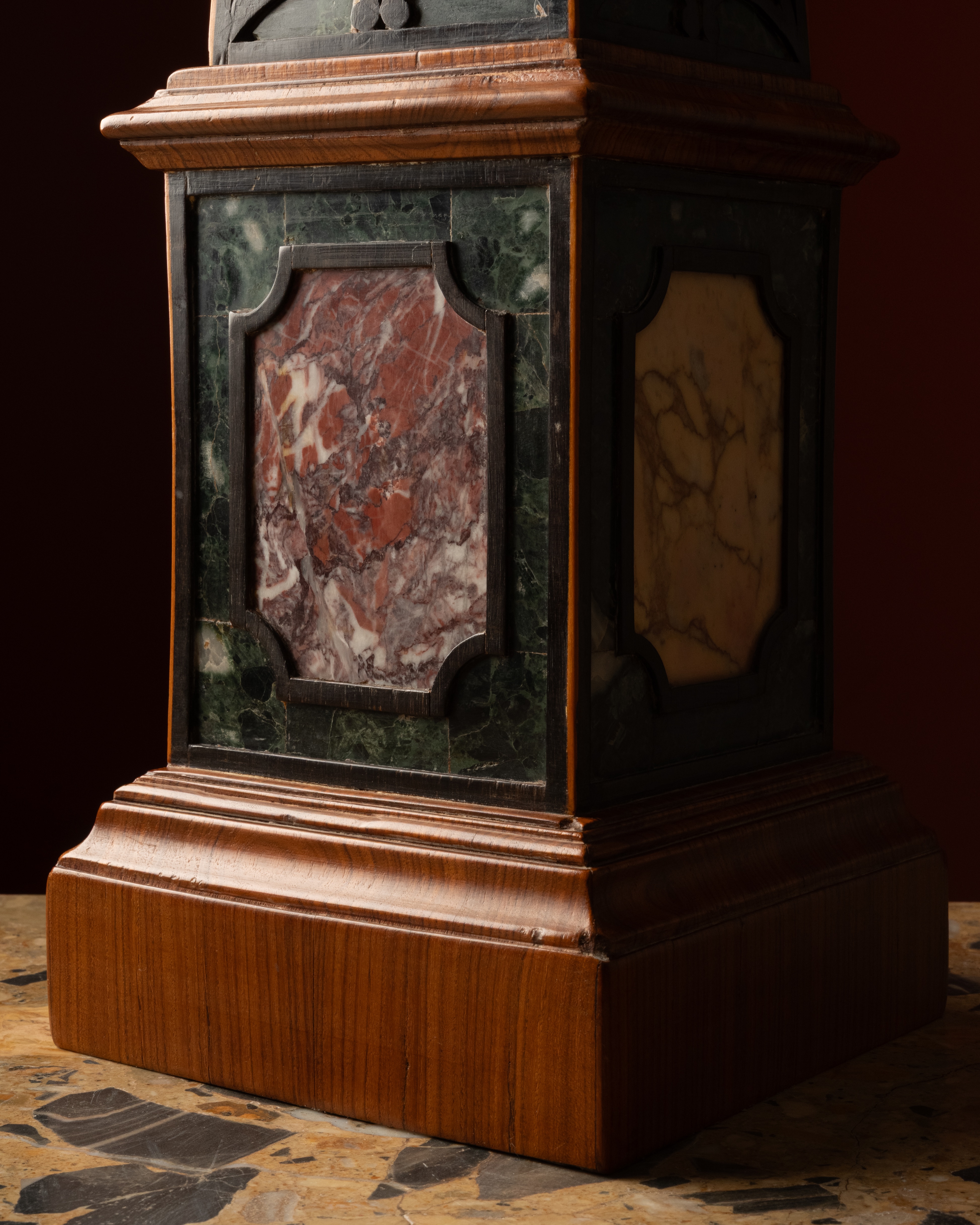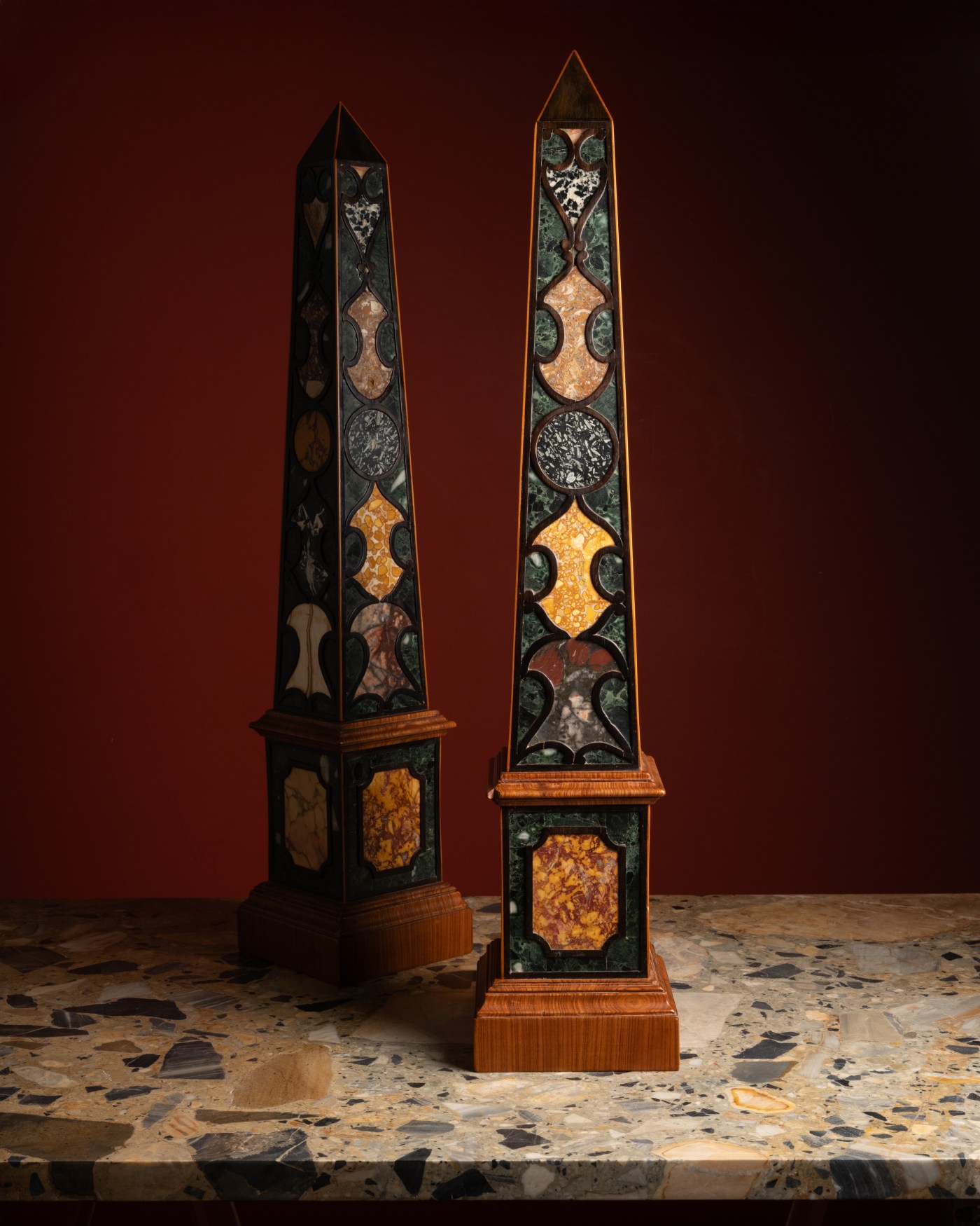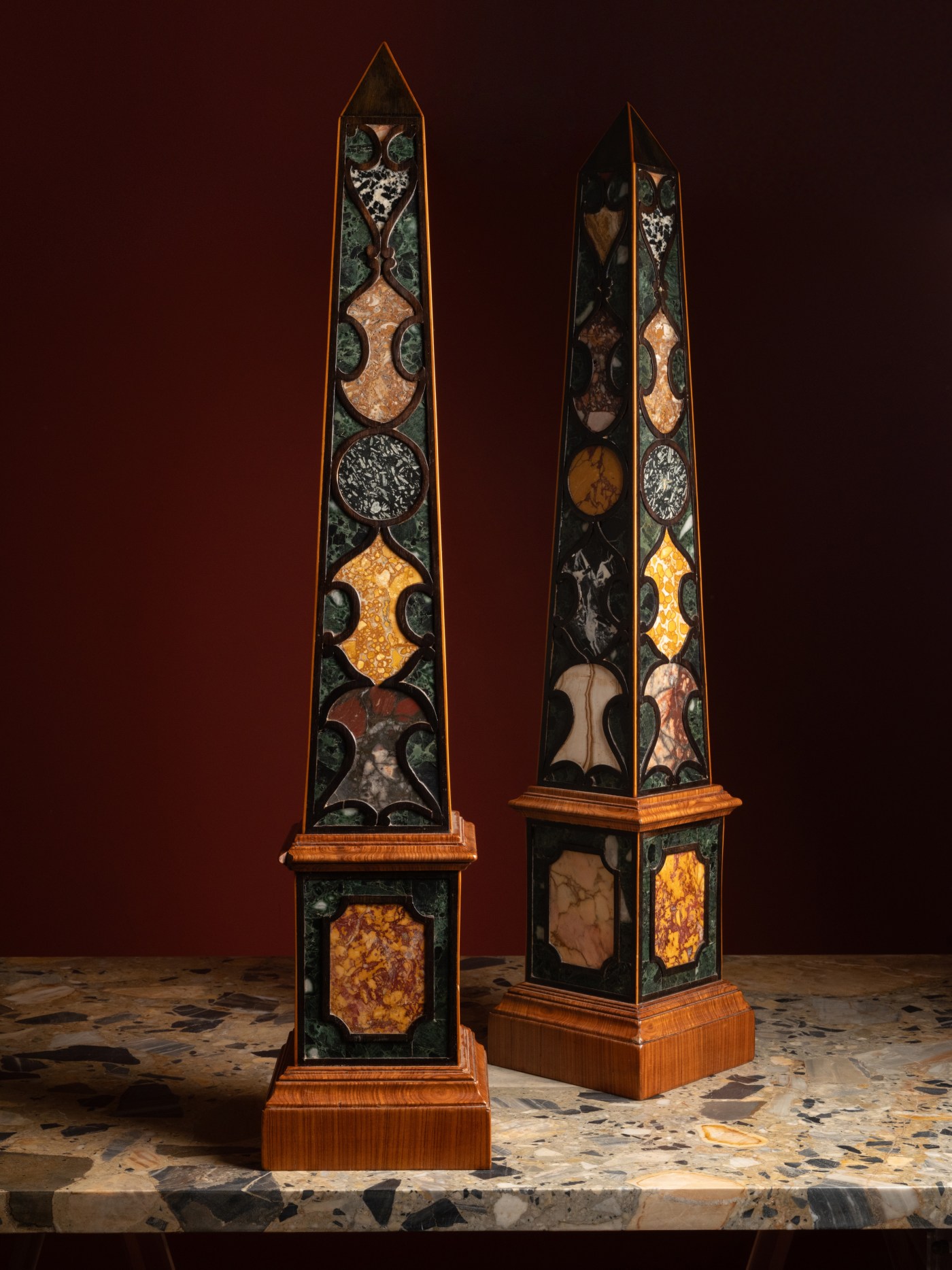 A similar pair of obelisks, inlaid with pietre dure, was indeed designed and installed by Mongiardino in the Zanussi apartments in Milan in the late 1970s. The present pair — inlaid with marble, breccia, granite, porphyry, and alabaster — stands apart from other known Mongiardino obelisks by its construction in natural varnished wood, only partially heightened with black: a variation on Mongiardino’s more common obelisks, which are typically executed entirely in ebonised wood.