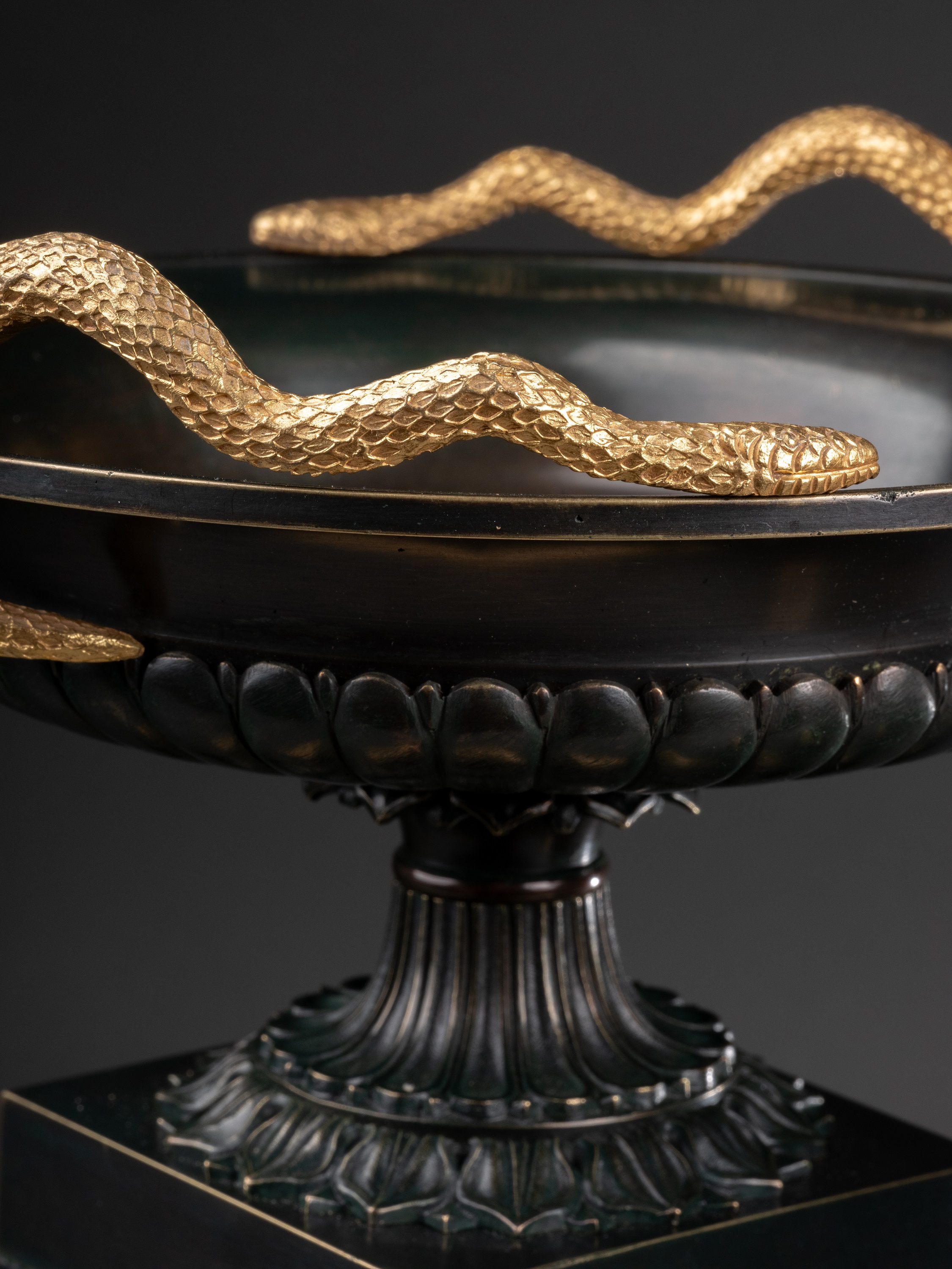 Pair of snake cups. Ormolu, patinated bronze and Maurin green marble. Restoration period, circa 1830.