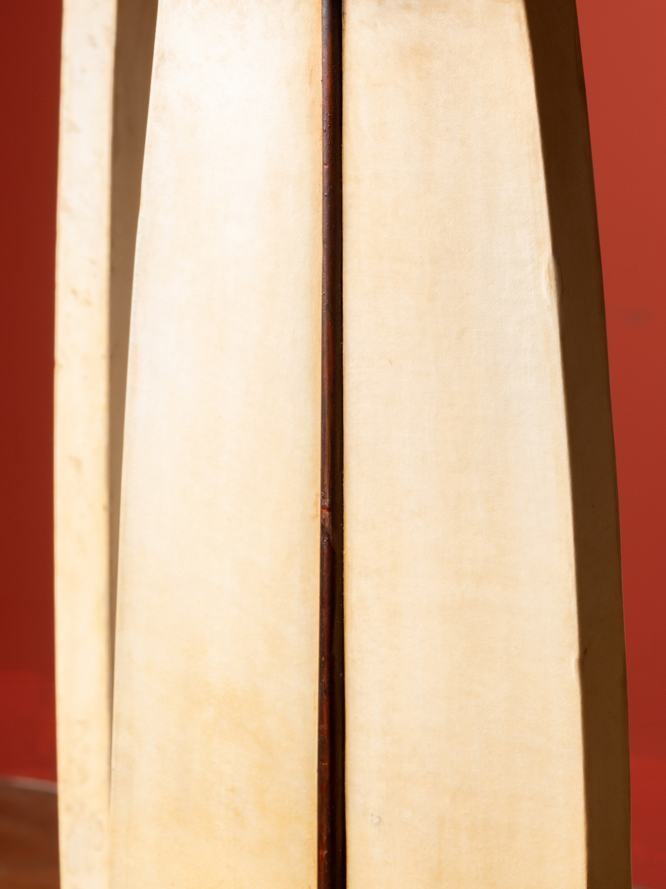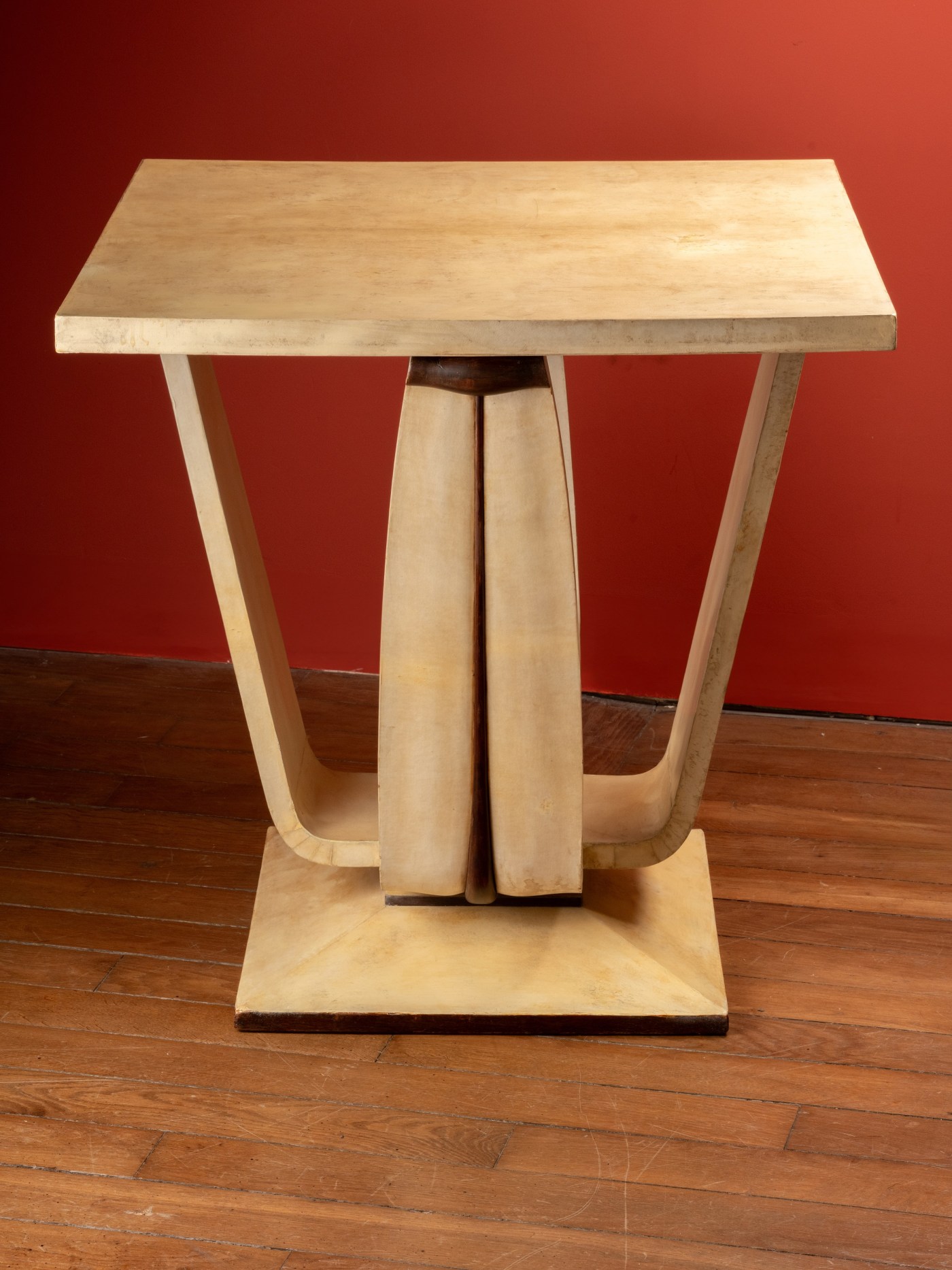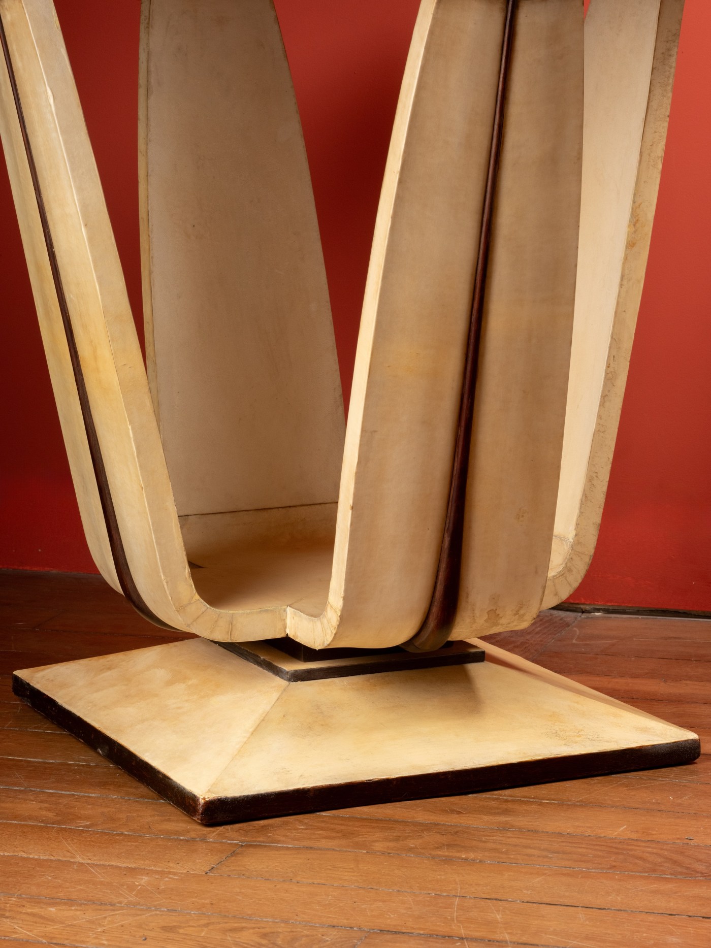 In a period that saw the development of functionalism, André Arbus' work remained perfectly classical, continuing a tradition championed by Süe et Mare, Ruhlmann, Leleu and others. This furniture, with its rigorous but not heavy lines, is reminiscent of the most pared-down Louis XVI models and bears witness to a strong influence of neo-classicism. This table is perfectly in keeping with Arbus's work in the 30s and 40s on parchment, a noble material par excellence, highlighted by the artist's sober work, comparable to the parchment-covered daybed illustrated in Kjellberg, P. (2000). Art Déco: Les maîtres du mobilier - le décor des paquebots. Les éditions de l'amateur. Our pedestal table combines the sharp edges of the top and foot with the curves of the base, which form a neoclassical plant scroll, as seen on the dining table illustrated in the same book.