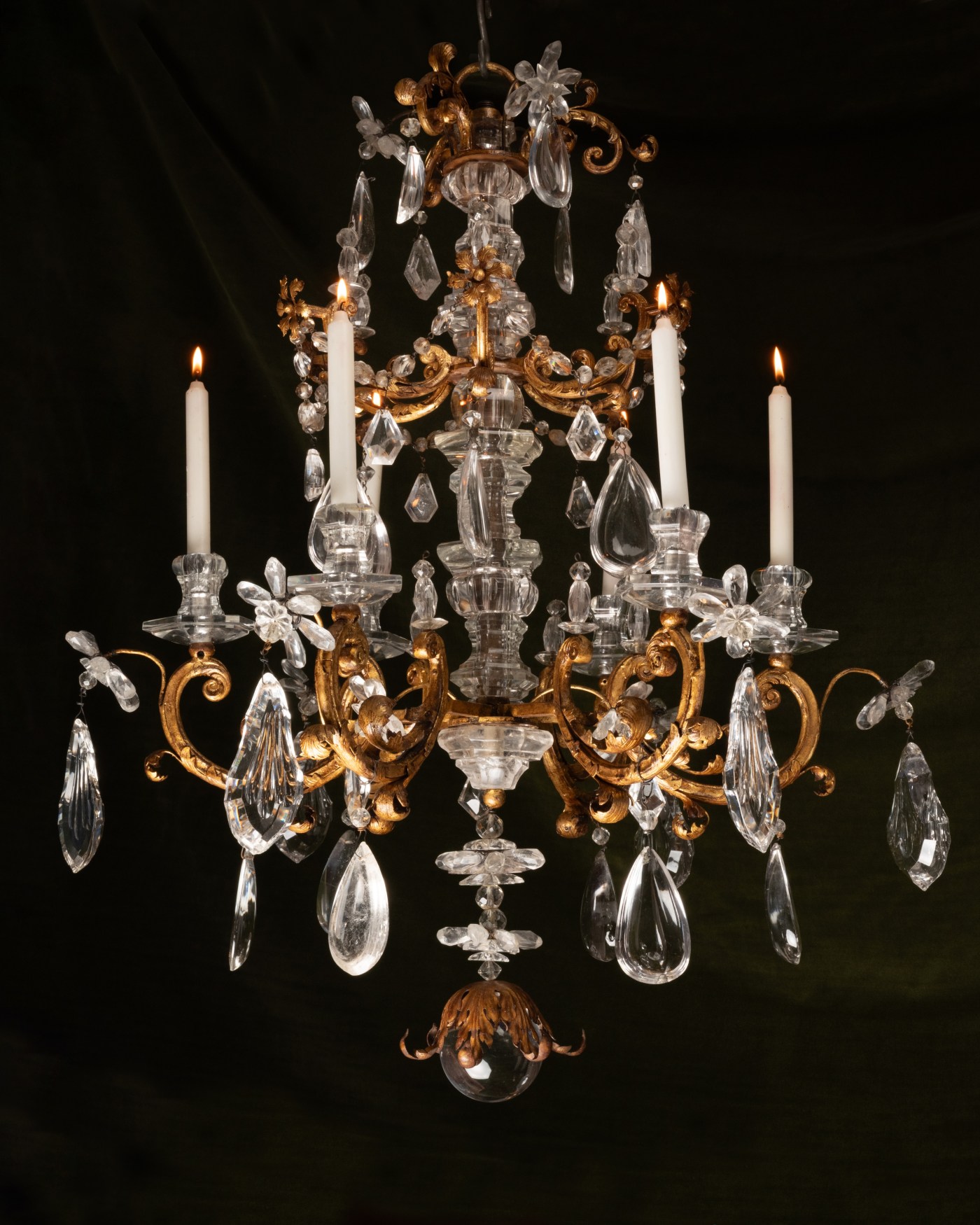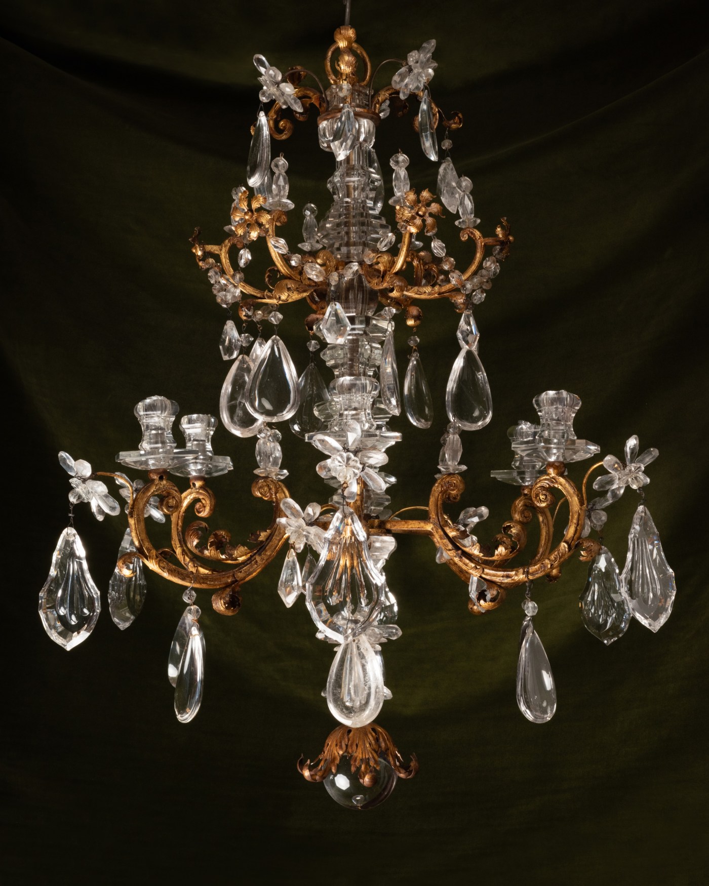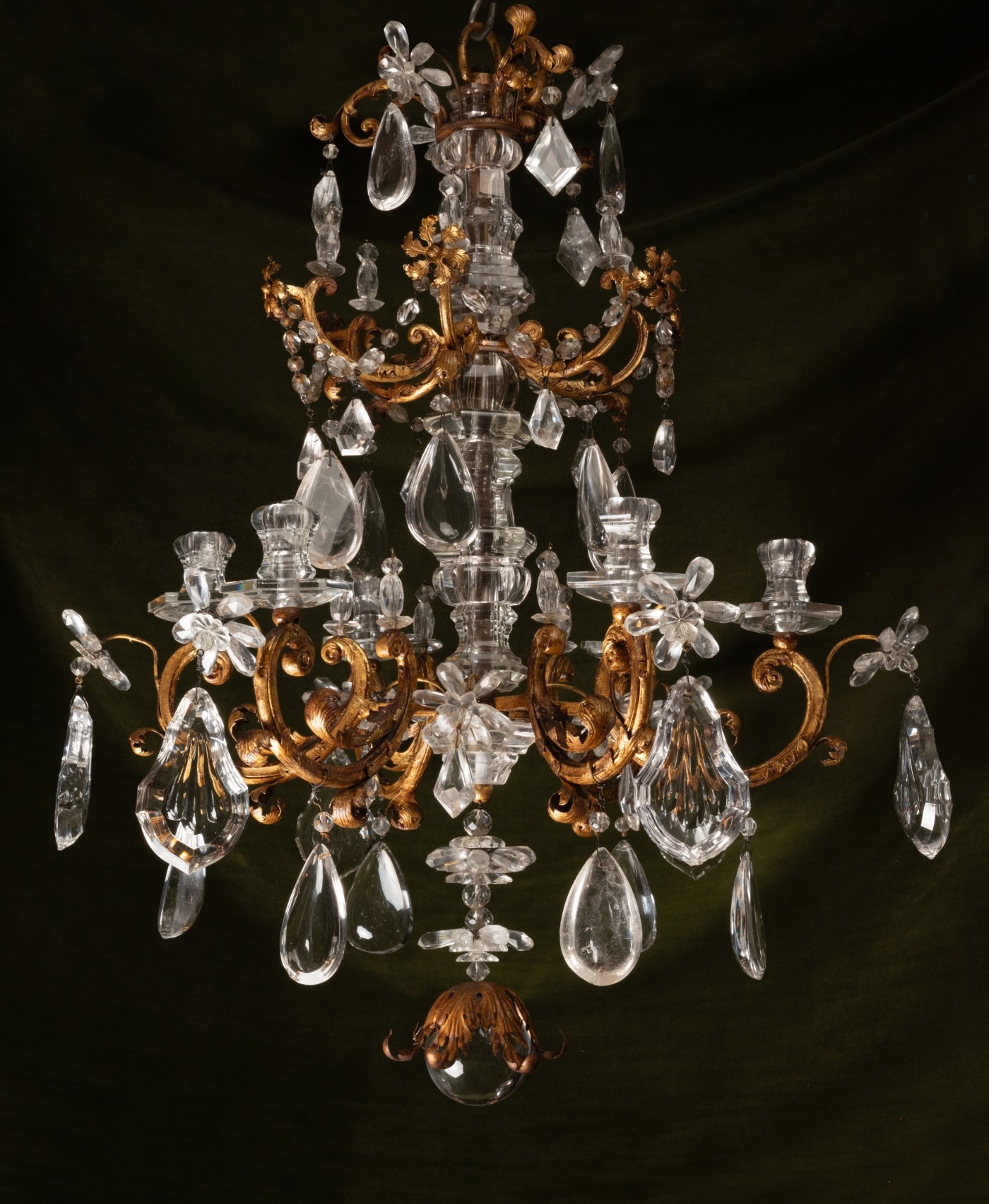 At least two known chandeliers present a comparable structure. The first, a twelve-arm chandelier housed in the Metropolitan Museum, was executed using a technique similar to that of the present piece: the arms, decorated with gilt metal foliage, emerge from a baluster-shaped shaft in rock crystal, projecting first perpendicularly before curving sharply into voluted semicircles. The second chandelier, located in the Konferenzzimmer of the Hofburg in Vienna, is even closer: in addition to a similar structure, it features identical six-pointed star motifs in gilt metal, executed in the same manner as the foliage.