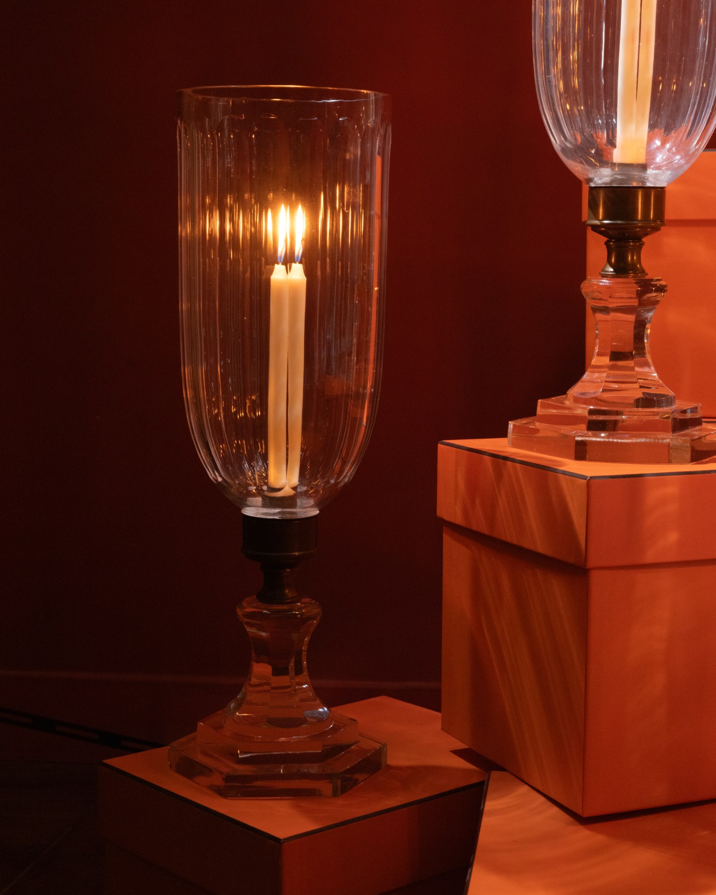 The hurricane glass is a glass shade meant to be placed on a candle and prevent it from being extinguished inside a room by drafts, or outside by the wind. It was therefore very convenient to light up garden lounges before the widespread use of electricity, and as many things that were deemed convenient before the industrial revolution, it remained in use, but as a luxurious item.