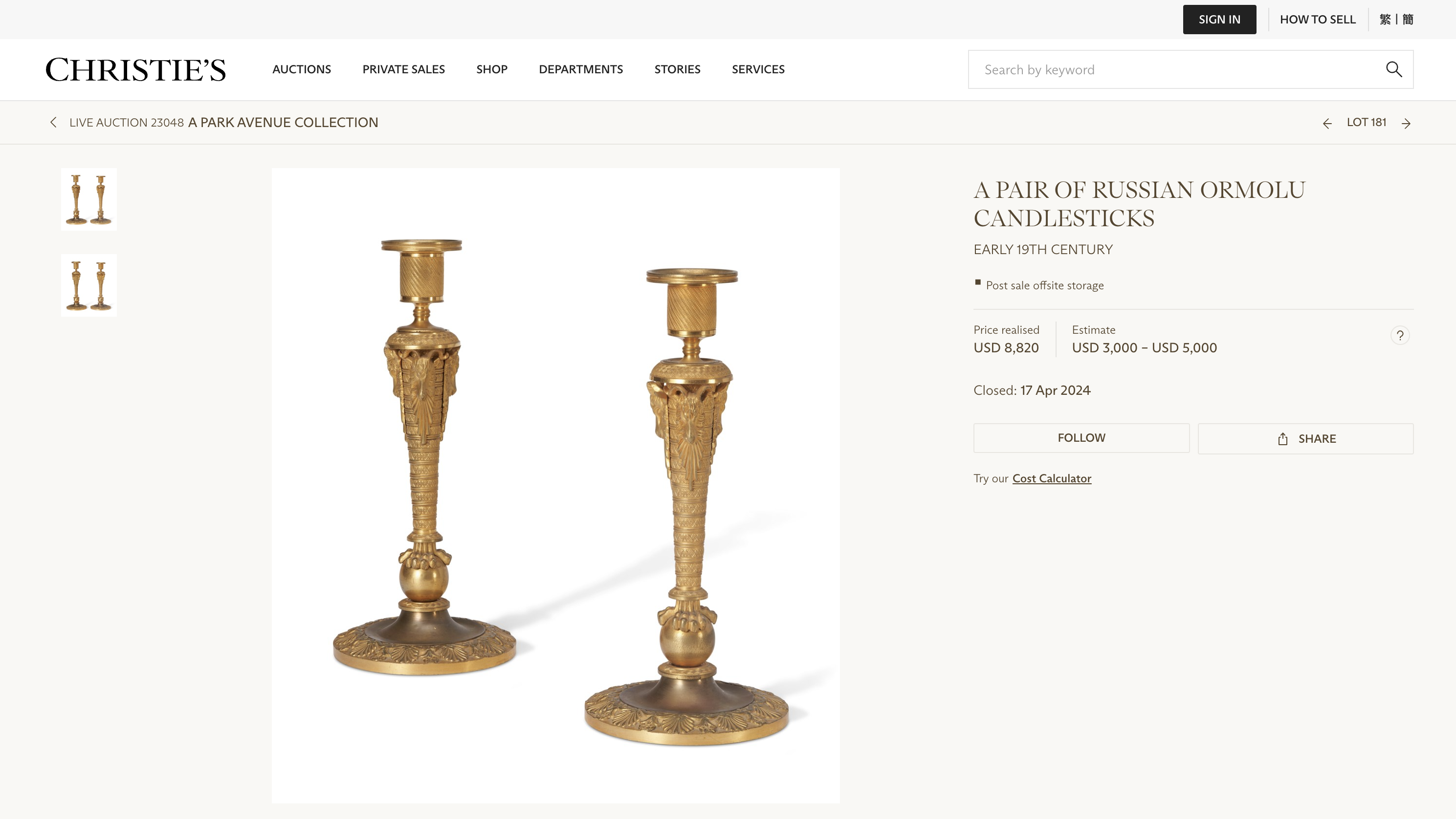 These candlesticks are part of a group of decorative bronzes associated with Moscow productions from the early 19th century. An identical pair is located at Arkhangelskoye, near Moscow, in the Prince’s Study, decorated between 1810 and 1820 with a suite of Karelian birch furniture adorned with ormolu mounts.