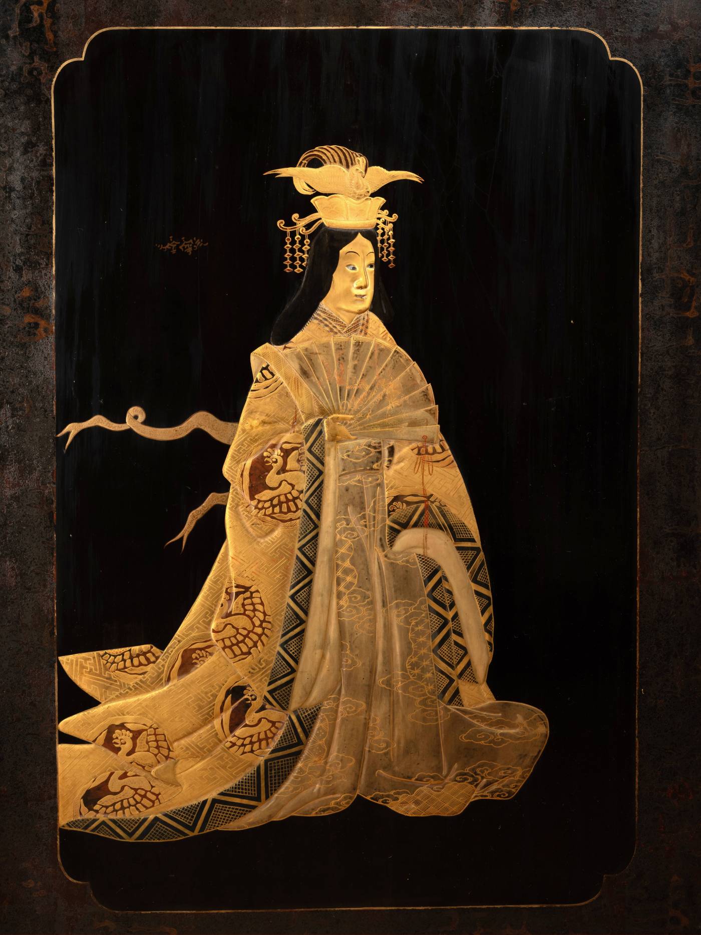 The interior of the screen, on the other hand, features two large figures in takamaki-e (高蒔絵), a lacquer technique with a higher relief than hiramaki-e. The costume and gestures of these characters, particularly the folded command fan held by the male figure, indicate a high rank in Japanese nobility. The combination of heraldic symbols (mon 紋), confirming this rank, signifies an alliance between the Kuyo, Maeda, Ashikaga, Maeda, Shimazu, and Tokugawa clans. These heraldic signs collectively seem to reference the 1603 marriage of Maeda Toshitsune and Tamahime, daughter of Hidetaka Tokugawa.