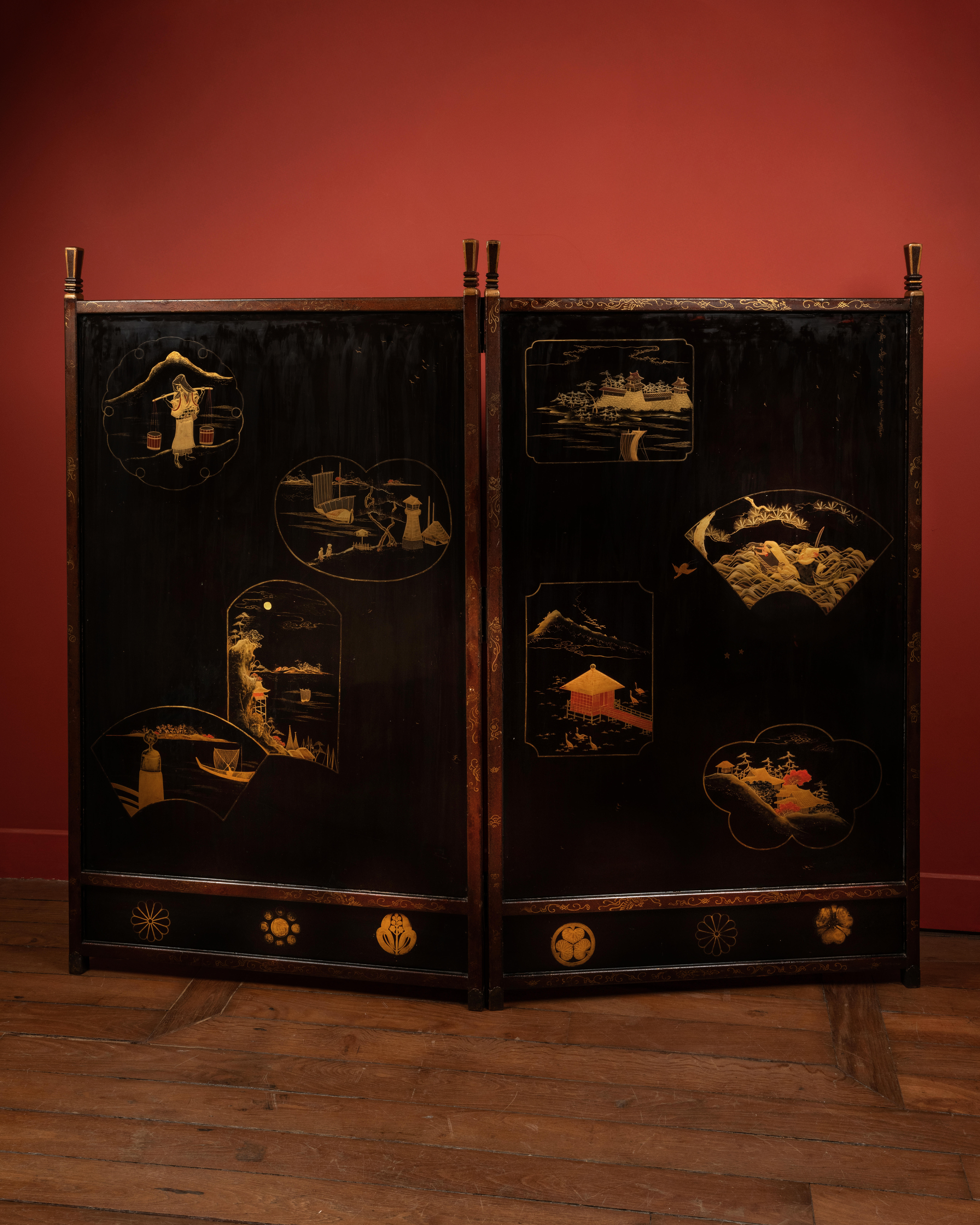 This two-panel screen, or byôbu (屏風), is decorated, on one side, with scenes and landscapes inspired by the hiramaki-e (平蒔絵) lacquered lids of suzuribako (硯箱) or tabikushibako (旅櫛箱), the writing or makeup boxes of the Edo period, particularly those of Kanyōsai.
