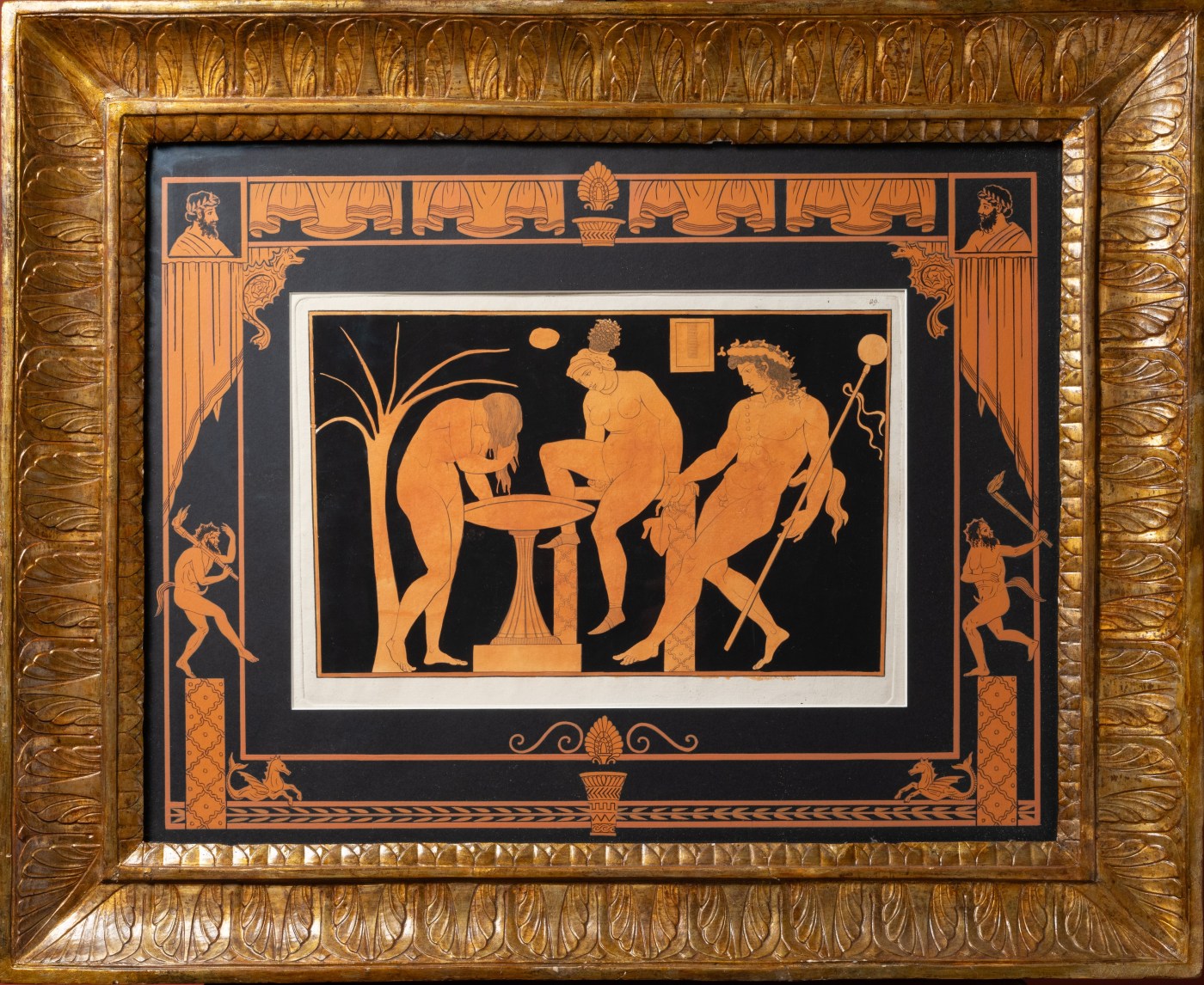 A watercolor-enhanced engraving depicting two women washing their hair and bodies by drawing water from a basin (louterion), while a Satyr looks at them, in the nude and bearing Dionysian symbols. The subject is indeed identified as Two women washing in the presence of a Satyr by the distinguished archaeologist and philologist Salomon Reinach, member of the École française d’Athènes, curator of the Musée de Saint-Germain, and professor at the École du Louvre.