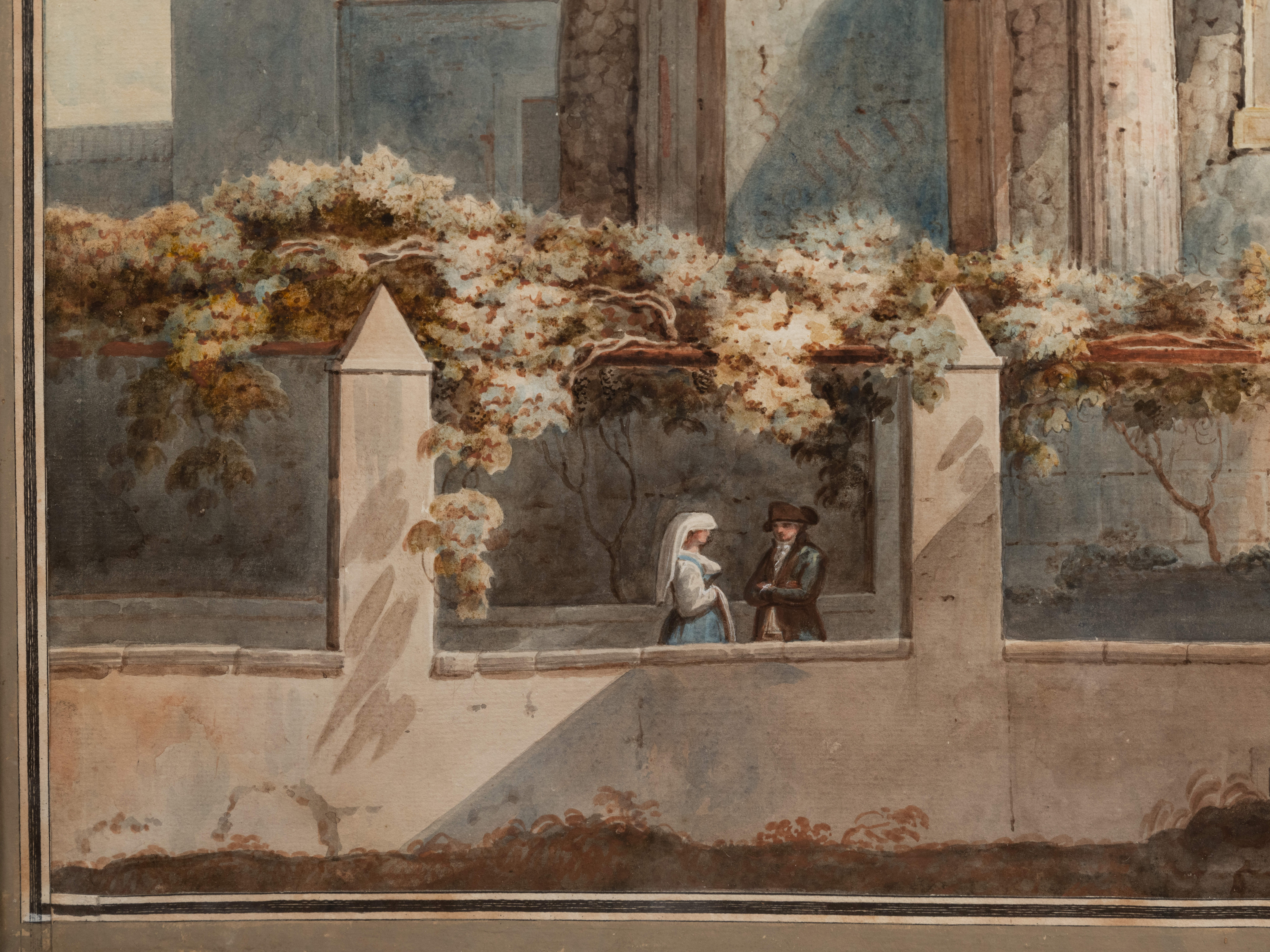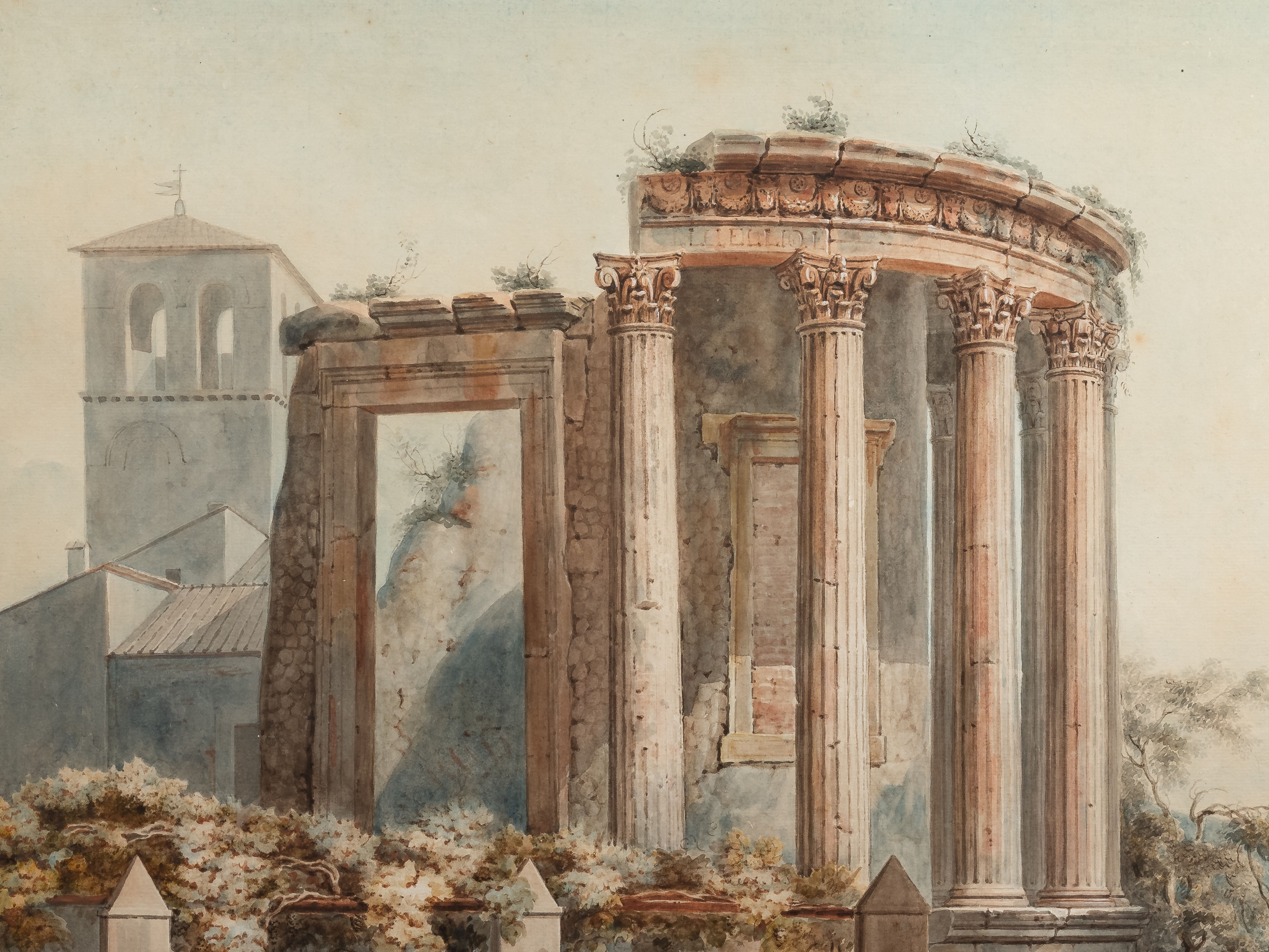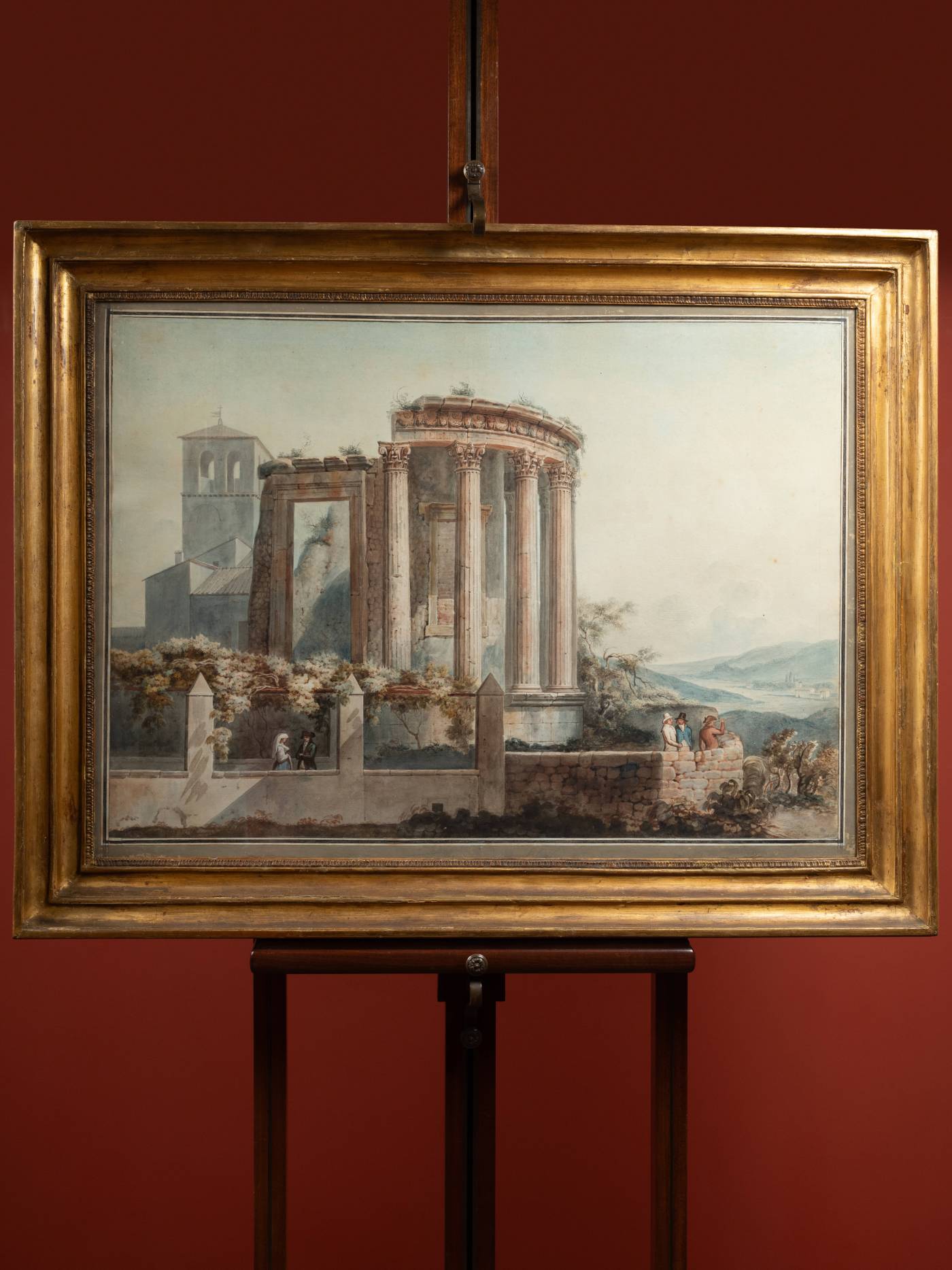 This watercolor depicting the Temple of Vesta in Tivoli, surrounded by figures in late 18th-century costumes, is part of a series of at least fifteen dispersed watercolors, though known through gouache copies preserved at the National Library of Spain and cataloged by Thomas Ashby. Another view from the same set, showing a different part of the Temple of Vesta, surfaced at a sale in 2011, bearing the number 5 on the reverse, which corresponds to gouache number 13 by Thomas Ashby.